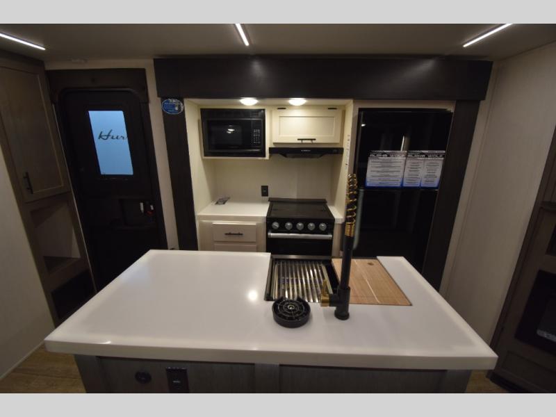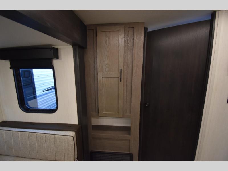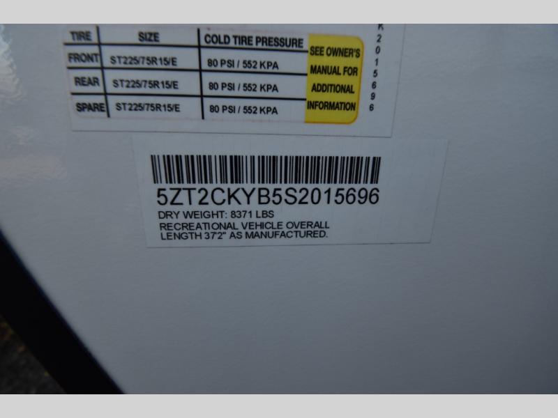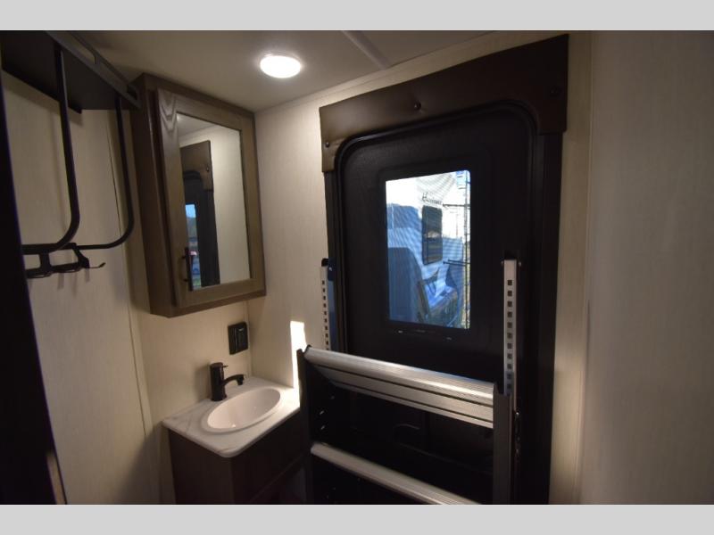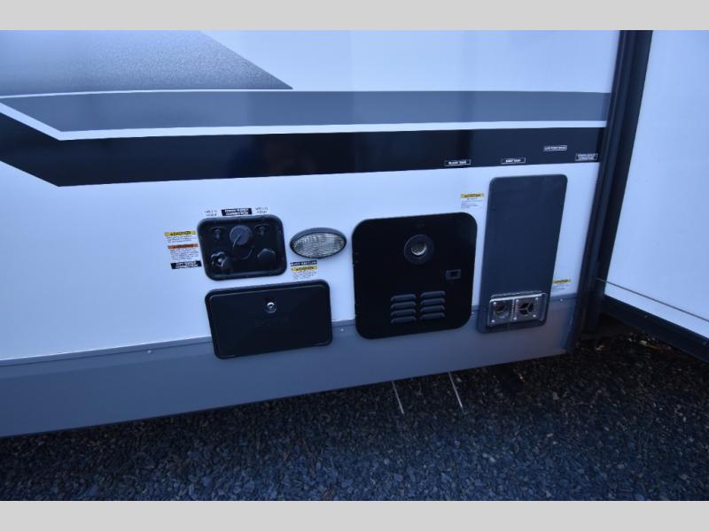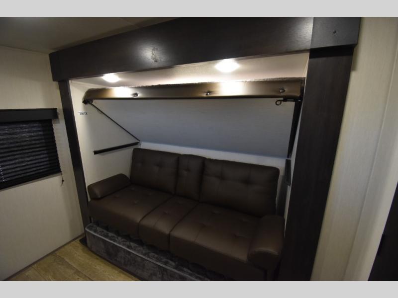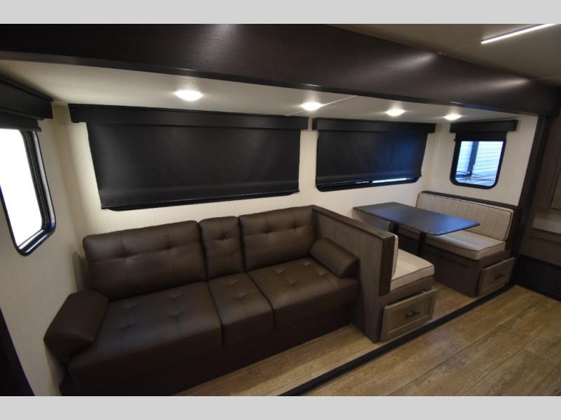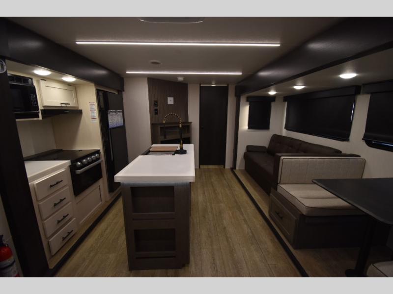 Load up your clothes, food, and outdoor gear to enjoy a long weekend away from the city in this travel trailer! There are triple slide outs, a private bunkhouse with a half bathroom with a second exterior entry/door for convenience, plus an outside kitchen, complete with ice! The bunkhouse also has two bunks, a jackknife sofa and a trundle bed, plus a slide out for more interior floor space. The main living and kitchen area is spacious as well with two opposing slides, a kitchen island with a large sink, a pantry, plus a cozy fireplace. The full walk-through bathroom allows double access, and the front bedroom allows you to sleep like royalty.