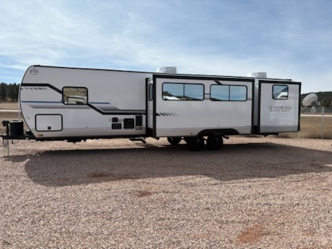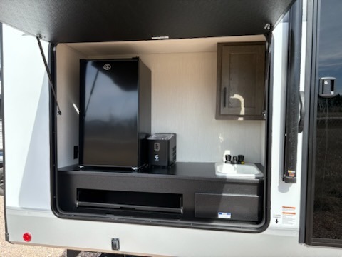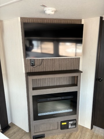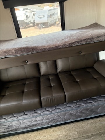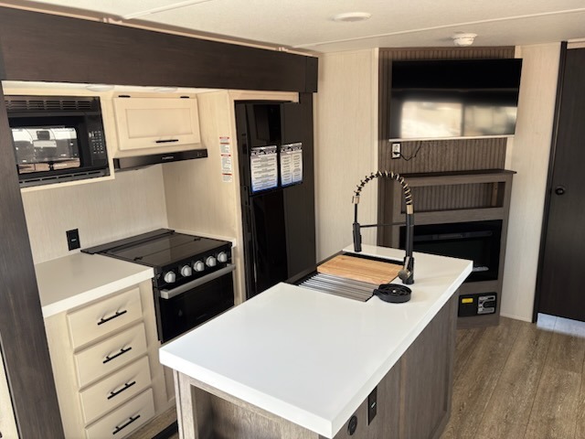 Load up your clothes, food, and outdoor gear to enjoy a long weekend away from the city in this travel trailer! There are triple slide outs, a private bunkhouse with a half bathroom with a second exterior entry/door for convenience, plus an outside kitchen, complete with ice! The bunkhouse also has two bunks, a jackknife sofa and a trundle bed, plus a slide out for more interior floor space. The main living and kitchen area is spacious as well with two opposing slides, a kitchen island with a large sink, a pantry, plus a cozy fireplace. The full walk-through bathroom allows double access, and the front bedroom allows you to sleep like royalty.