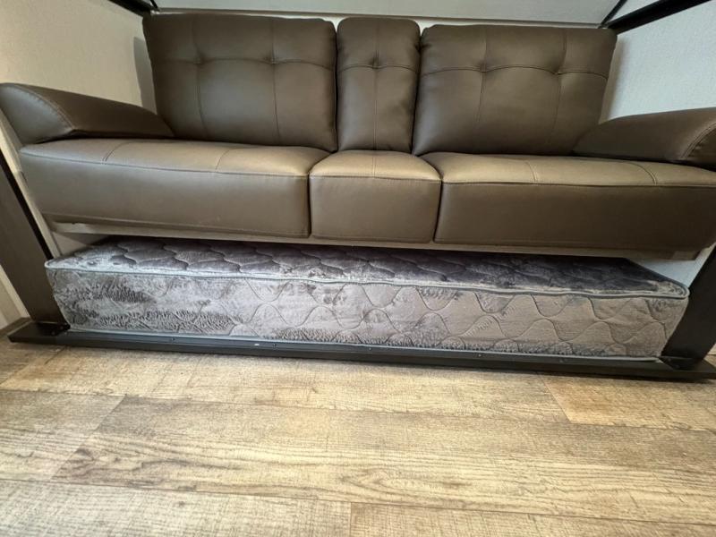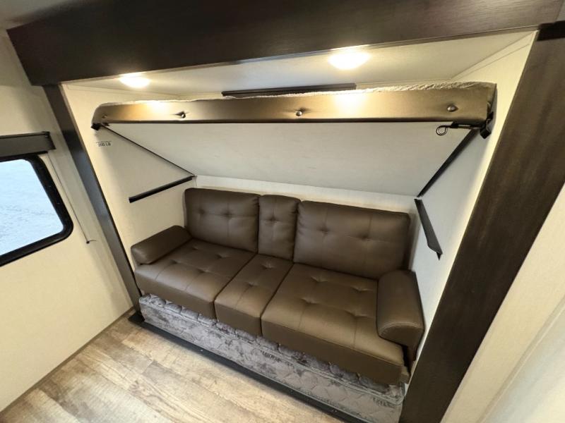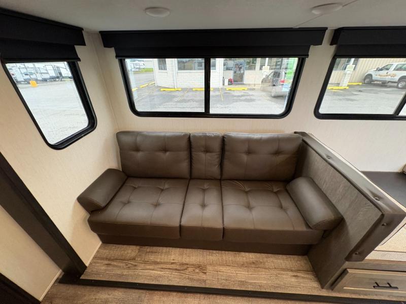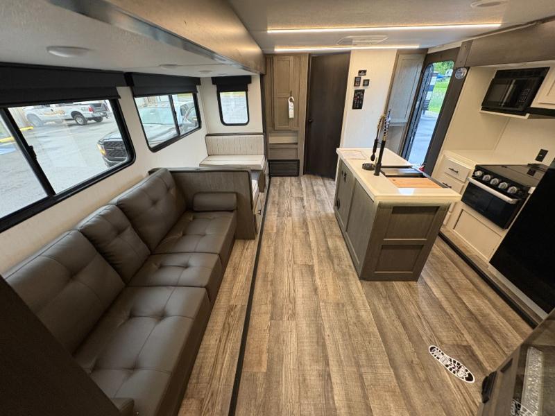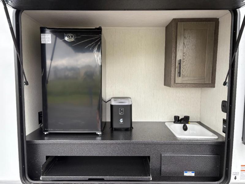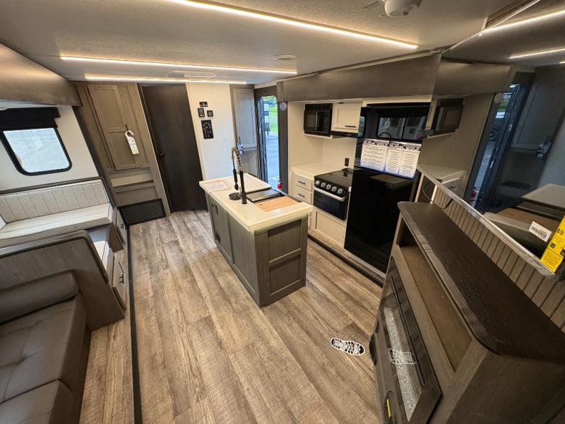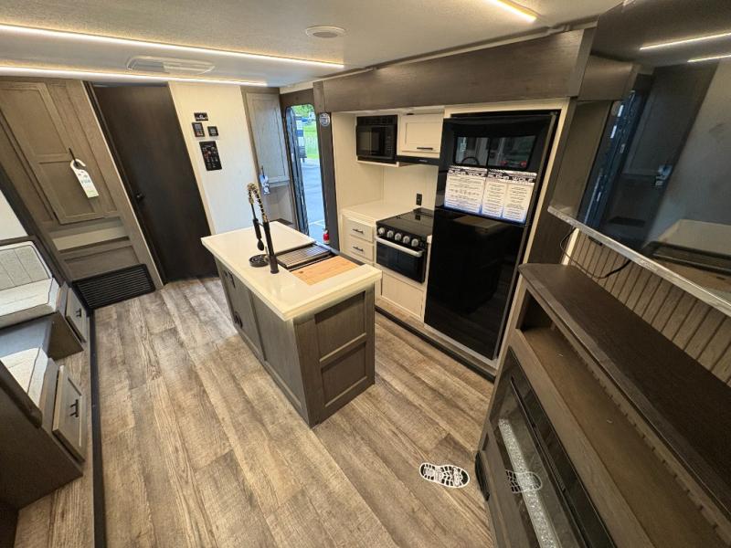 Load up your clothes, food, and outdoor gear to enjoy a long weekend away from the city in this travel trailer! There are triple slide outs, a private bunkhouse with a half bathroom with a second exterior entry/door for convenience, plus an outside kitchen, complete with ice! The bunkhouse also has two bunks, a jackknife sofa and a trundle bed, plus a slide out for more interior floor space. The main living and kitchen area is spacious as well with two opposing slides, a kitchen island with a large sink, a pantry, plus a cozy fireplace. The full walk-through bathroom allows double access, and the front bedroom allows you to sleep like royalty.