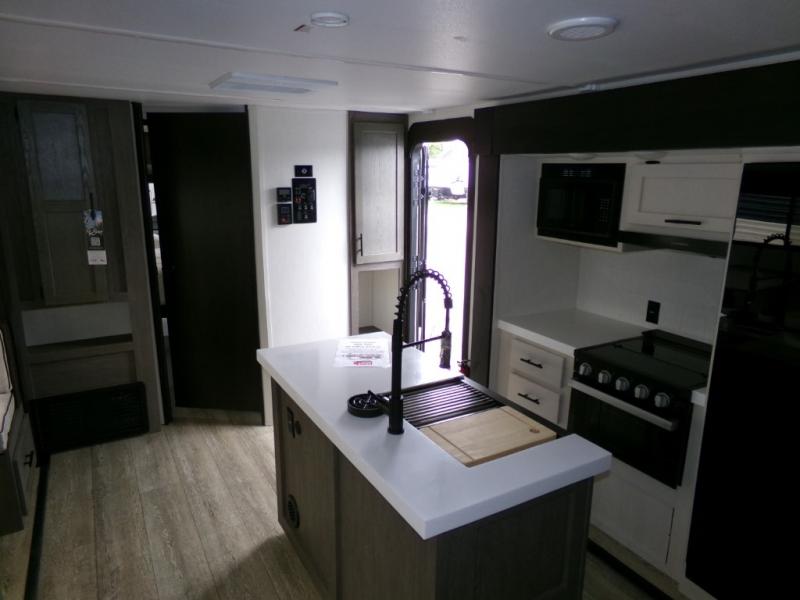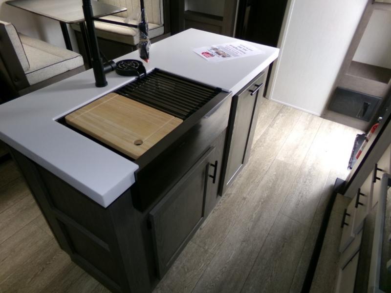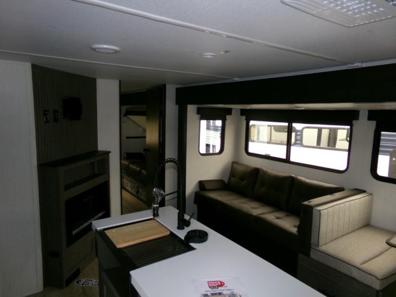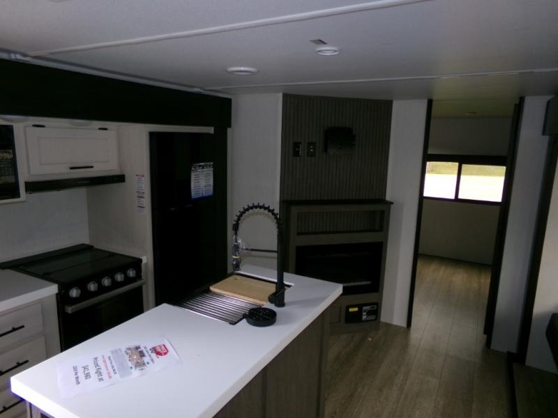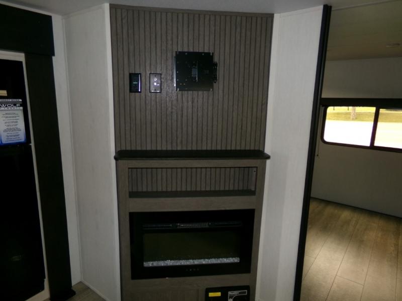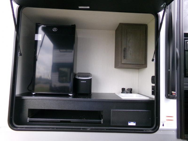 - Key Features: Bath-and-a-half, kitchen island with residential 12 V fridge, outdoor kitchen with fridge and sink, electric fireplace, dual entry doors, solid step entries, 100 W “Juice Pack” solar prep