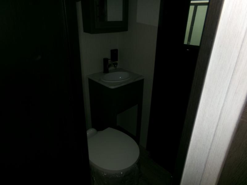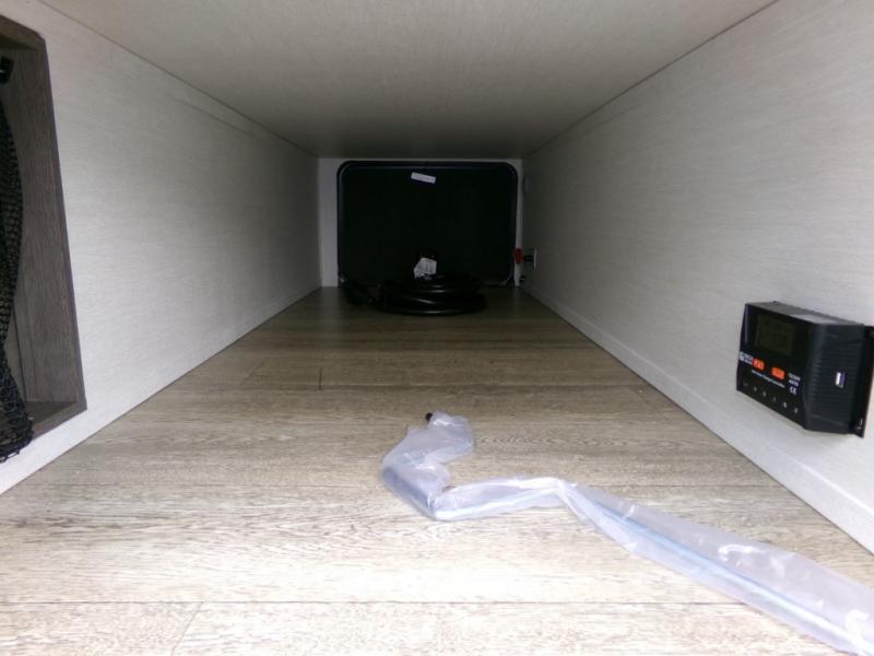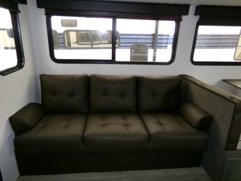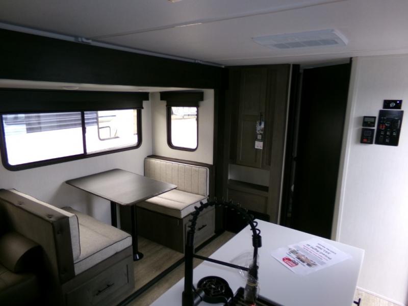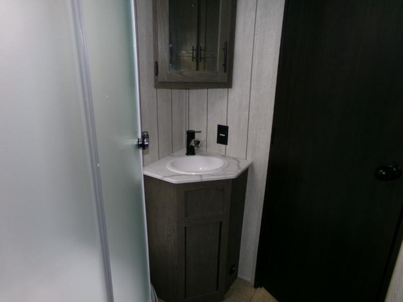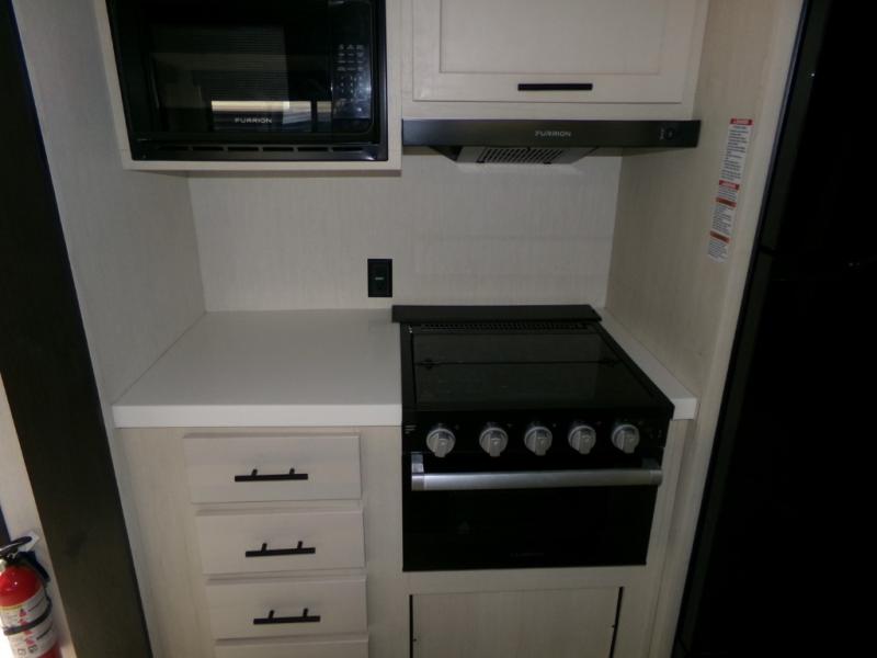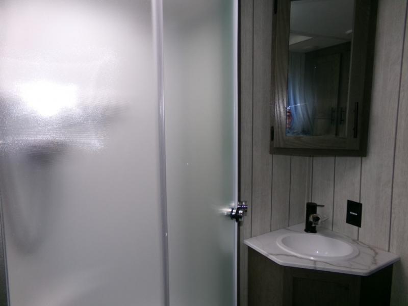 - Key Features: Bath-and-a-half, kitchen island with residential 12 V fridge, outdoor kitchen with fridge and sink, electric fireplace, dual entry doors, solid step entries, 100 W “Juice Pack” solar prep