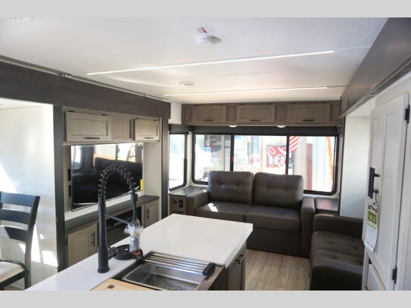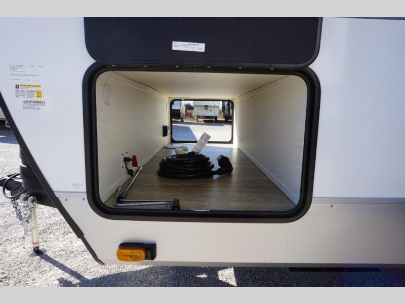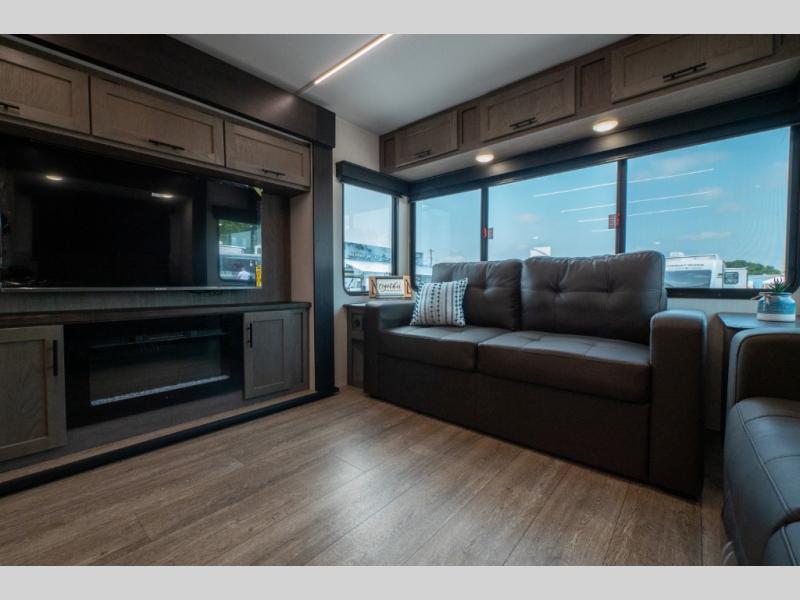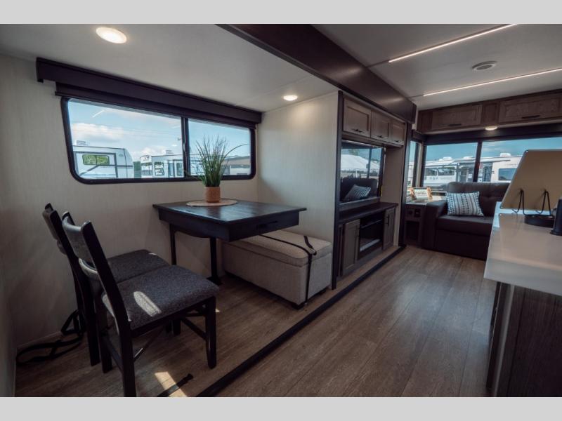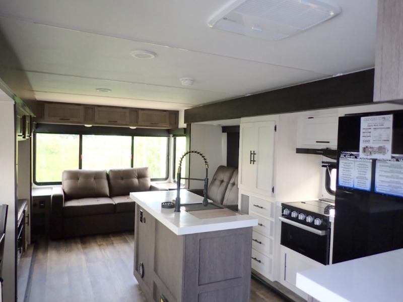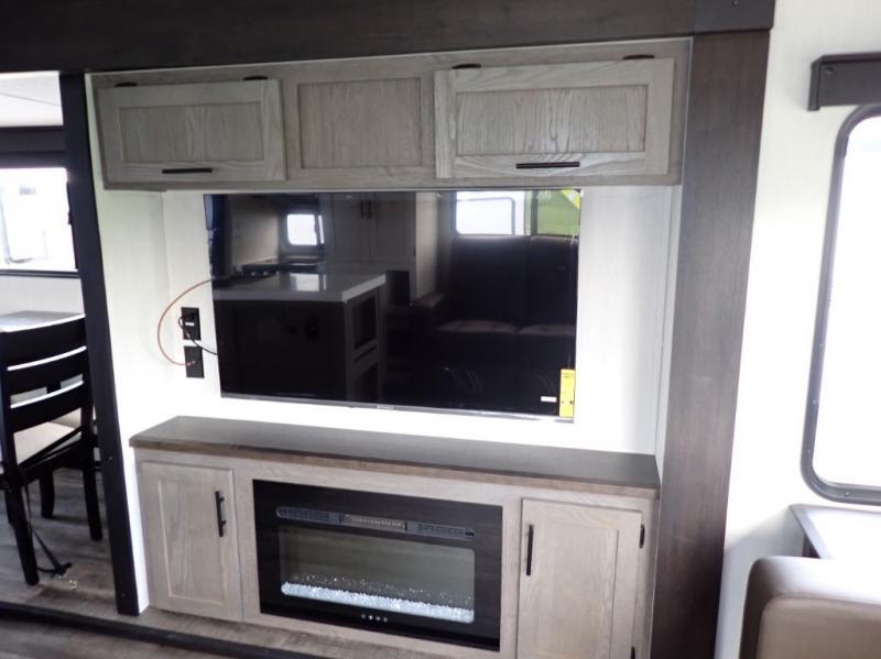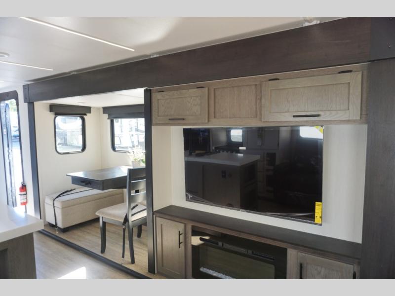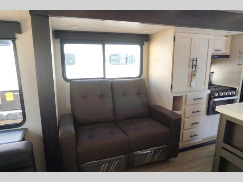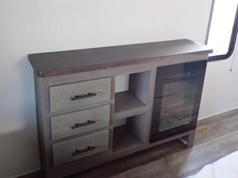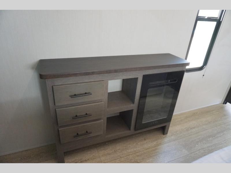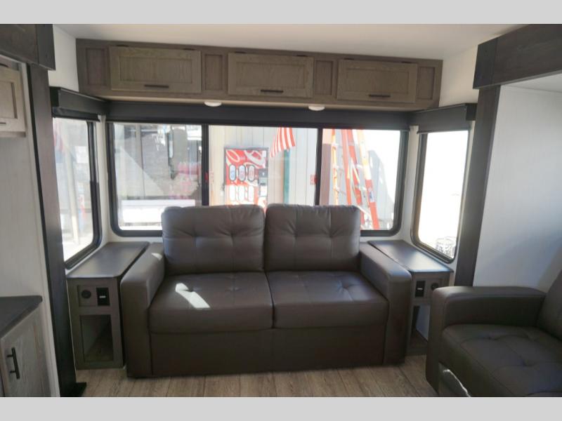 It will be so easy to find comfort in this travel trailer! The dual opposing slides in the combined kitchen and living room will create an open floorplan you are sure to love. There is a rear tri-fold sofa, theater seating across from an entertainment center, plus a table with chairs and a storage ottoman seat to keep games organized. The chef of your group will love having extra counter space provided by the kitchen island, and there is a hutch to keep nice dishes stored away. Up front, the private bedroom includes a king bed slide out, dual wardrobes and a dresser, plus a front sun bench where you can sit to pull your hiking boots on. There is even a wardrobe with washer and dryer prep if you choose to add those appliances!