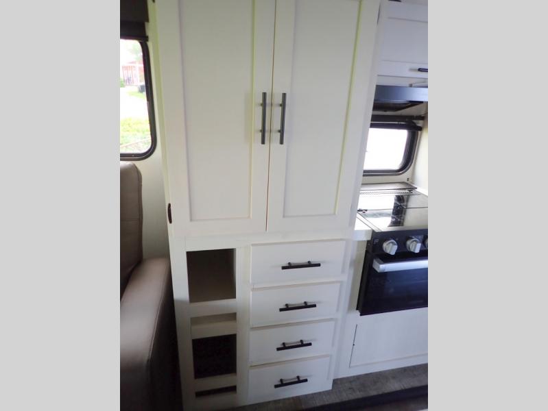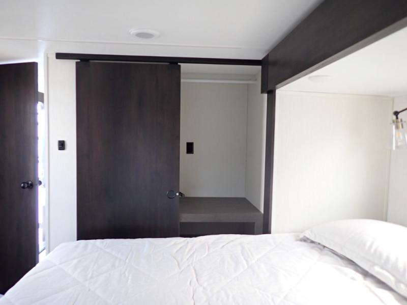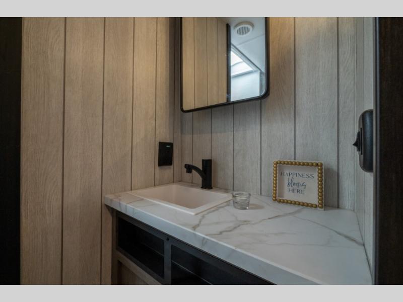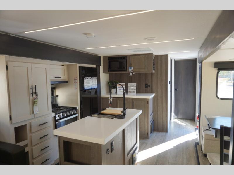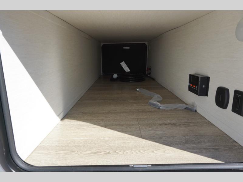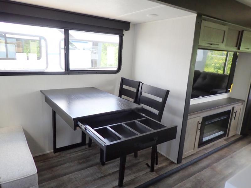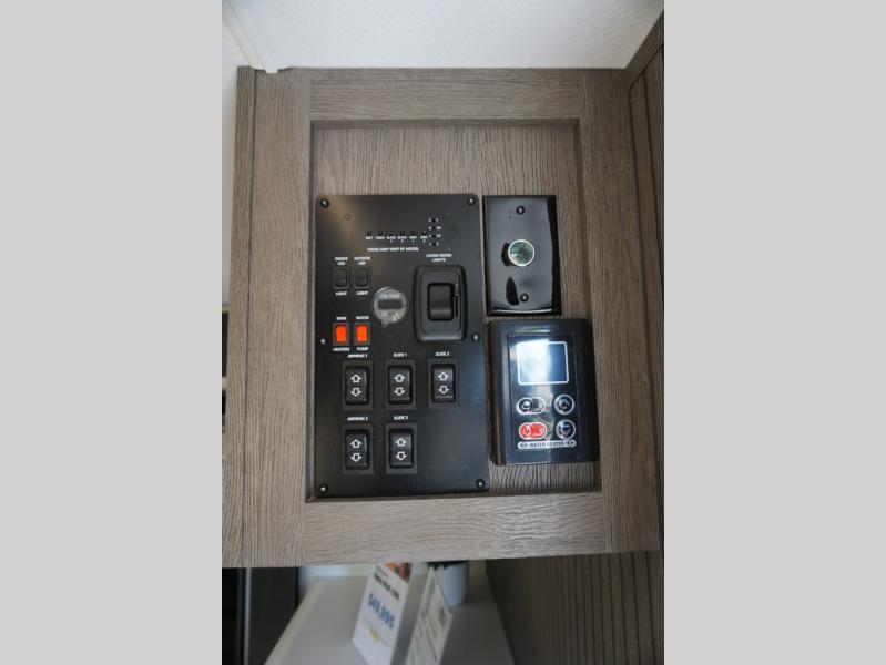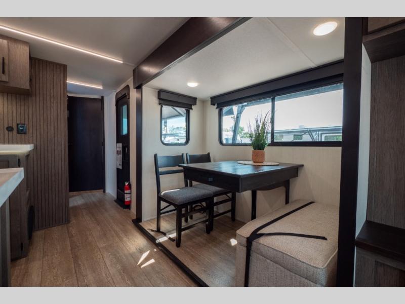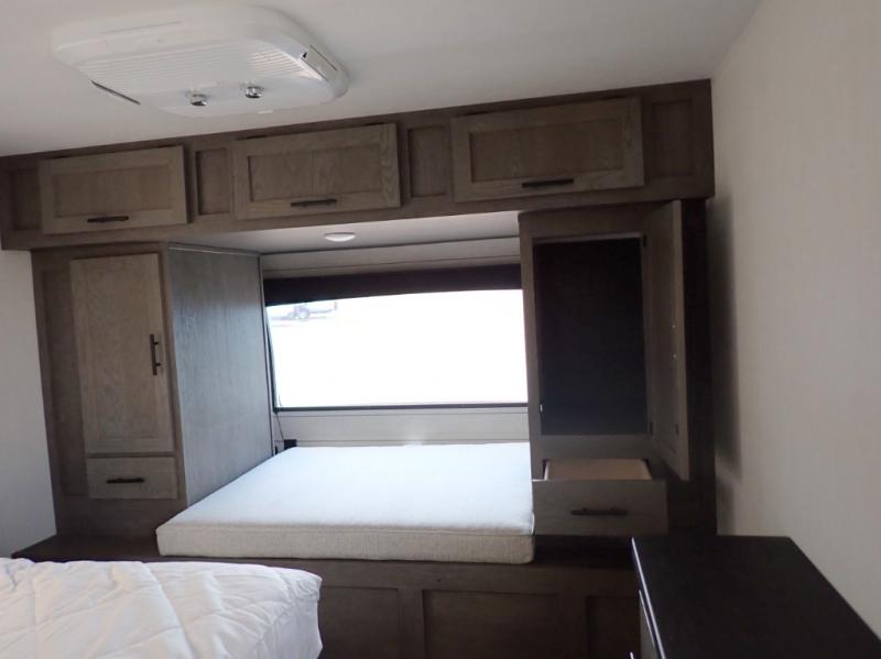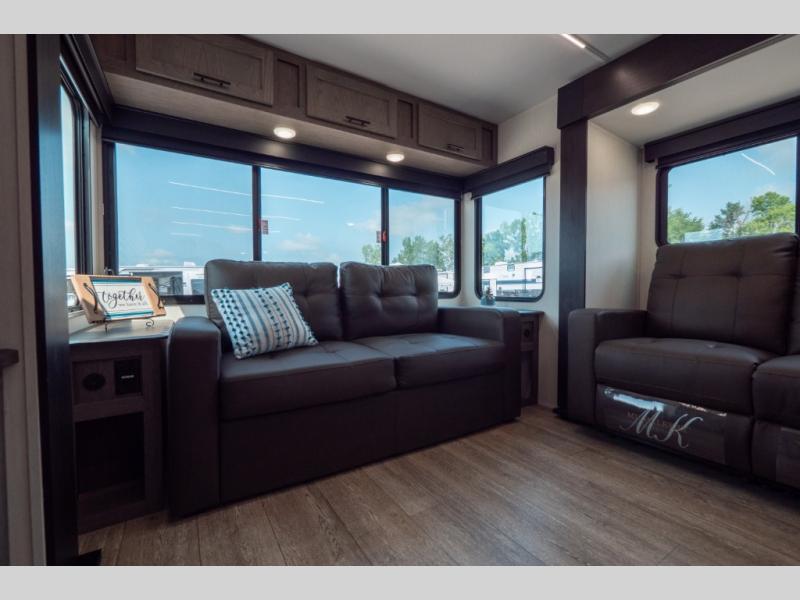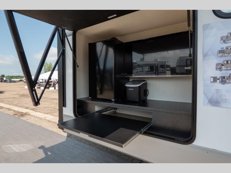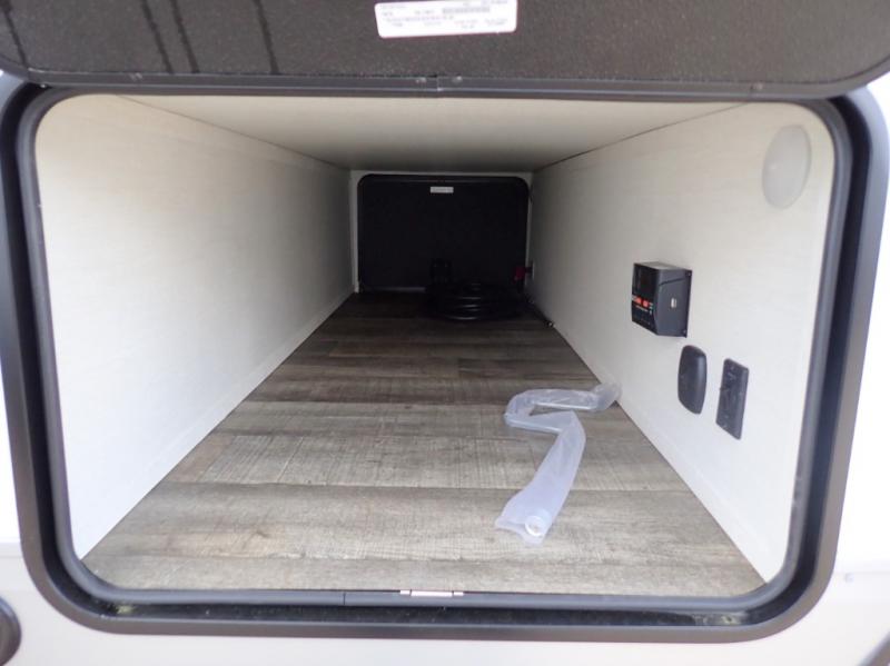 It will be so easy to find comfort in this travel trailer! The dual opposing slides in the combined kitchen and living room will create an open floorplan you are sure to love. There is a rear tri-fold sofa, theater seating across from an entertainment center, plus a table with chairs and a storage ottoman seat to keep games organized. The chef of your group will love having extra counter space provided by the kitchen island, and there is a hutch to keep nice dishes stored away. Up front, the private bedroom includes a king bed slide out, dual wardrobes and a dresser, plus a front sun bench where you can sit to pull your hiking boots on. There is even a wardrobe with washer and dryer prep if you choose to add those appliances!