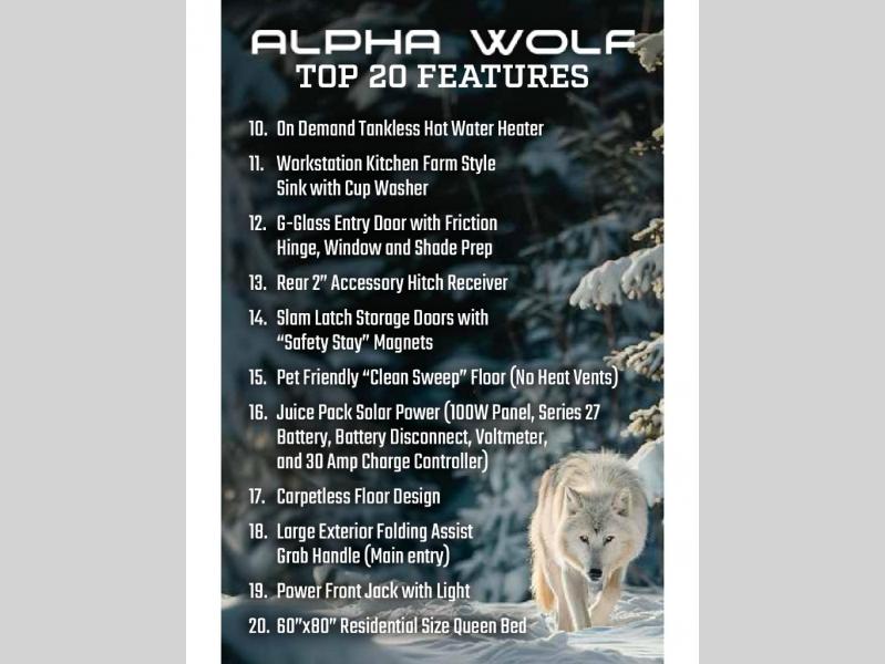 Includes Forest River's "Top 20" design and equipment features that make the Alpha Wolf 33RL efficient, comfortable, and convenient.