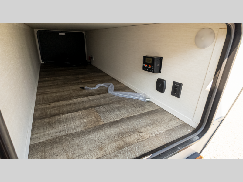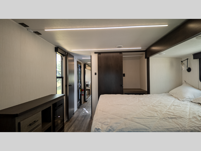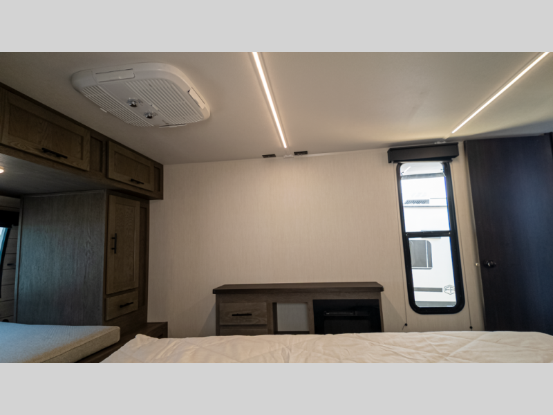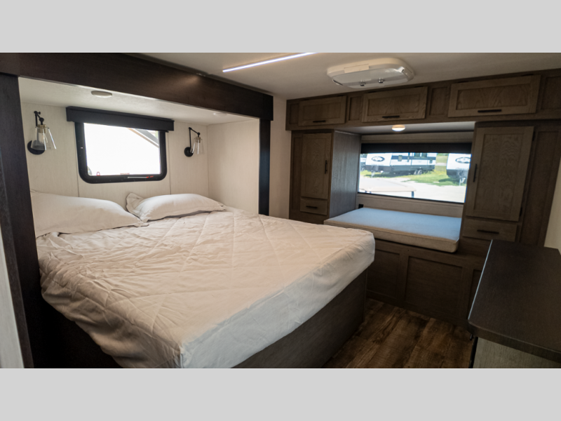 - Private bedroom: Front bedroom with queen bed, wardrobe, blackout shades, and pass-through storage