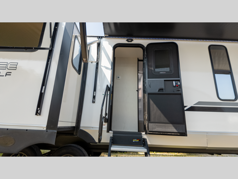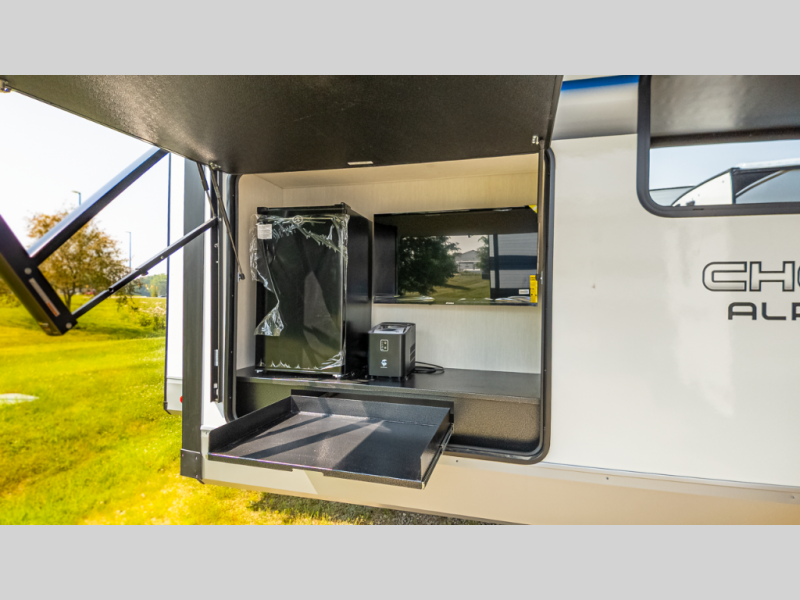 A: The Alpha Wolf 33RL delivers a rear living layout with theater seating, large slide housing dinette and sofa, front private bedroom, full kitchen, and outdoor cooking—all in a 36'-foot package that balances comfort and tow ability.