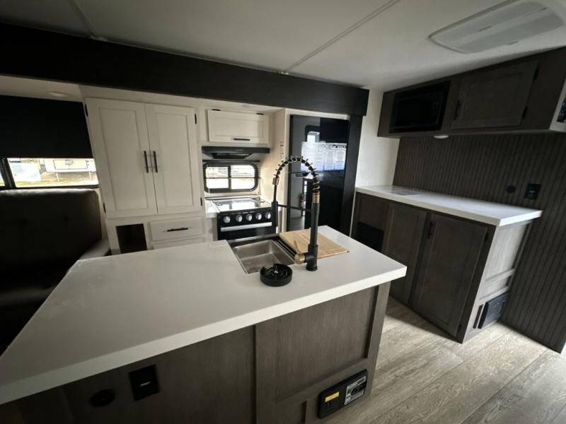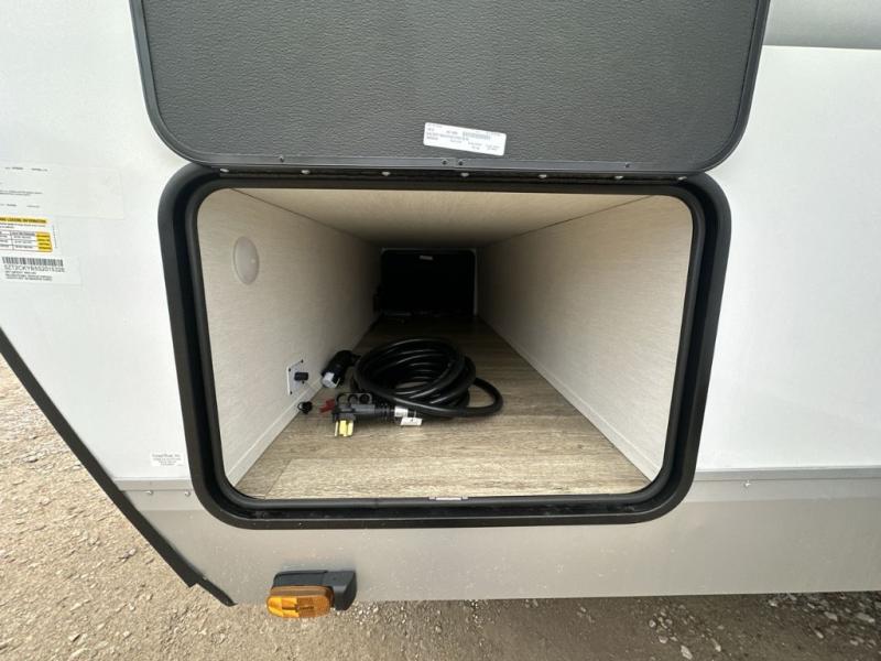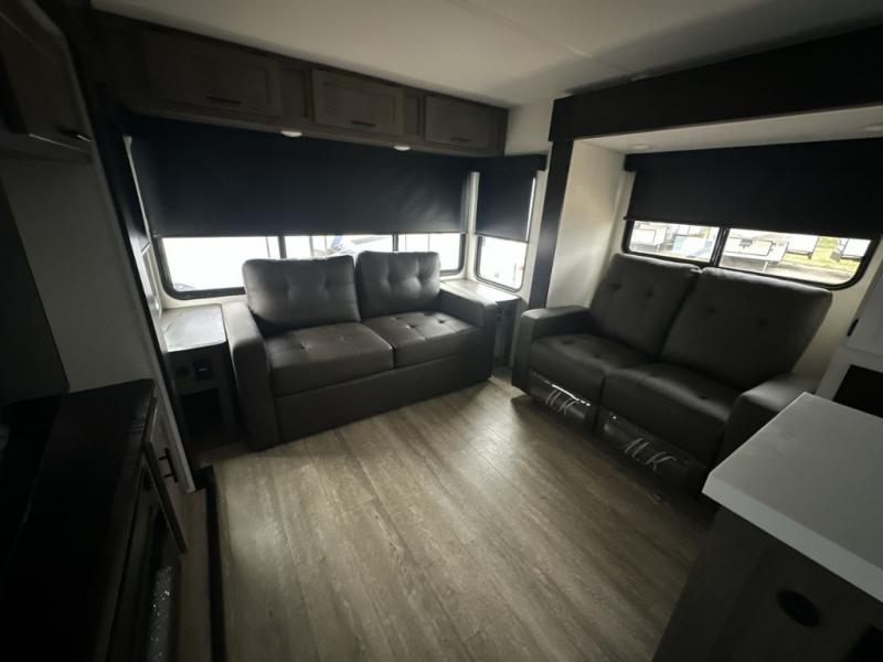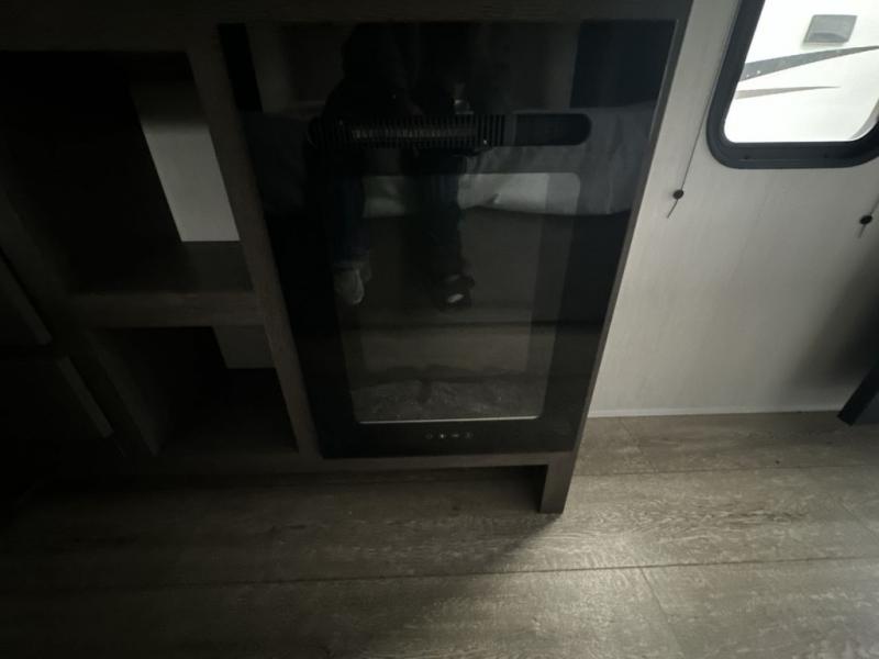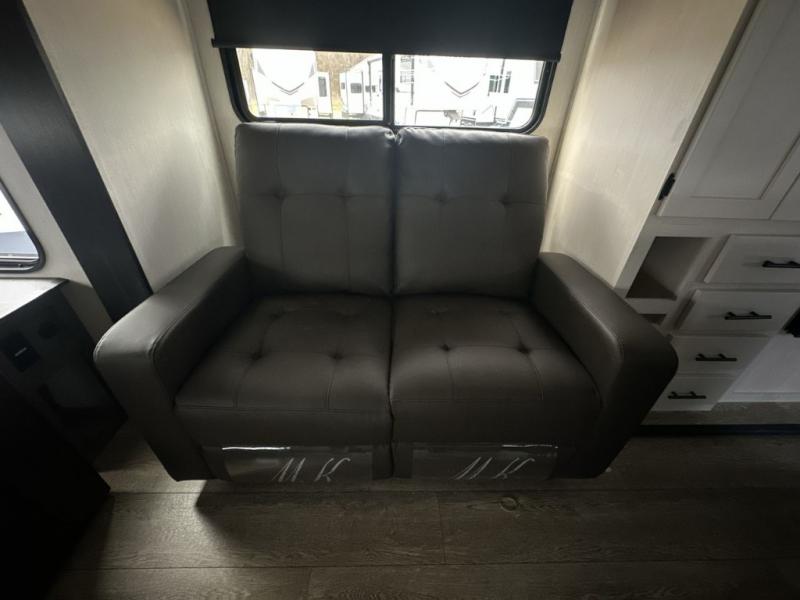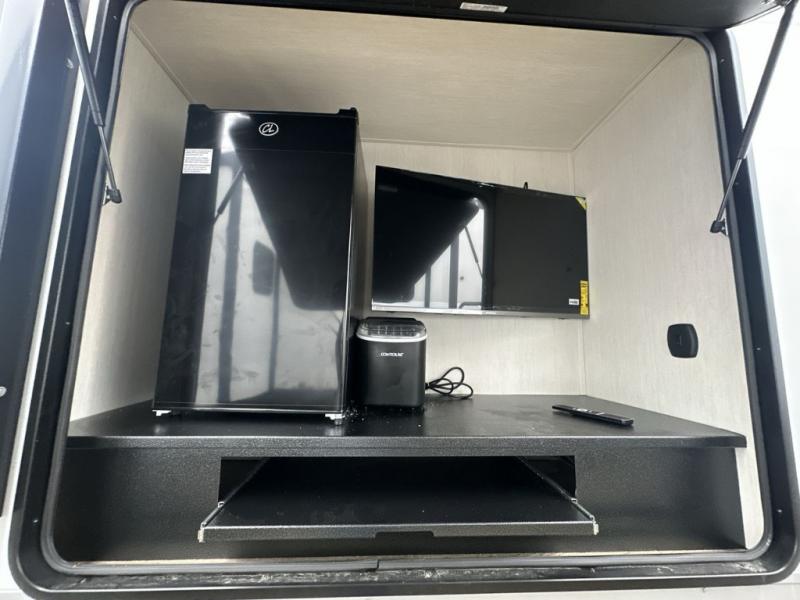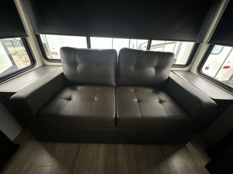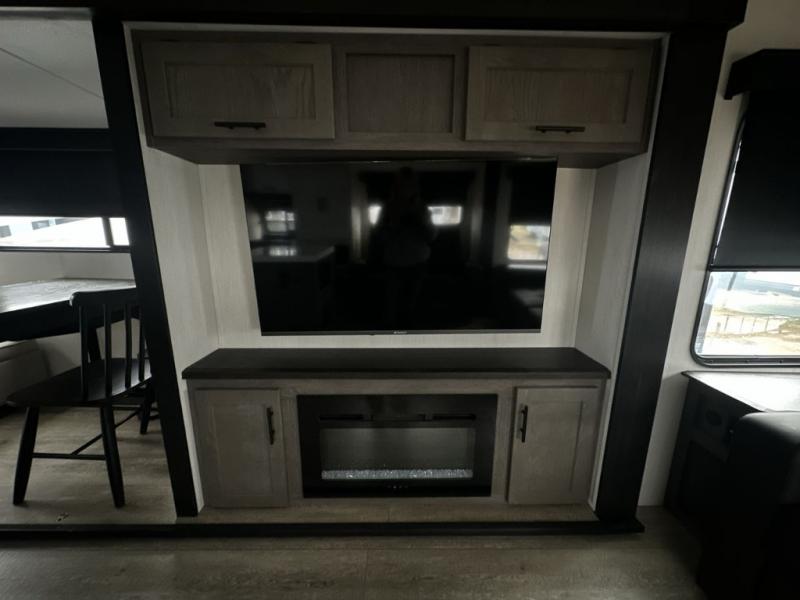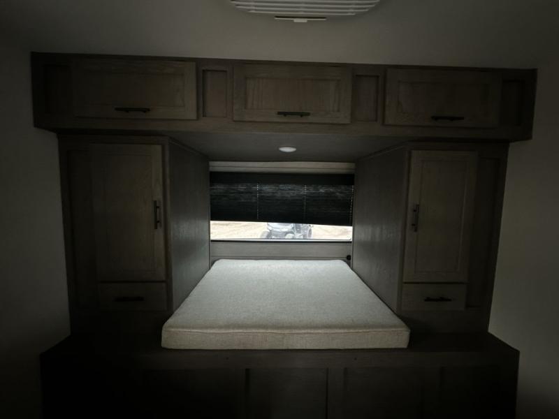 It will be so easy to find comfort in this travel trailer! The dual opposing slides in the combined kitchen and living room will create an open floorplan you are sure to love. There is a rear tri-fold sofa, theater seating across from an entertainment center, plus a table with chairs and a storage ottoman seat to keep games organized. The chef of your group will love having extra counter space provided by the kitchen island, and there is a hutch to keep nice dishes stored away. Up front, the private bedroom includes a king bed slide out, dual wardrobes and a dresser, plus a front sun bench where you can sit to pull your hiking boots on. There is even a wardrobe with washer and dryer prep if you choose to add those appliances!