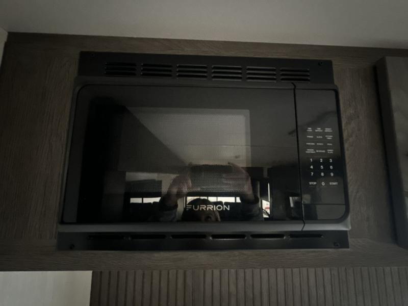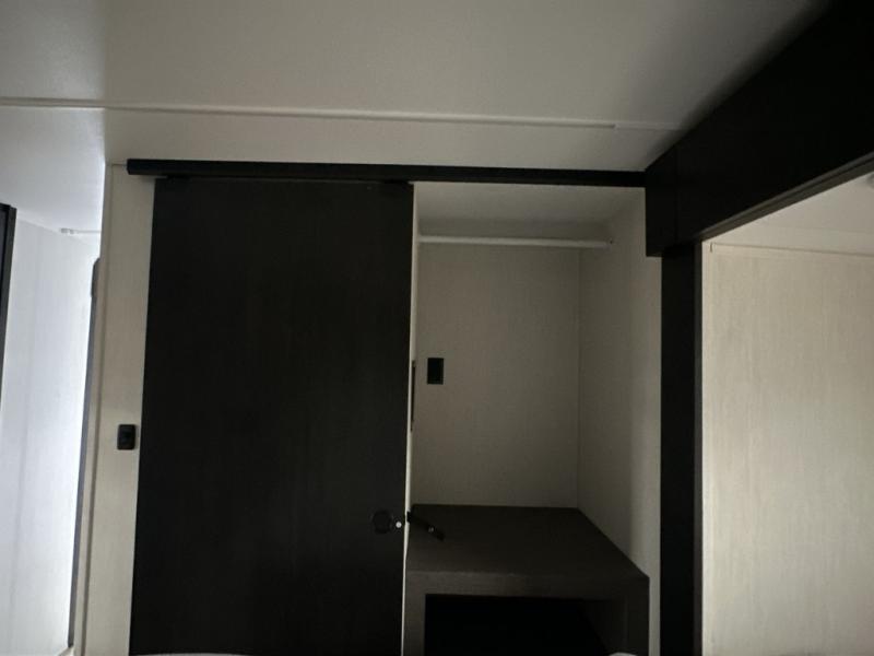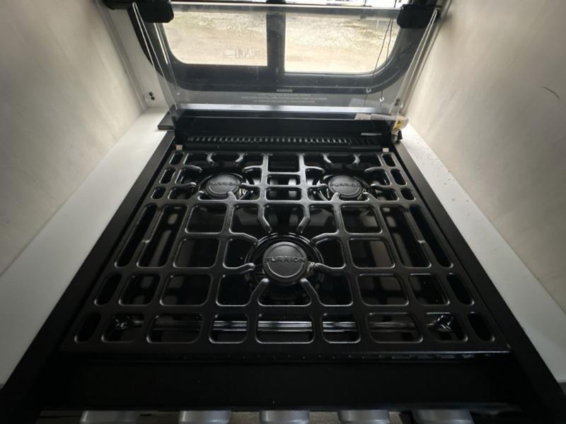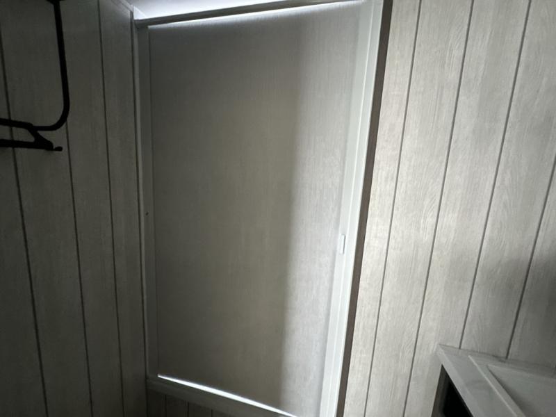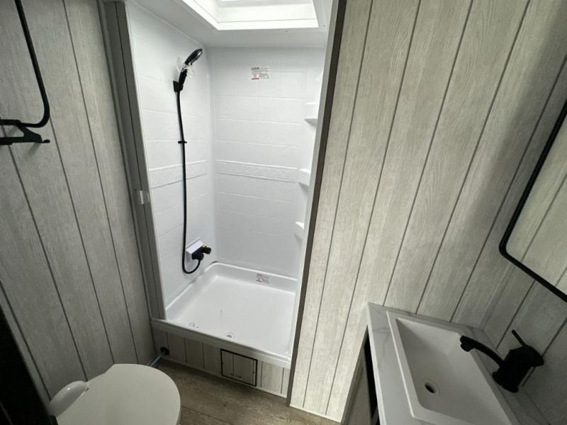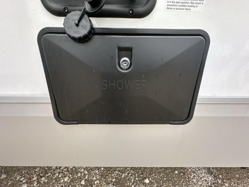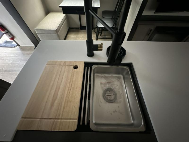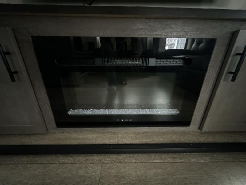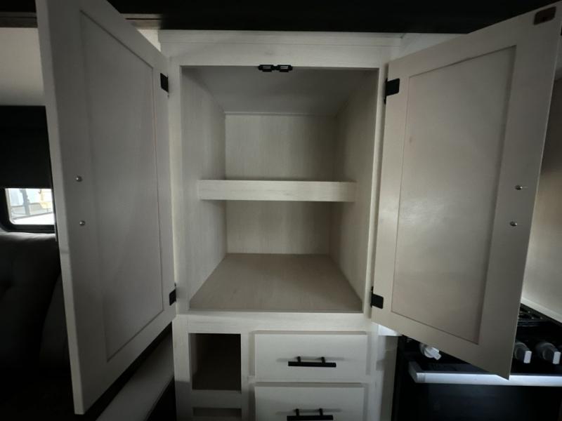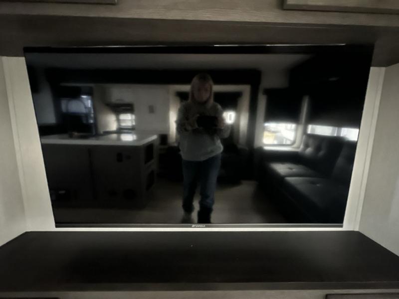 It will be so easy to find comfort in this travel trailer! The dual opposing slides in the combined kitchen and living room will create an open floorplan you are sure to love. There is a rear tri-fold sofa, theater seating across from an entertainment center, plus a table with chairs and a storage ottoman seat to keep games organized. The chef of your group will love having extra counter space provided by the kitchen island, and there is a hutch to keep nice dishes stored away. Up front, the private bedroom includes a king bed slide out, dual wardrobes and a dresser, plus a front sun bench where you can sit to pull your hiking boots on. There is even a wardrobe with washer and dryer prep if you choose to add those appliances!