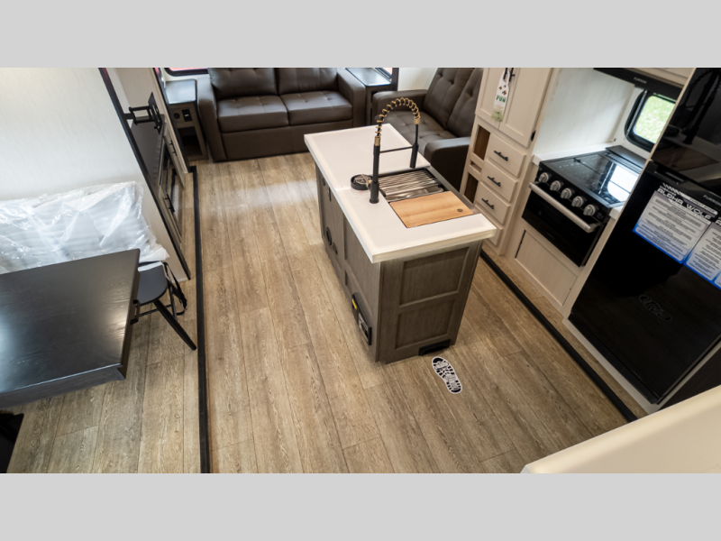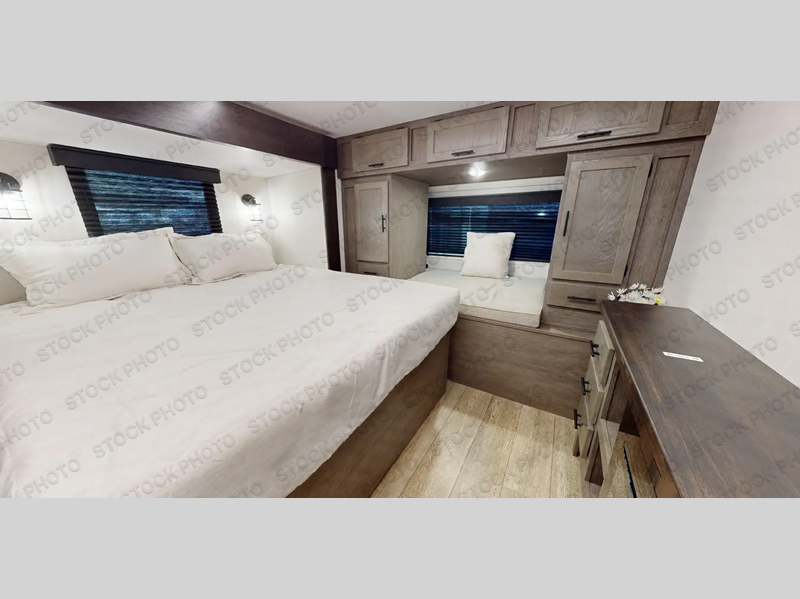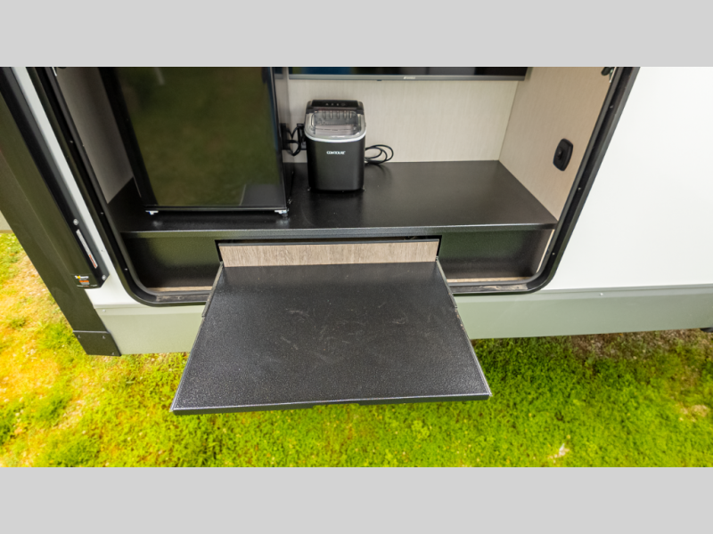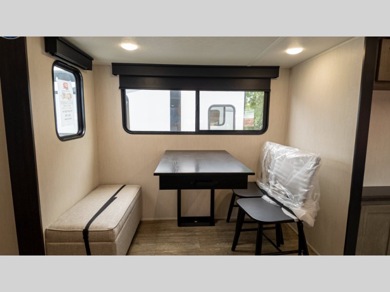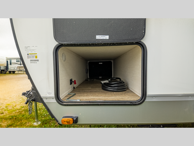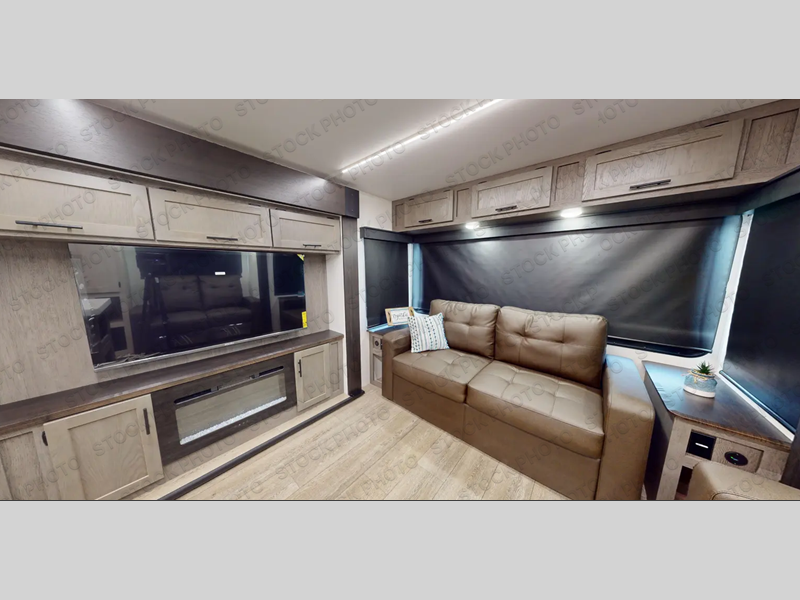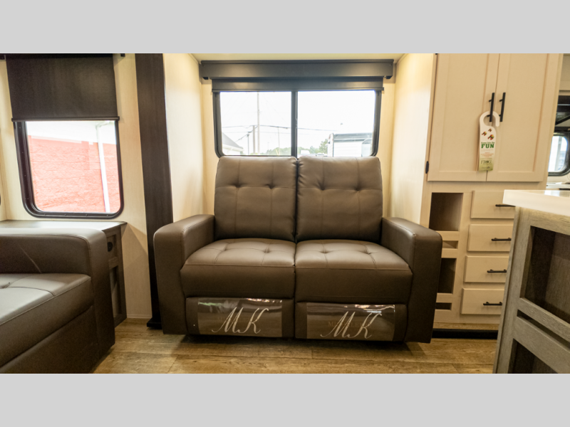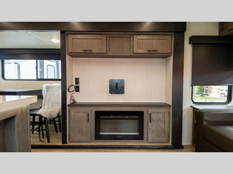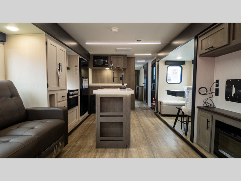 It will be so easy to find comfort in this travel trailer! The dual opposing slides in the combined kitchen and living room will create an open floorplan you are sure to love. There is a rear tri-fold sofa, theater seating across from an entertainment center, plus a table with chairs and a storage ottoman seat to keep games organized. The chef of your group will love having extra counter space provided by the kitchen island, and there is a hutch to keep nice dishes stored away. Up front, the private bedroom includes a king bed slide out, dual wardrobes and a dresser, plus a front sun bench where you can sit to pull your hiking boots on. There is even a wardrobe with washer and dryer prep if you choose to add those appliances!
