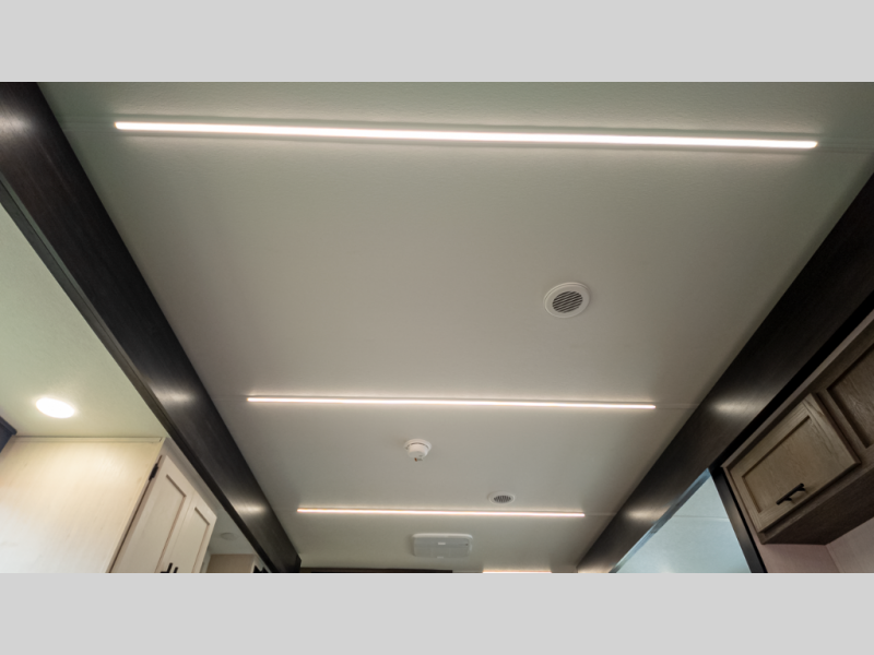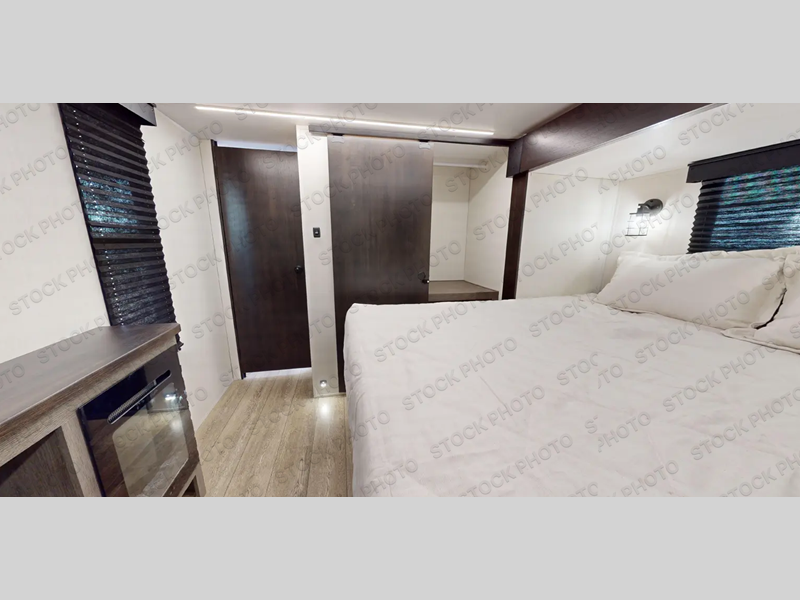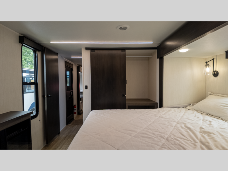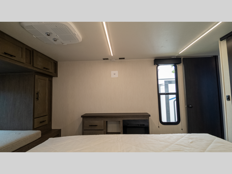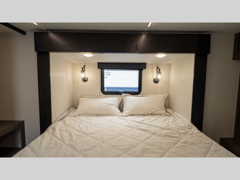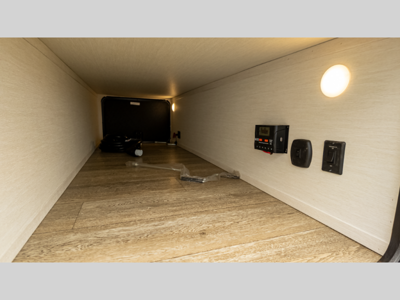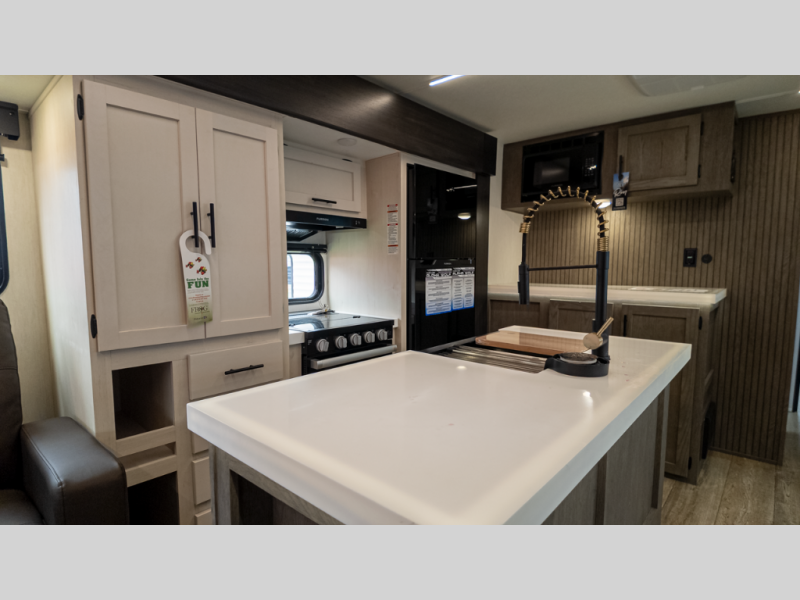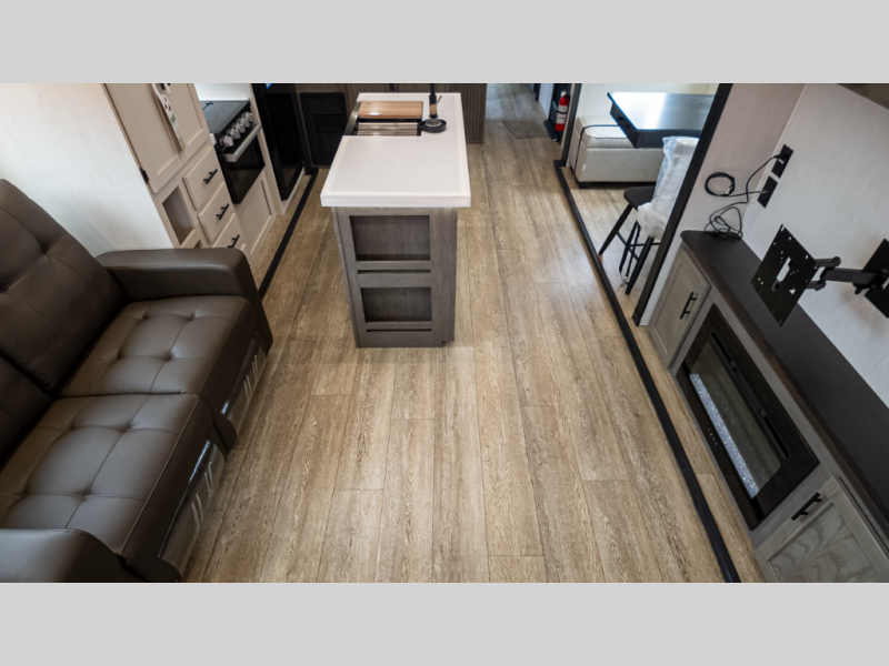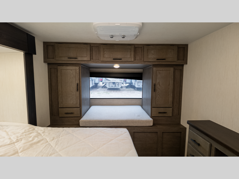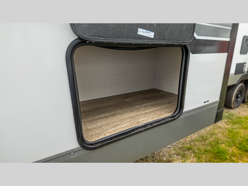 It will be so easy to find comfort in this travel trailer! The dual opposing slides in the combined kitchen and living room will create an open floorplan you are sure to love. There is a rear tri-fold sofa, theater seating across from an entertainment center, plus a table with chairs and a storage ottoman seat to keep games organized. The chef of your group will love having extra counter space provided by the kitchen island, and there is a hutch to keep nice dishes stored away. Up front, the private bedroom includes a king bed slide out, dual wardrobes and a dresser, plus a front sun bench where you can sit to pull your hiking boots on. There is even a wardrobe with washer and dryer prep if you choose to add those appliances!