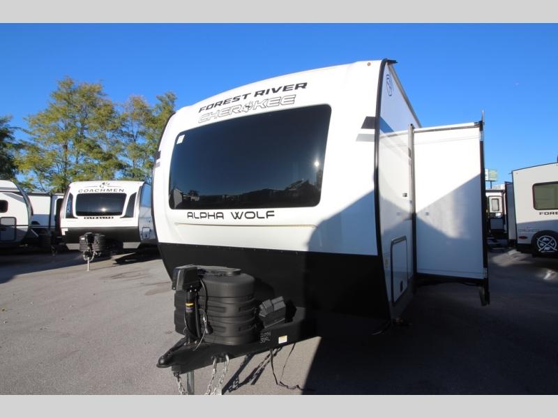With any Cherokee Alpha Wolf travel trailer by Forest River you'll enjoy outstanding amenities, quality construction, and an affordable price. Each model features a "ToughBend" rigid skirt metal design, 5/8" tongue and groove plywood floor decking, and a "SuperTruss" roof structure that will hold up through years of camping memories. There is a pet friendly "clean sweep" floor design with no heat vents indoors, along with a super lumen lighting system, a 15,000 BTU quick cool central air conditioning, and many more comforts. There are many convenient exterior features such as, Leash Latch pet safety technology, an outside shower with hot and cold water, On The Go rear ladder prep, and exterior steps with oversized landing and quick release. The Weather Guard Package will add protection against the elements with an armored underbelly tank enclosure and forced air heat, thermo-control reflective safety glass windows, and upgraded laminated walls with block foam insulation!