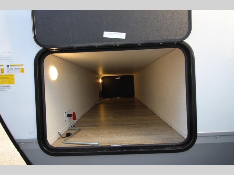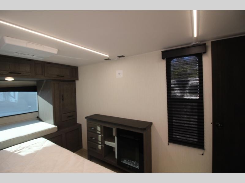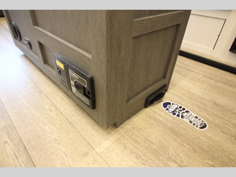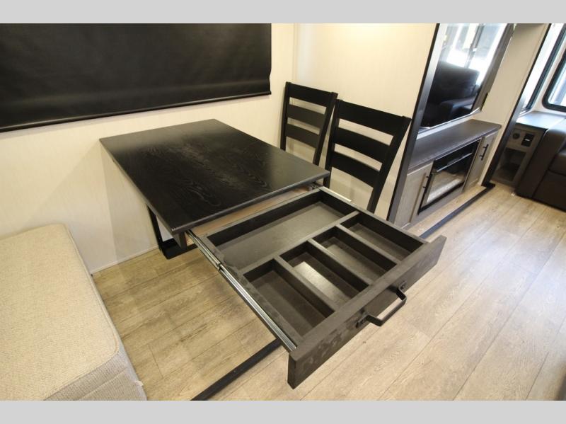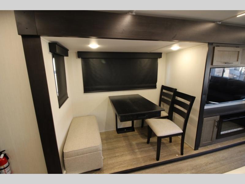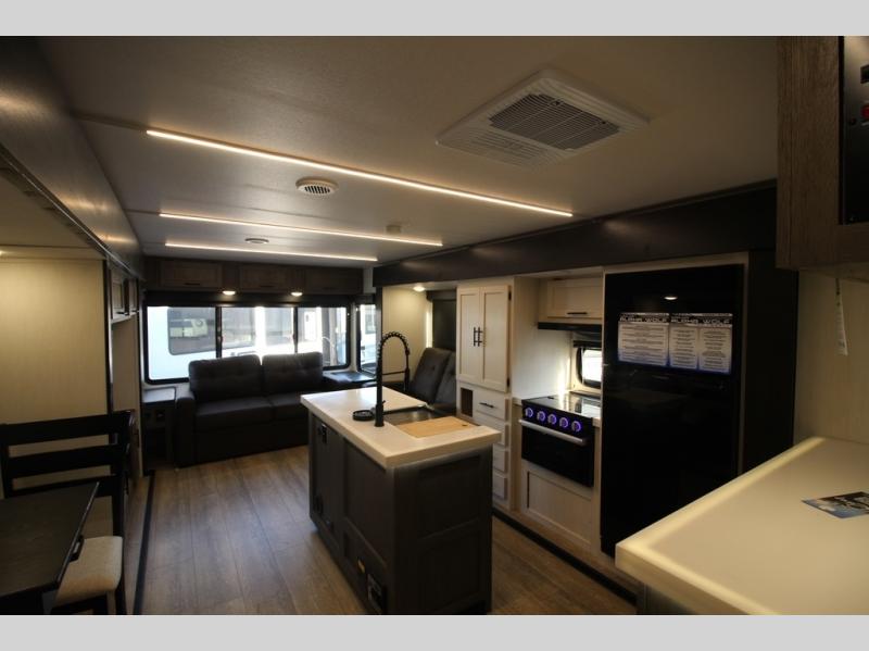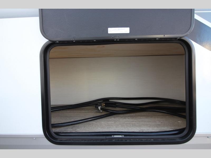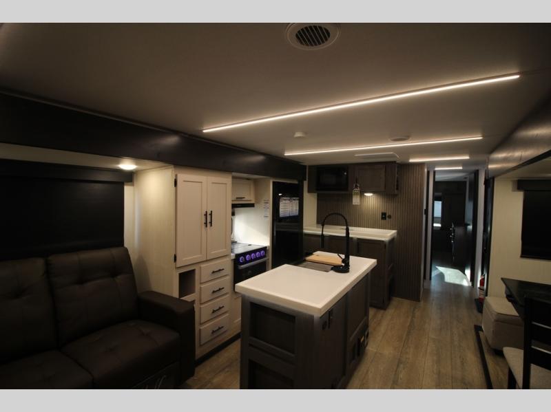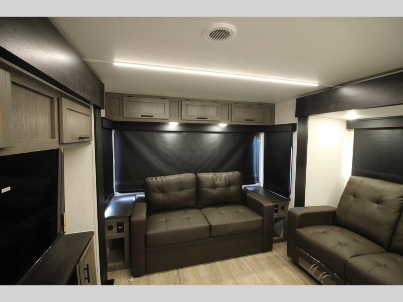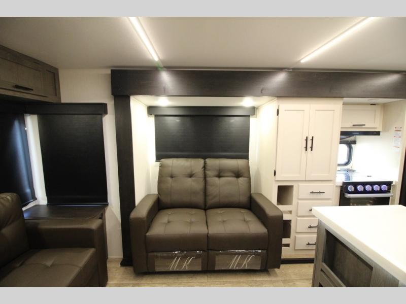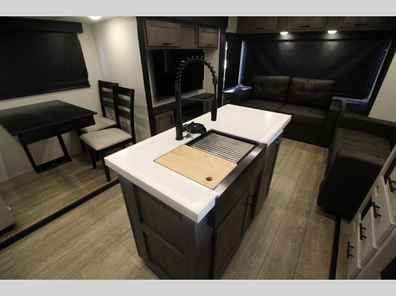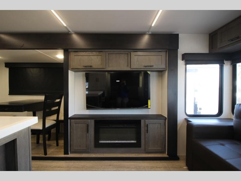 It will be so easy to find comfort in this travel trailer! The dual opposing slides in the combined kitchen and living room will create an open floorplan you are sure to love. There is a rear tri-fold sofa, theater seating across from an entertainment center, plus a table with chairs and a storage ottoman seat to keep games organized. The chef of your group will love having extra counter space provided by the kitchen island, and there is a hutch to keep nice dishes stored away. Up front, the private bedroom includes a king bed slide out, dual wardrobes and a dresser, plus a front sun bench where you can sit to pull your hiking boots on. There is even a wardrobe with washer and dryer prep if you choose to add those appliances!