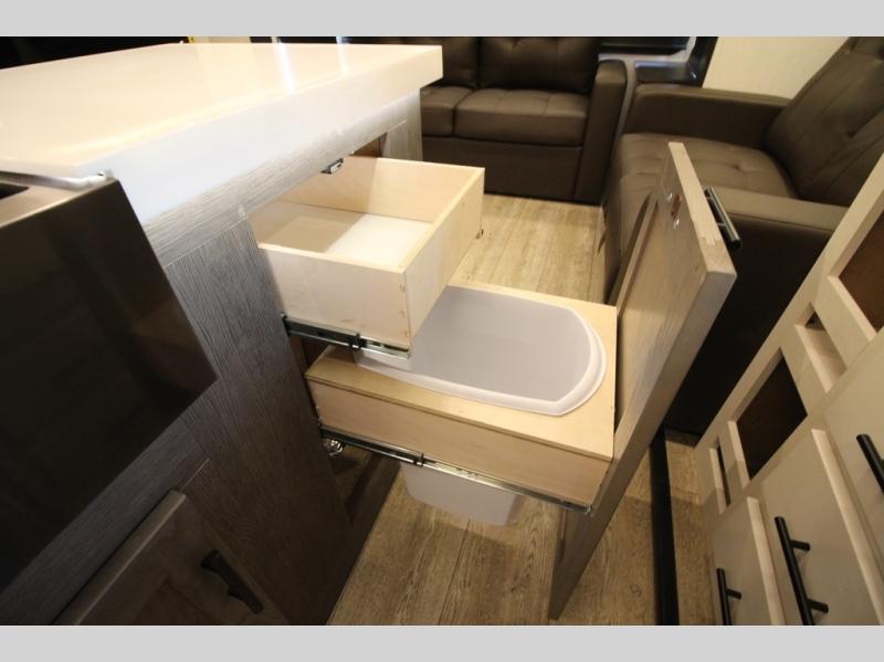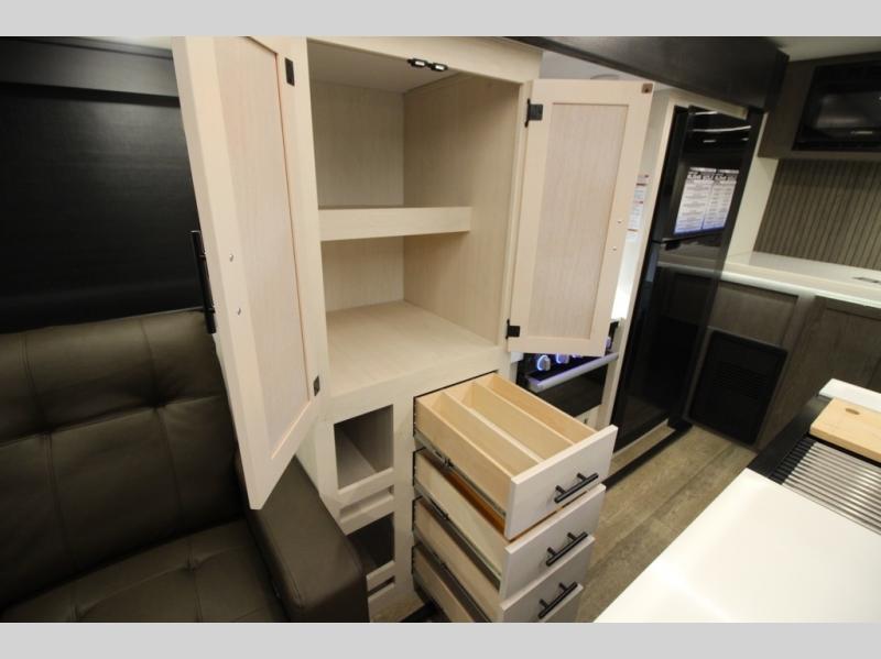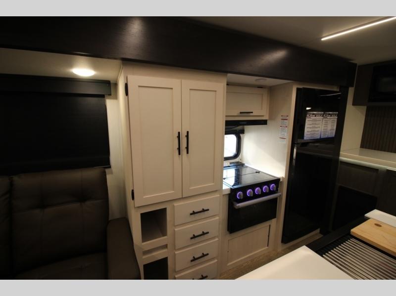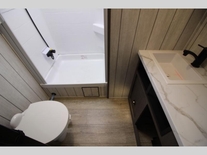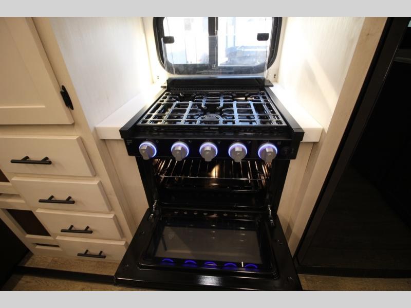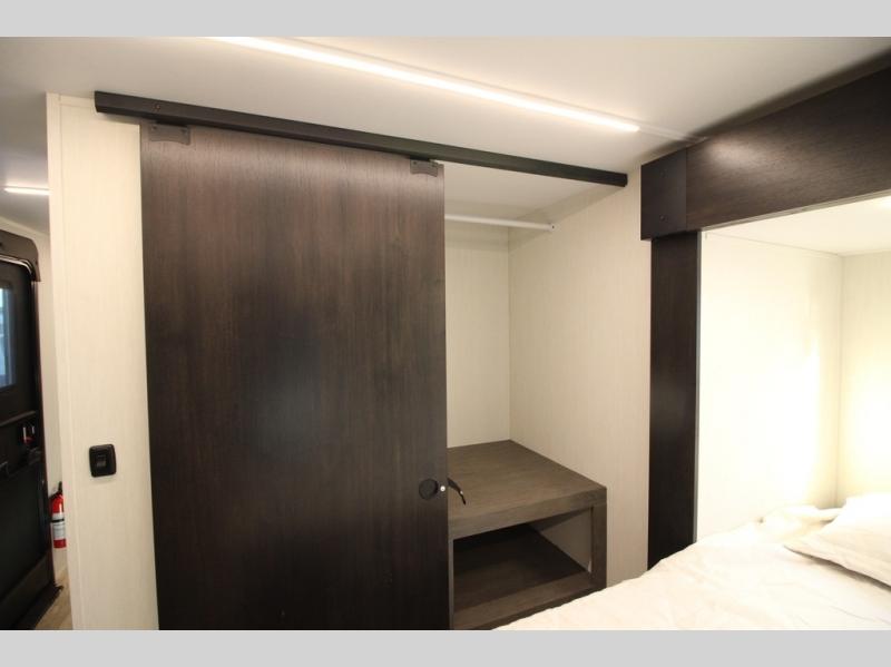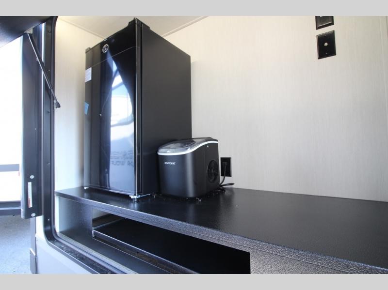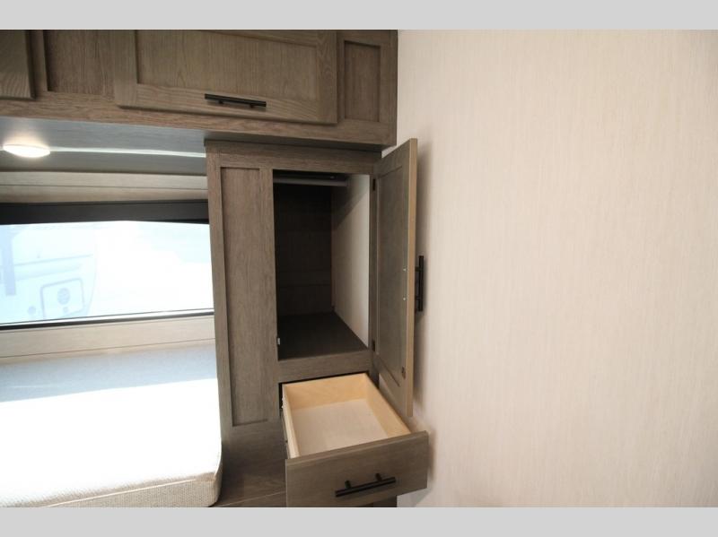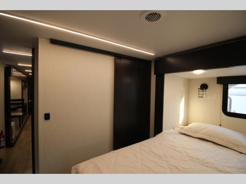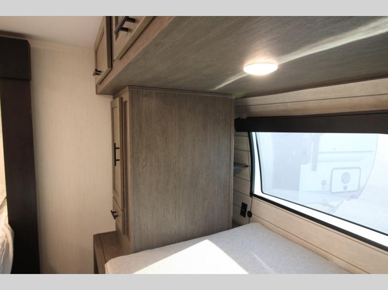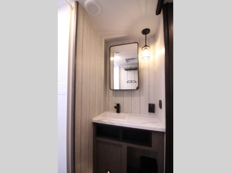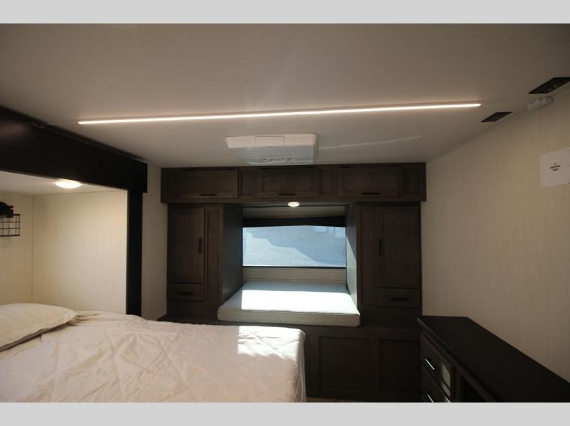 It will be so easy to find comfort in this travel trailer! The dual opposing slides in the combined kitchen and living room will create an open floorplan you are sure to love. There is a rear tri-fold sofa, theater seating across from an entertainment center, plus a table with chairs and a storage ottoman seat to keep games organized. The chef of your group will love having extra counter space provided by the kitchen island, and there is a hutch to keep nice dishes stored away. Up front, the private bedroom includes a king bed slide out, dual wardrobes and a dresser, plus a front sun bench where you can sit to pull your hiking boots on. There is even a wardrobe with washer and dryer prep if you choose to add those appliances!