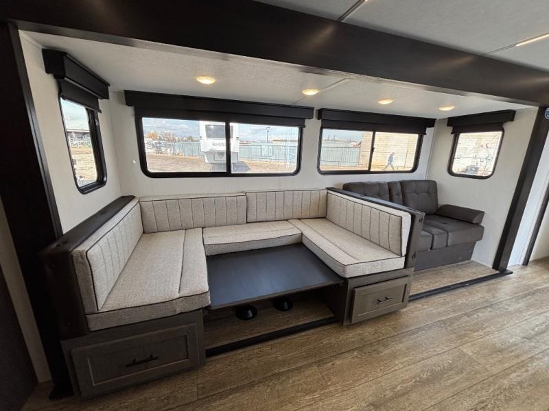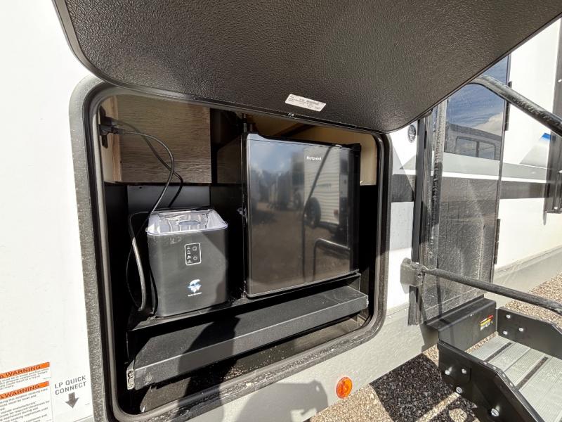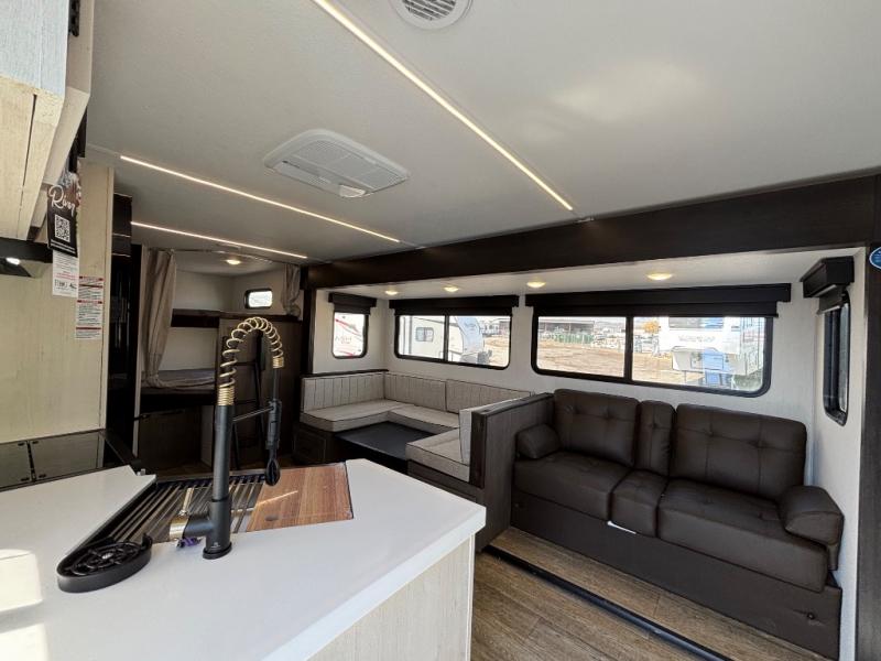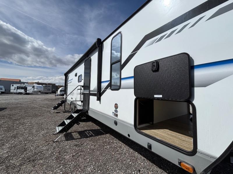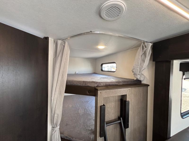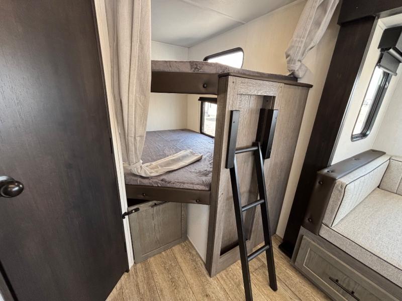 Looking for a multi-sleeper trailer to sleep nine to ten happy campers? You've found it in this dual entry model with an outside kitchen, double-size bunks, and a large slide out! The main living and kitchen area has a U-shaped dinette to utilize as a dining table, game table, work station, and/or an extra sleeping space. You will also find a hidden pantry behind the entertainment center and full kitchen amenities including a large sink and a residential-style refrigerator. The exterior provides a 20' awning for an outdoor living area, outside storage, plus large steps with oversized landing and quick release for convenience. You will also appreciate the Juice Pack that comes with a 100W solar panel, a battery, a 30 AMP solar charger, and more!