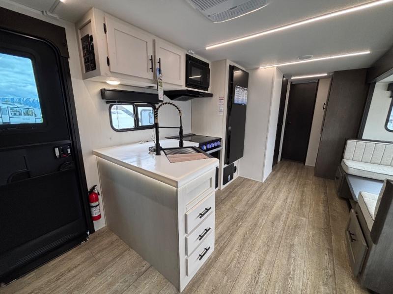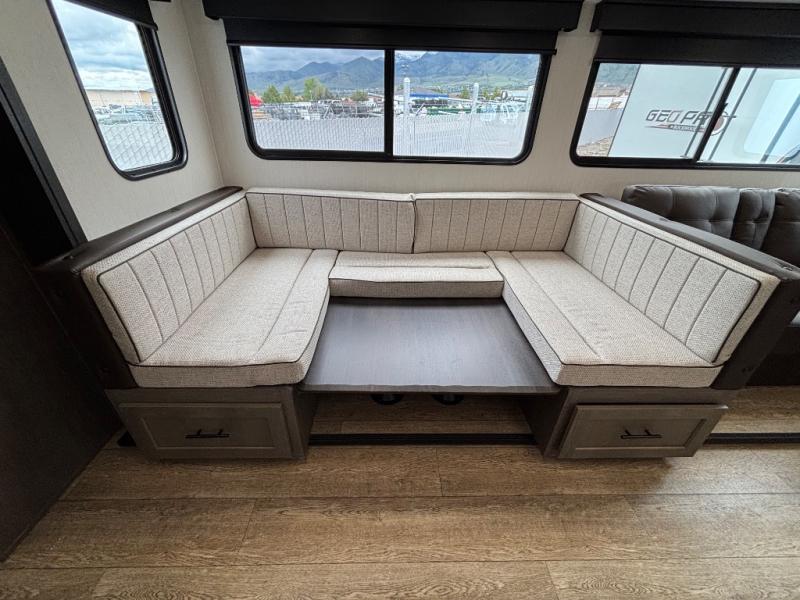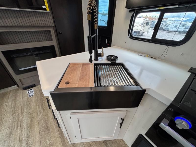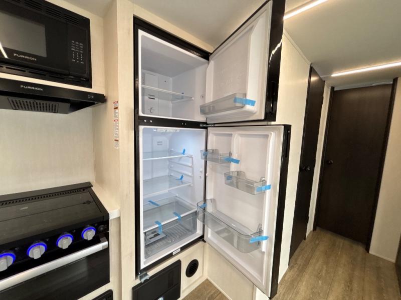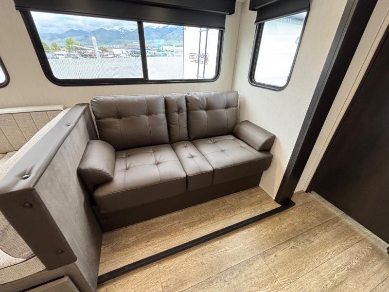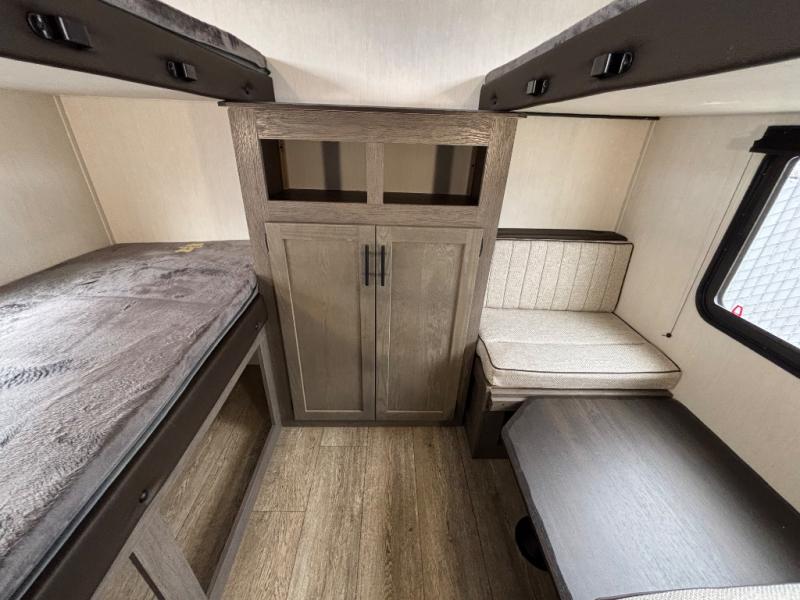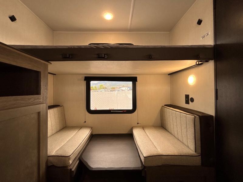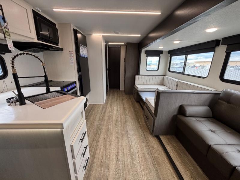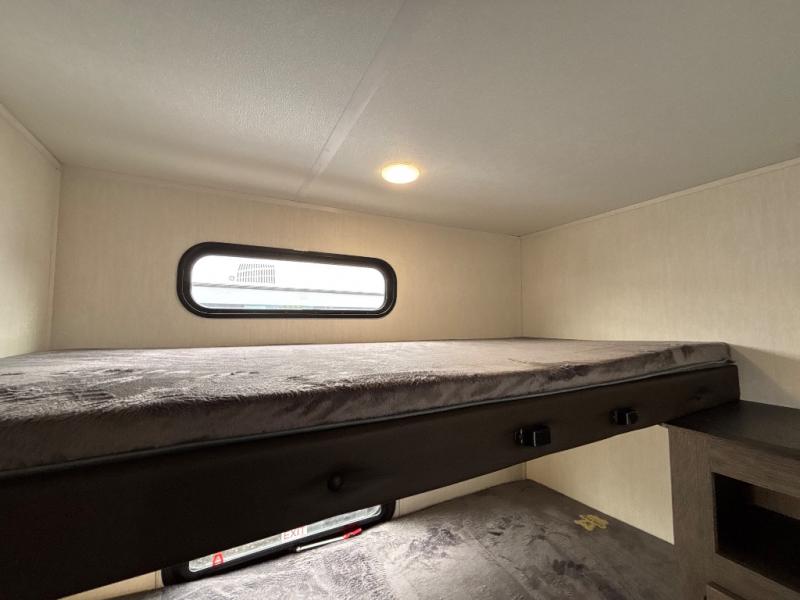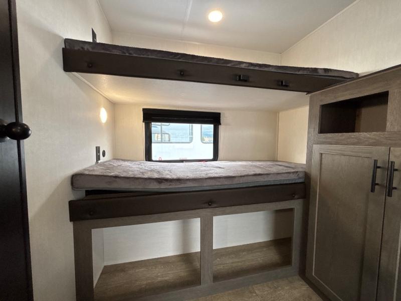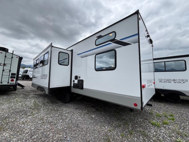 Looking for a spacious travel trailer to sleep nine or ten happy campers? You've found it in this Cherokee Alpha Wolf model with a handy outside kitchen, a bunkhouse with a dinette, a front private bedroom, and a large slide out! The main living and kitchen area has a U-shaped dinette to utilize as a dining table, game table, work station, and/or an extra sleeping space. There is also a jackknife sofa for seating, TV watching, or sleeping. From any seating area you can easily view the entertainment center and fireplace which is centered in the unit with doors on either side to the front private bedroom. You will also find a nice pantry and full kitchen amenities including a large sink, and residential-style refrigerator allowing you to easily create meals for your hungry crew. The exterior provides an 18' awning for an outdoor living area over the outside kitchen, and there is ample exterior storage for all of your camping gear like camp chairs, outside games, rugs, and more.
