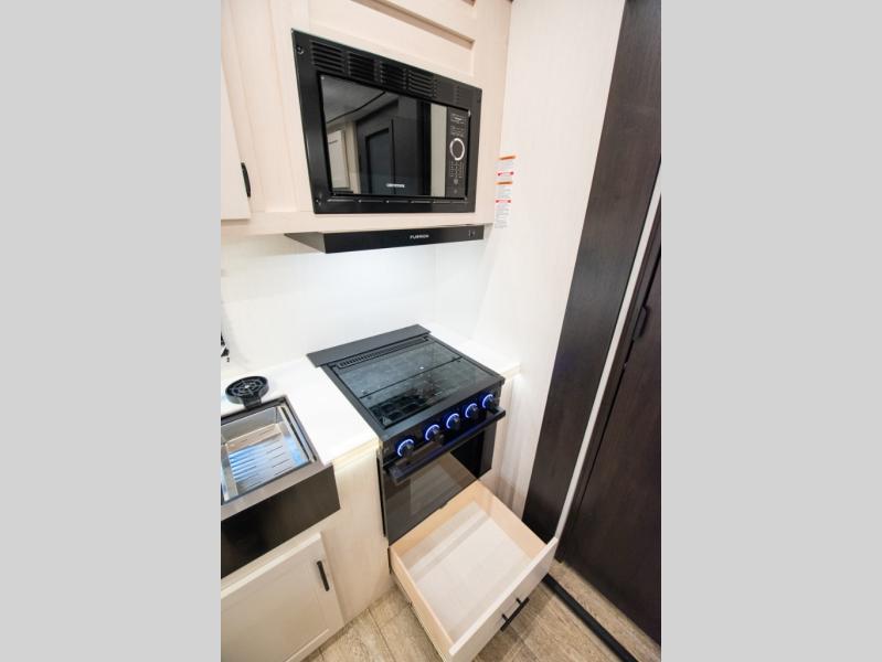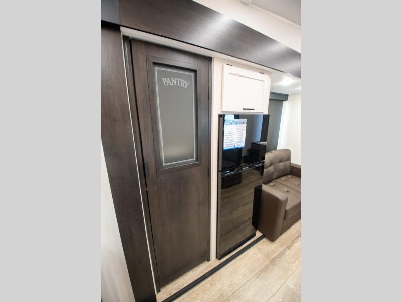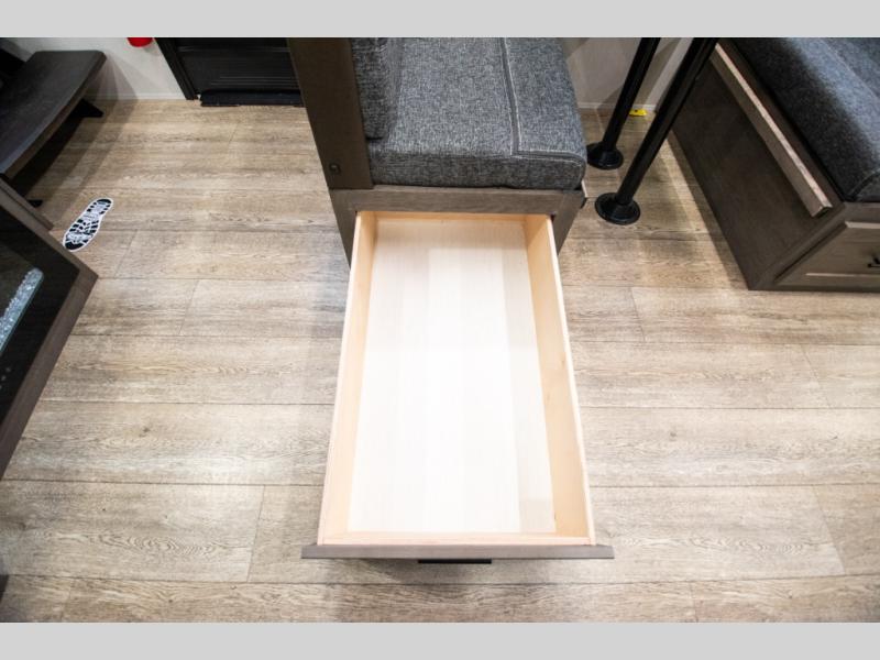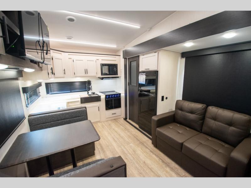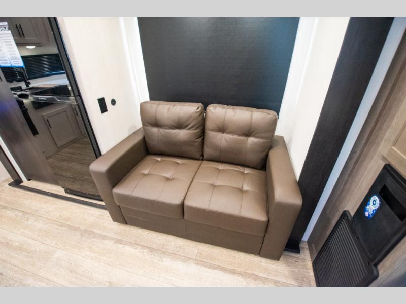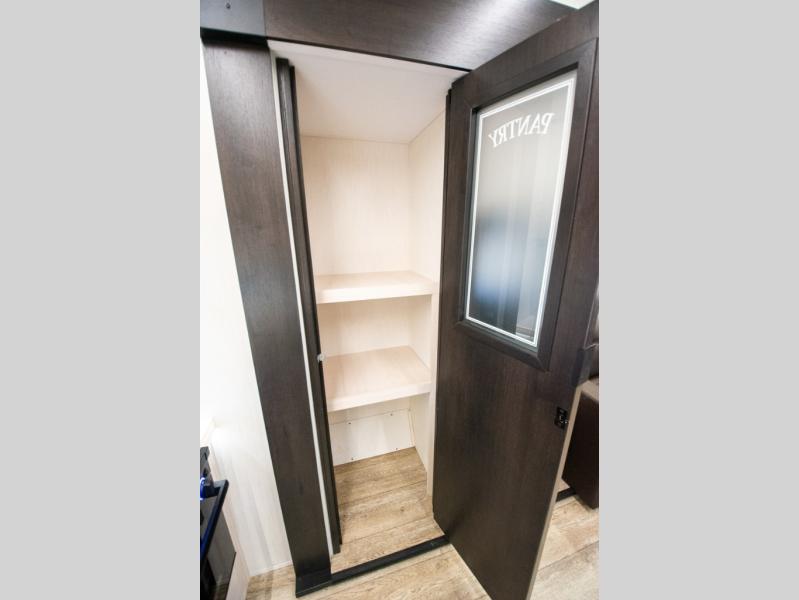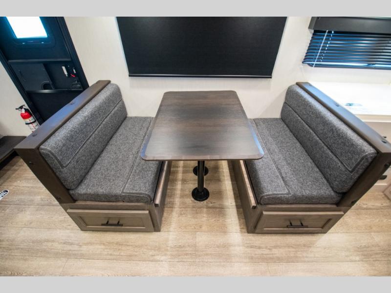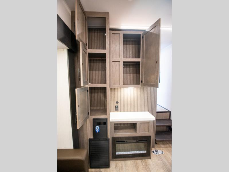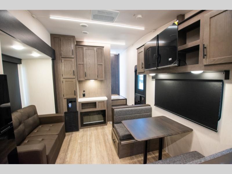 You and your spouse will love camping in this fifth wheel! The front private bedroom has a queen bed for a good night's rest with wardrobes and USB ports on either side for your electronics to charge while you do. Inside the full bathroom is a shower with a removable shower rod for hang-drying your clothes. The centralized ceiling fan will help to circulate the cool air from the 15,000 BTU air conditioner so you can stay cool as you prepare delicious meals in the rear kitchen. You even have two pantries for all of your snacks, a hutch for your dishes, and an electric fireplace to enjoy either on the tri-fold sofa or booth dinette. The outside kitchen is under the 20' awning so you can stay protected while you cook in the great outdoors!