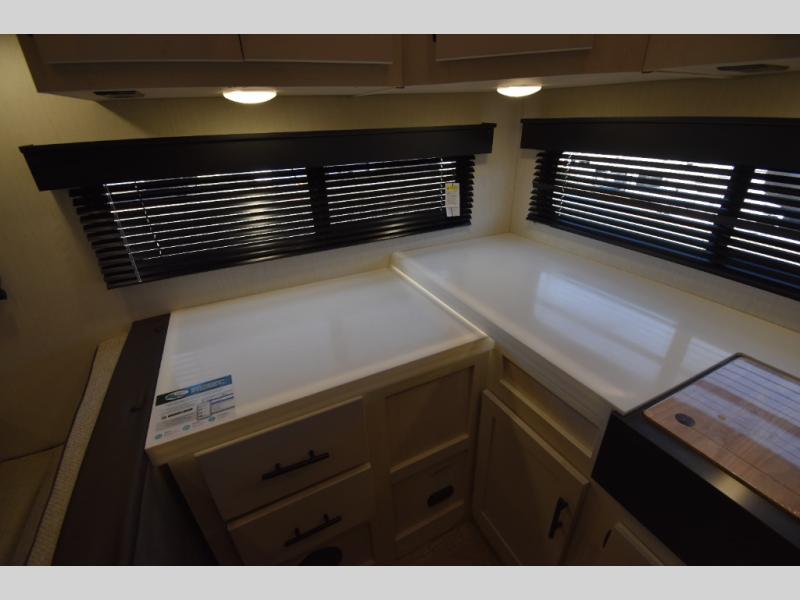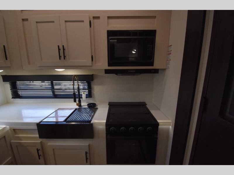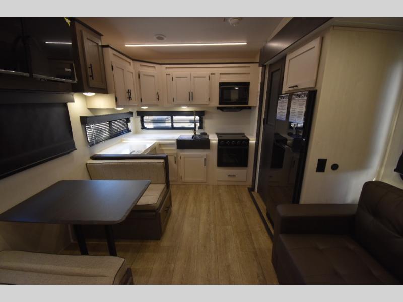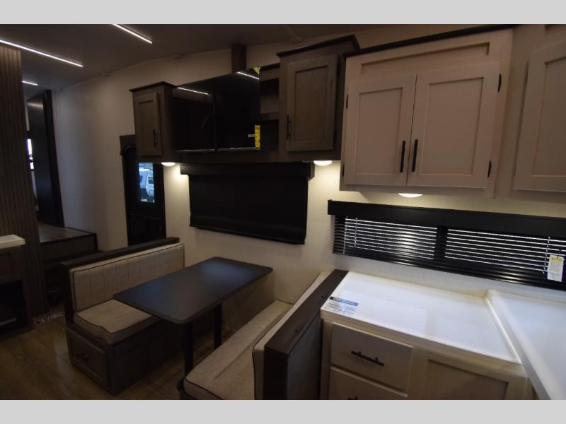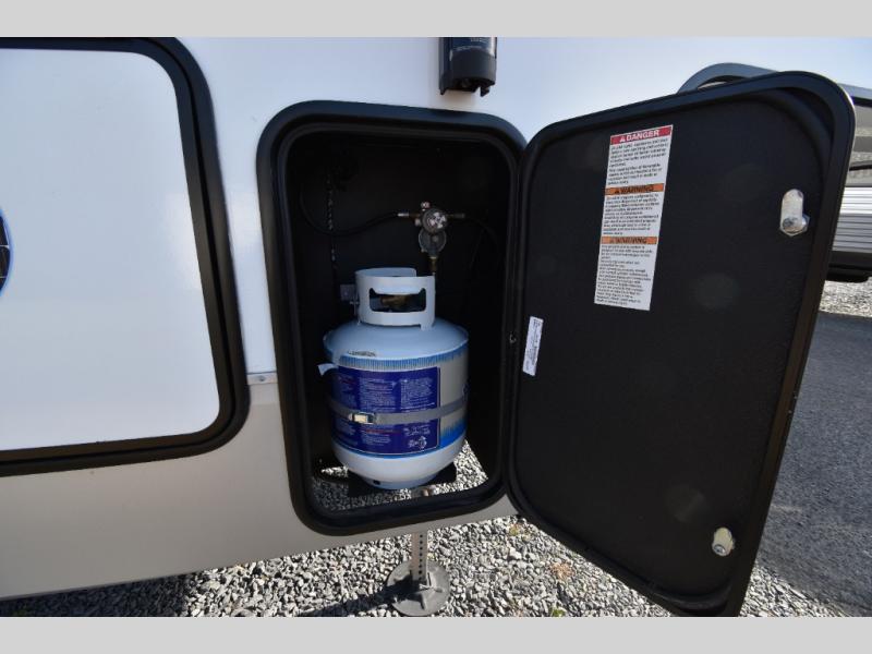 You and your spouse will love camping in this fifth wheel! The front private bedroom has a queen bed for a good night's rest with wardrobes and USB ports on either side for your electronics to charge while you do. Inside the full bathroom is a convenient shower caddy, a Dura Faucet hand held shower head, and a shower skylight for more head room. You'll have two pantries for all of your snacks, a hutch for your dishes, and an electric fireplace to enjoy either on the tri-fold sofa or booth dinette. The outside kitchen is under the 20' awning so you can stay protected while you cook in the great outdoors!
