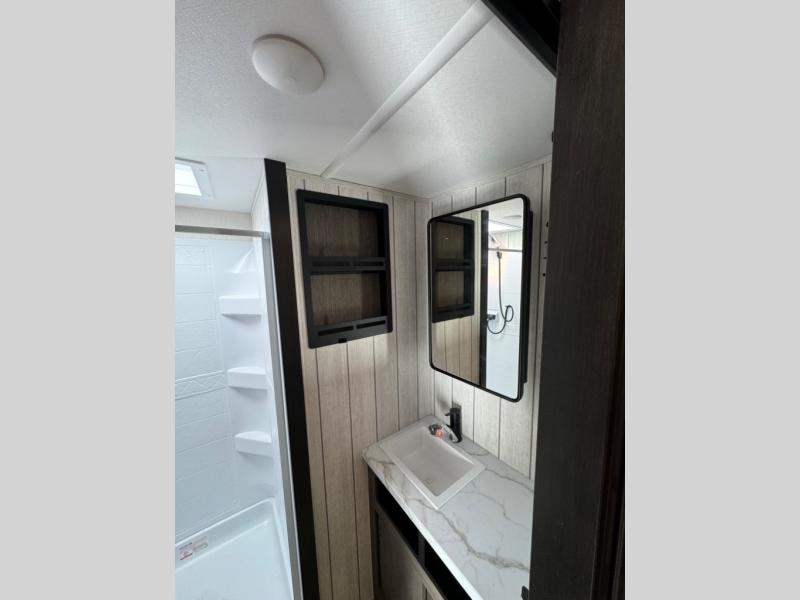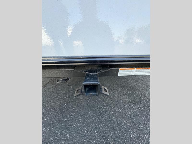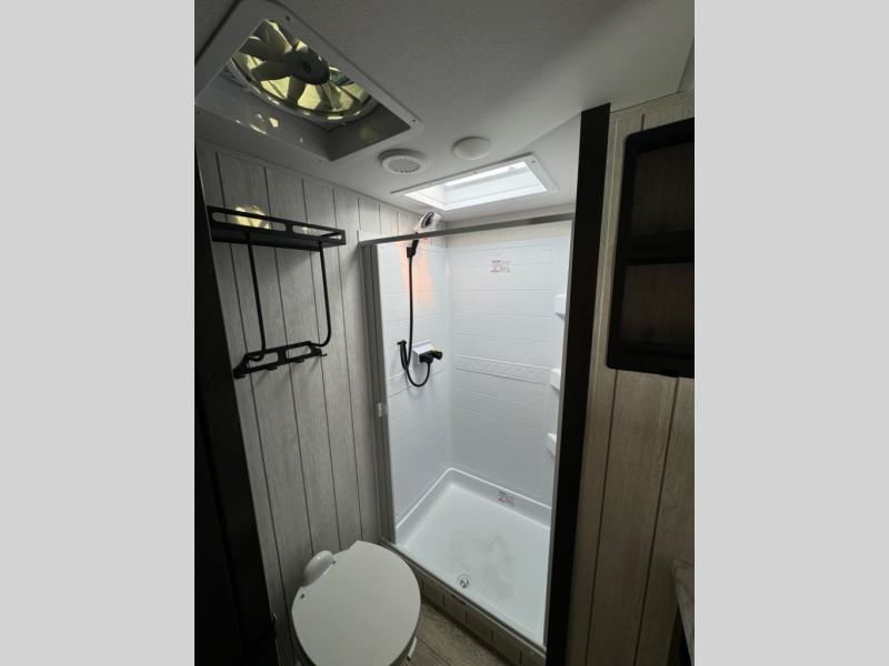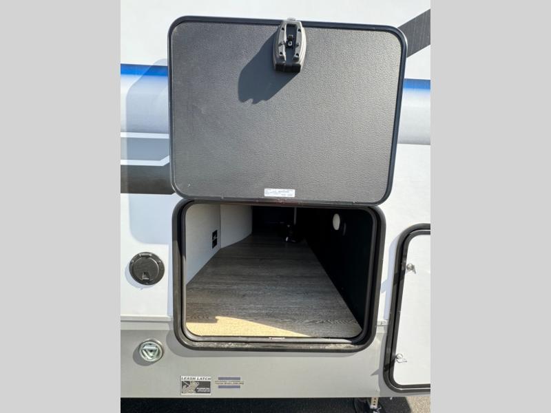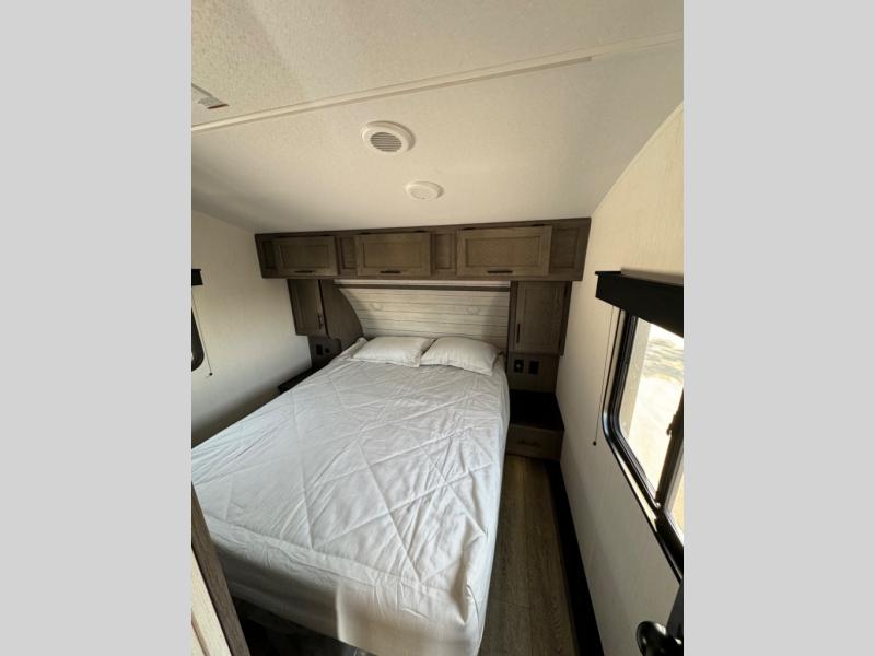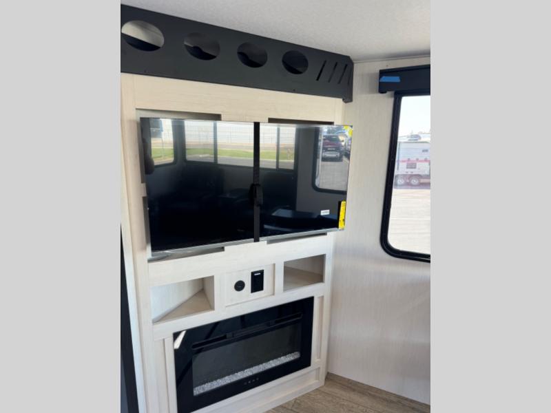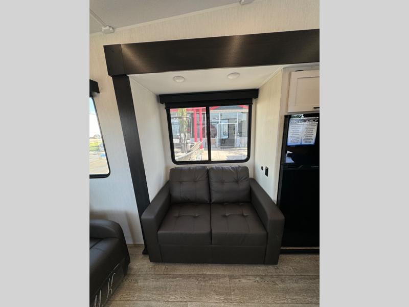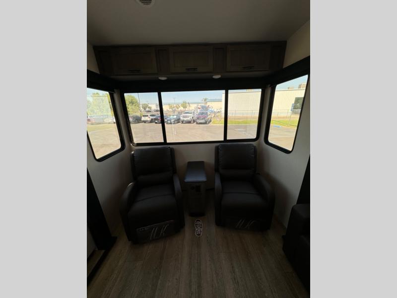 This fifth wheel is perfect for couple's but also has enough space for company too! The rear living area features two recliners with a middle table side to set your cup of coffee, a tri-fold sofa that can transform into an extra sleeping space, and free standing table with chairs and storage ottoman seat to enjoy your meals by the electric fireplace. The fully equipped kitchen has everything you need including a counter peninsula, 12V refrigerator, and plenty of storage. After a fun-filled day at the beach, rinse off in the full bathroom that includes a spacious shower, porcelain toilet, and convenient shower caddy. The front private bedroom has a queen bed to lay your head on at night and there is even USB ports on either side to charge your electronics!