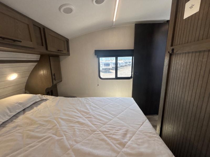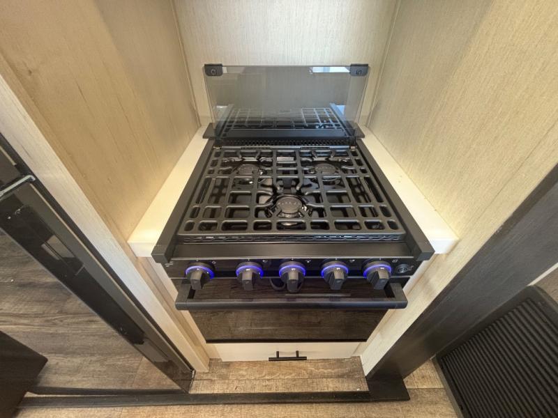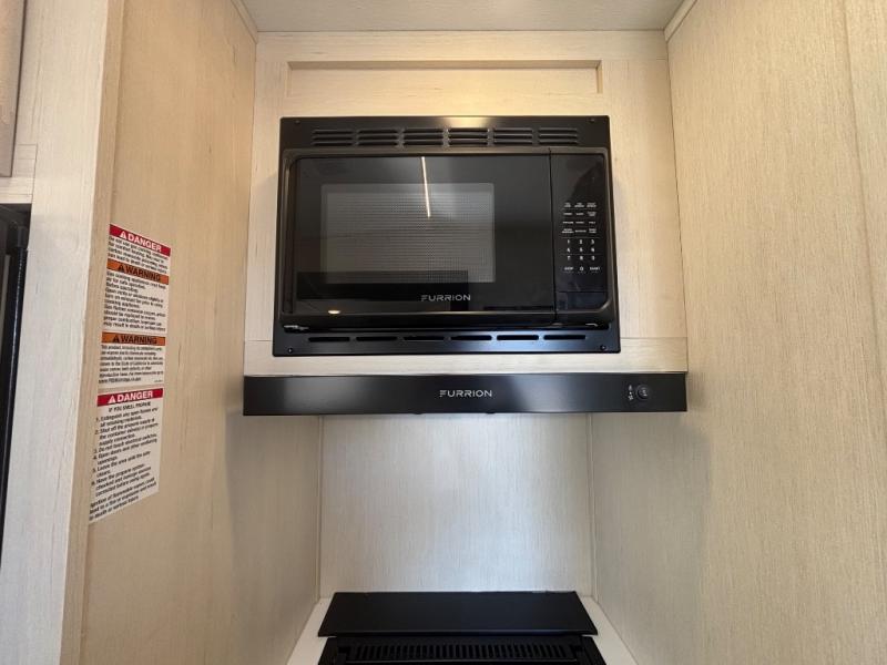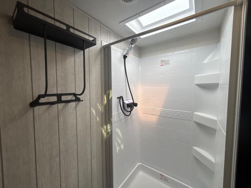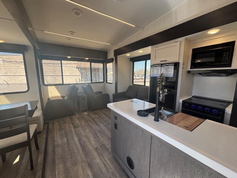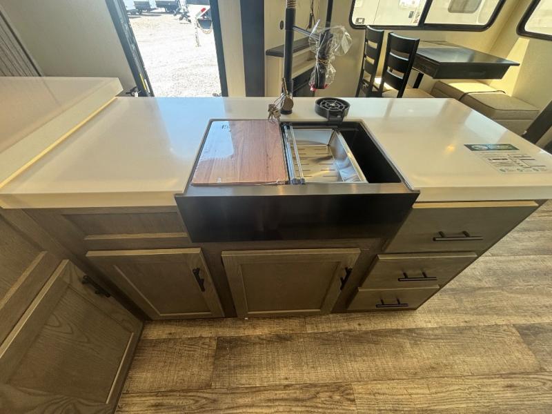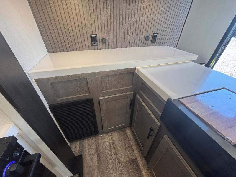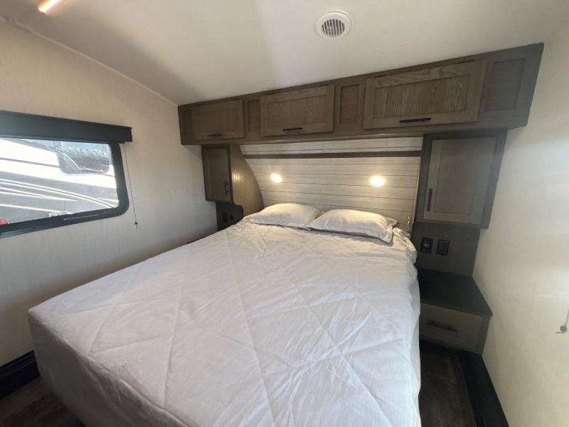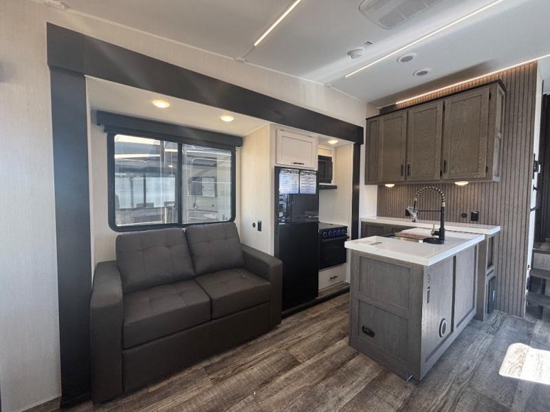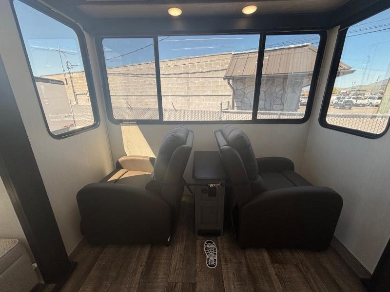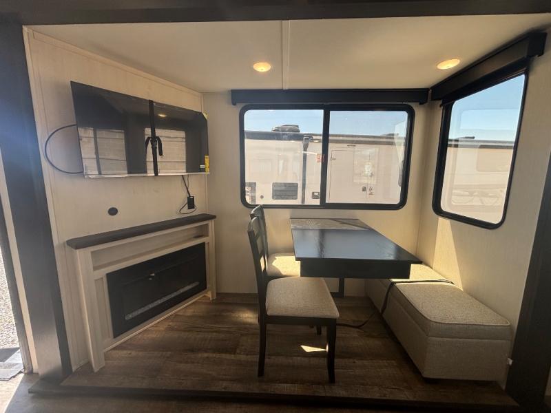 This fifth wheel is perfect for couple's but also has enough space for company too! The rear living area features two recliners with a middle table side to set your cup of coffee, a tri-fold sofa that can transform into an extra sleeping space, and free standing table with chairs and storage ottoman seat to enjoy your meals by the electric fireplace. The fully equipped kitchen has everything you need including a counter peninsula, 12V refrigerator, and plenty of storage. After a fun-filled day at the beach, rinse off in the full bathroom that includes a spacious shower, porcelain toilet, and convenient shower caddy. The front private bedroom has a queen bed to lay your head on at night and there is even USB ports on either side to charge your electronics!