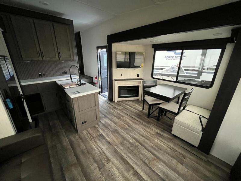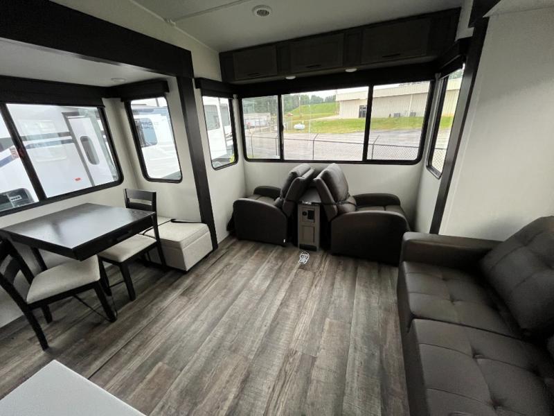 This fifth wheel is perfect for couple's but also has enough space for company too! The rear living area features two recliners with a middle table side to set your cup of coffee, a tri-fold sofa that can transform into an extra sleeping space, and free standing table with chairs and storage ottoman seat to enjoy your meals by the electric fireplace. The fully equipped kitchen has everything you need including a counter peninsula, 12V refrigerator, and plenty of storage. After a fun-filled day at the beach, rinse off in the full bathroom that includes a spacious shower, porcelain toilet, and convenient shower caddy. The front private bedroom has a queen bed to lay your head on at night and there is even USB ports on either side to charge your electronics!
