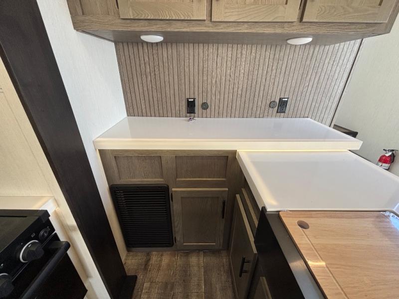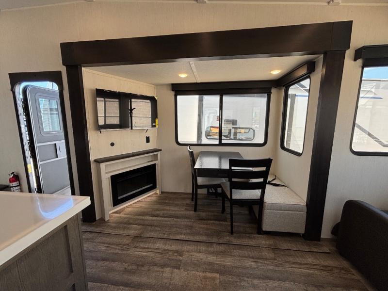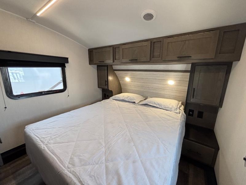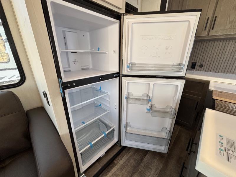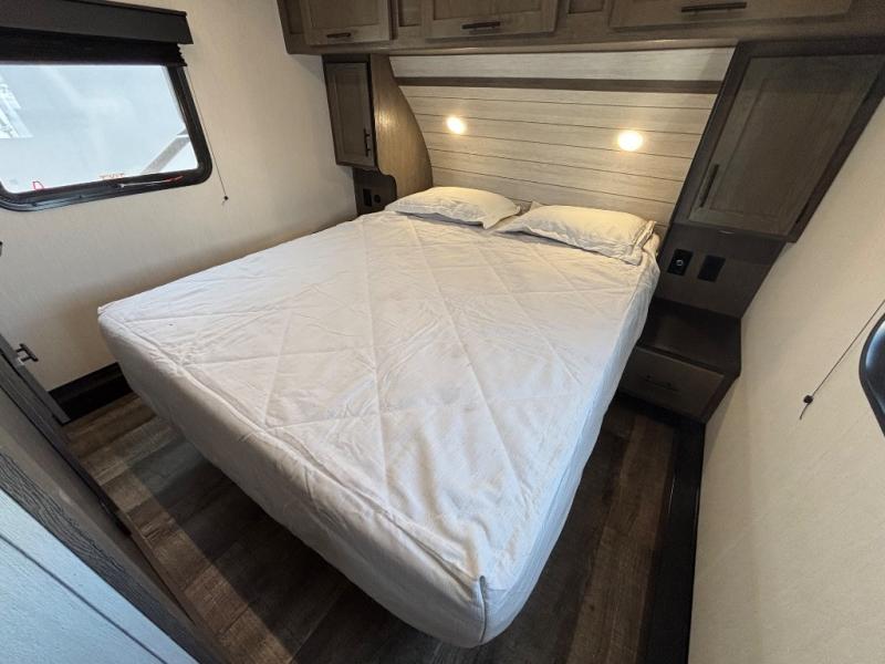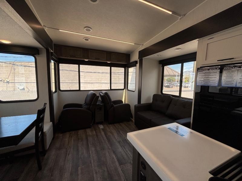 This fifth wheel is perfect for couple's but also has enough space for company too! The rear living area features two recliners with a middle table side to set your cup of coffee, a tri-fold sofa that can transform into an extra sleeping space, and free standing table with chairs and storage ottoman seat to enjoy your meals by the electric fireplace. The fully equipped kitchen has everything you need including a counter peninsula, 12V refrigerator, and plenty of storage. After a fun-filled day at the beach, rinse off in the full bathroom that includes a spacious shower, porcelain toilet, and convenient shower caddy. The front private bedroom has a queen bed to lay your head on at night and there is even USB ports on either side to charge your electronics!