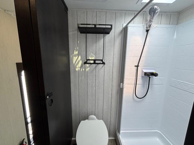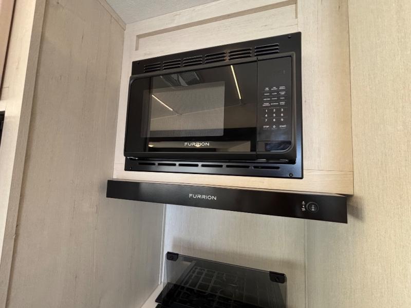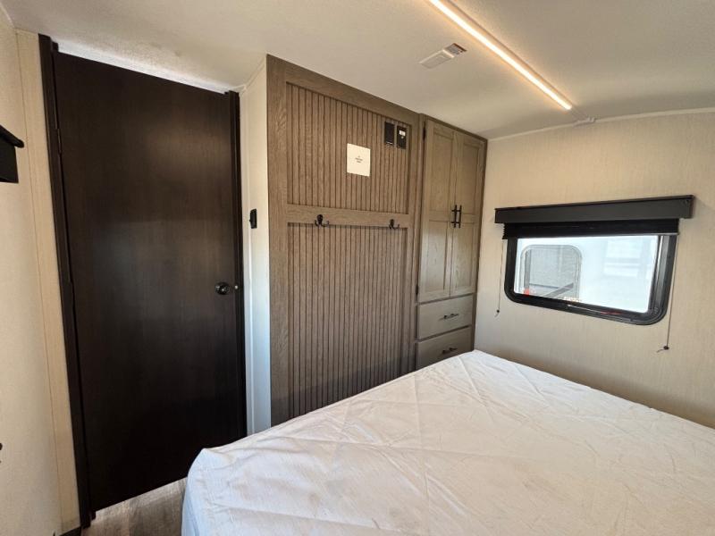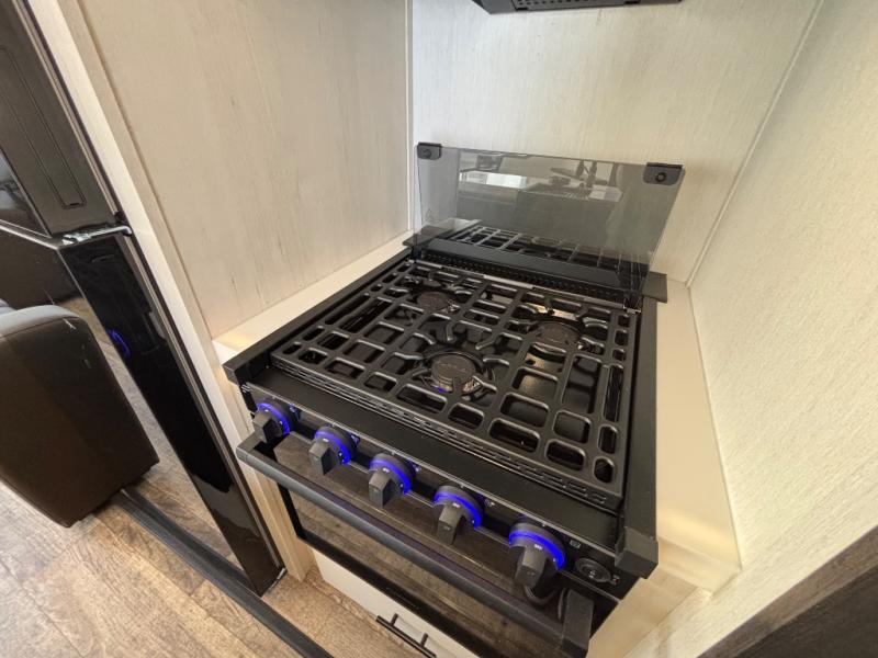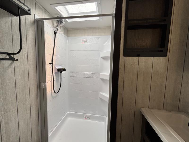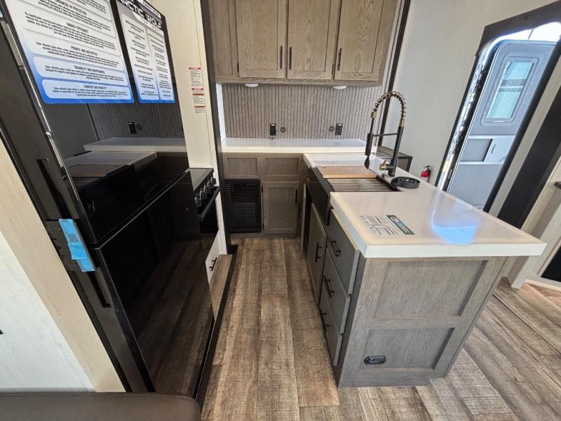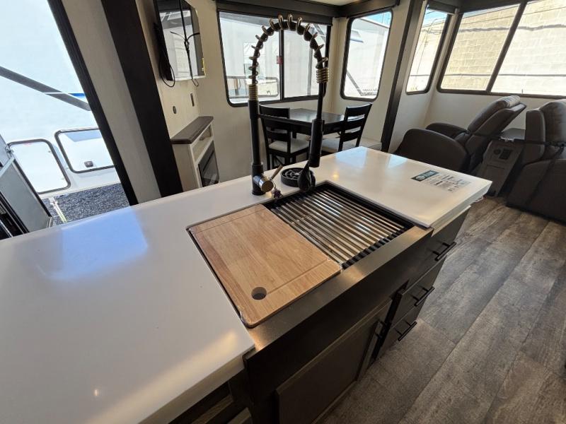 This fifth wheel is perfect for couple's but also has enough space for company too! The rear living area features two recliners with a middle table side to set your cup of coffee, a tri-fold sofa that can transform into an extra sleeping space, and free standing table with chairs and storage ottoman seat to enjoy your meals by the electric fireplace. The fully equipped kitchen has everything you need including a counter peninsula, 12V refrigerator, and plenty of storage. After a fun-filled day at the beach, rinse off in the full bathroom that includes a spacious shower, porcelain toilet, and convenient shower caddy. The front private bedroom has a queen bed to lay your head on at night and there is even USB ports on either side to charge your electronics!
