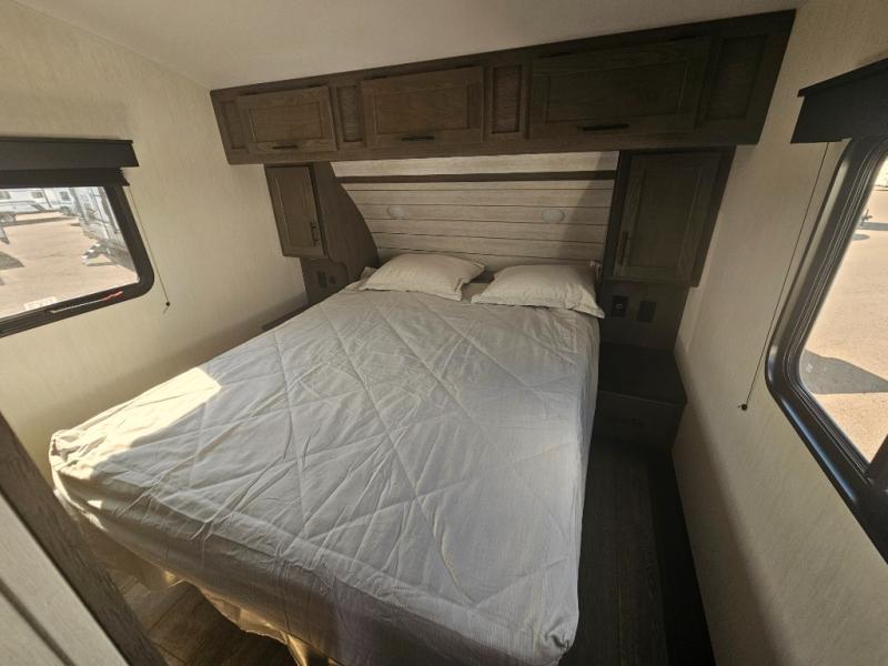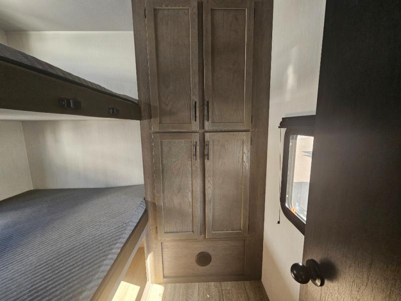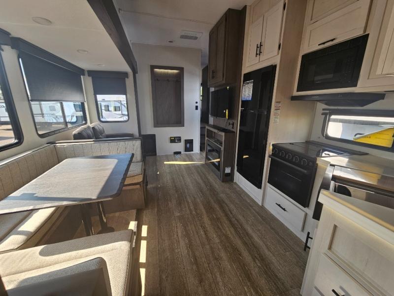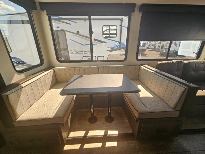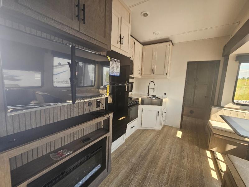 Let the fun times begin with the purchase of this Cherokee Arctic Wolf fifth wheel! You'll have loads of sleeping space for ten tired travelers with the front private bedroom, rear private bunkhouse, U-shaped dinette, and tri-fold sofa. You'll also have excellent storage space with the bunkhouse wardrobe, large walk-in pantry next to the entry door, and the outside storage areas. The large slide in the main living area offers more living space, and the fireplace will make it feel more like home.