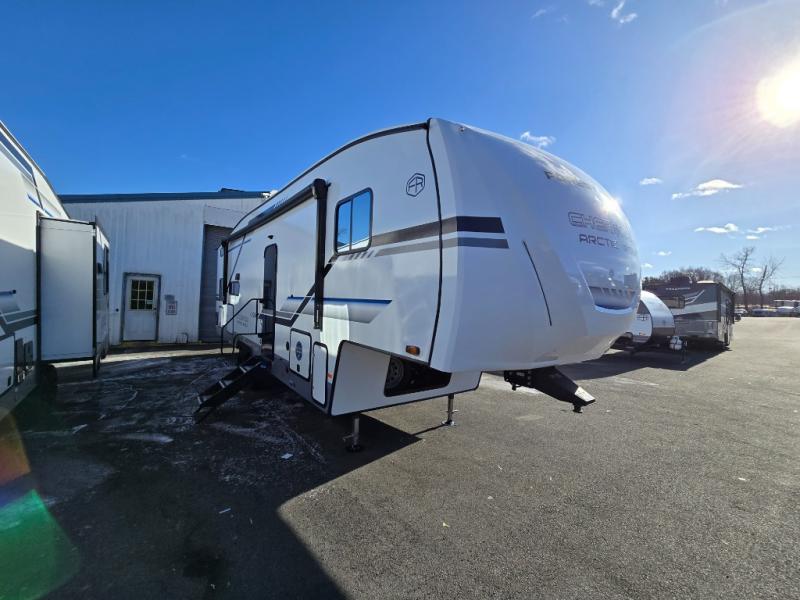 You'll have the very best time tackling outdoor adventures with the Forest River Cherokee Arctic Wolf fifth wheel! Each model has been constructed with a “ToughBend” rigid skirt metal design, Leash Latch pet safety technology, an outside shower with hot/cold water, and a 1x engineered wood “SuperTruss” roof structure with 3/8" decking for added durability. There is also an automatic leveling and stabilization system, slam latch storage doors with "Safety Stay" magnets, plus 12V heat pads on all holding tanks with help withstand colder temperatures. Inside, you'll love the solid surface kitchen countertops with underlighting, along with a carpetless floor design, and fully adjustable, slow rise, blackout roller shades. The on-demand tankless hot water heater will provide endless hot water and the central A/C unit with Quick Cool will ensure your comfort during those hot summer camping months. There are many more stand-out features found on these fifth wheels; check them out!