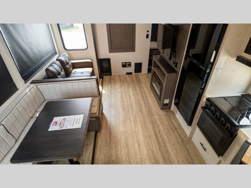 Let the fun times begin with the purchase of this Cherokee Arctic Wolf fifth wheel! You'll have loads of sleeping space for ten tired travelers with the front private bedroom, rear private bunkhouse, U-shaped dinette, and tri-fold sofa. You'll also have excellent storage space with the bunkhouse wardrobe, large walk-in pantry next to the entry door, and the outside storage areas. The large slide in the main living area offers more living space, and the fireplace will make it feel more like home.