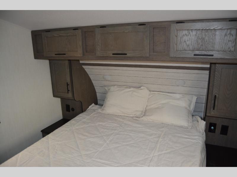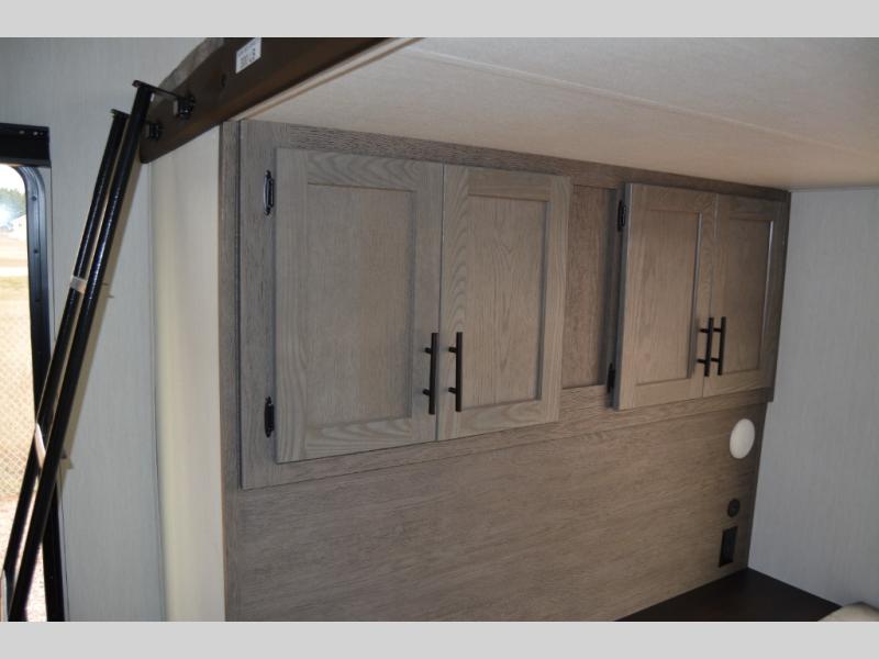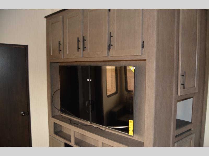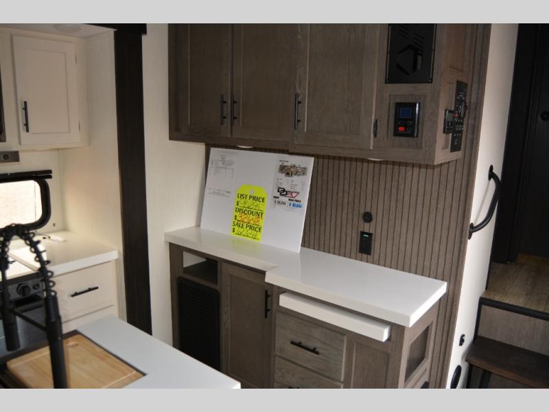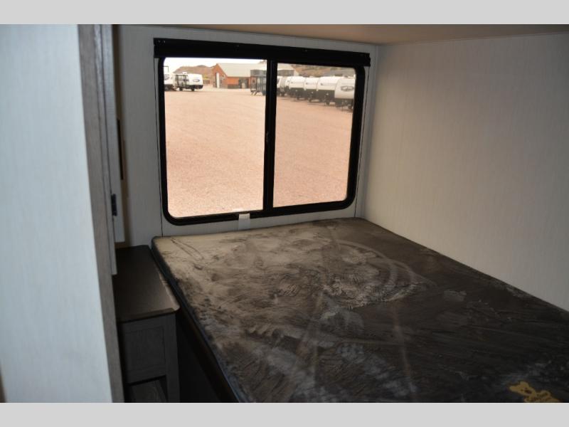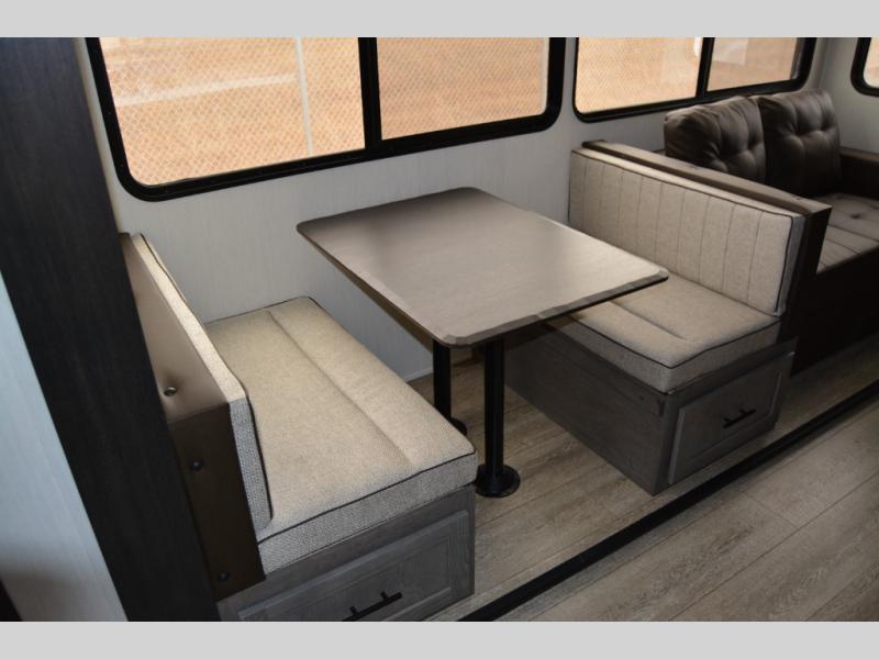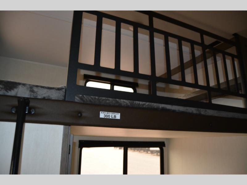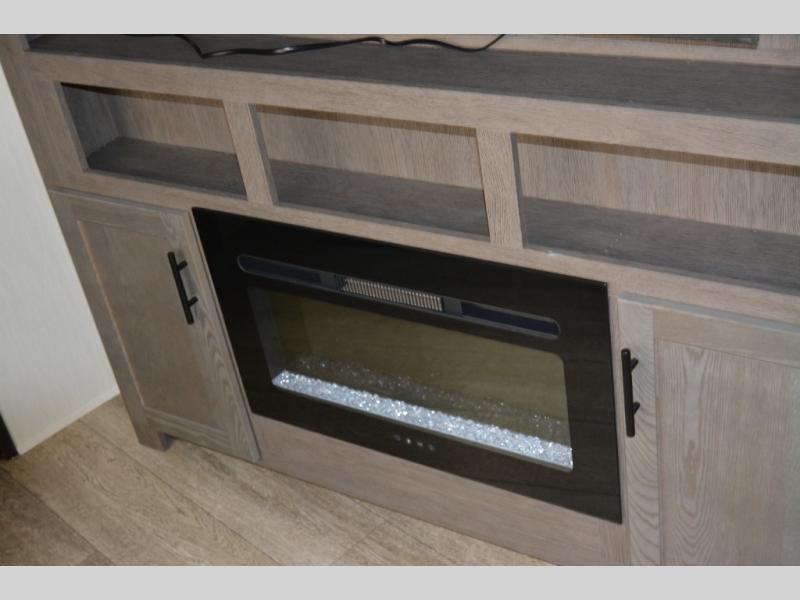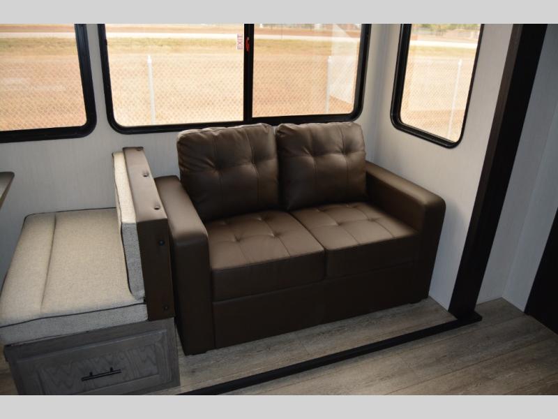 There's not much about this fifth wheel that you won't love! Your guests can claim the rear bunkhouse suite with a 54" x 74" bunk/bed, a 60" x 80" loft bunk, and a half bath for added convenience. You'll have the front private bedroom all to yourselves, and the spacious full bath is close by for easy nighttime use. Everyone can meet in the combined kitchen and living area that is made open thanks to the dual opposing slides. There is also a kitchen island with a trash can, a pull-out countertop extension, a booth dinette, and a tri-fold sofa across from the fireplace; how cozy!