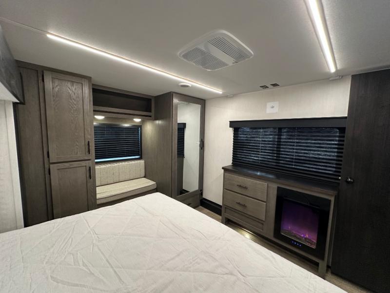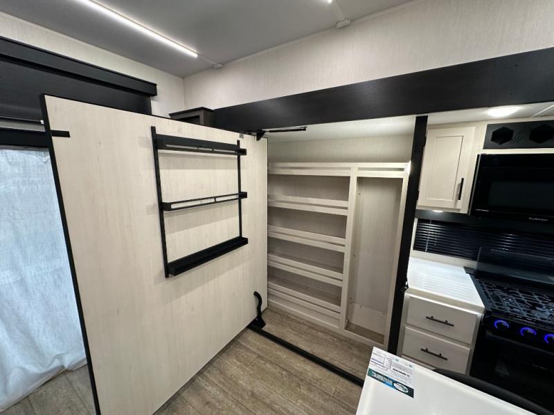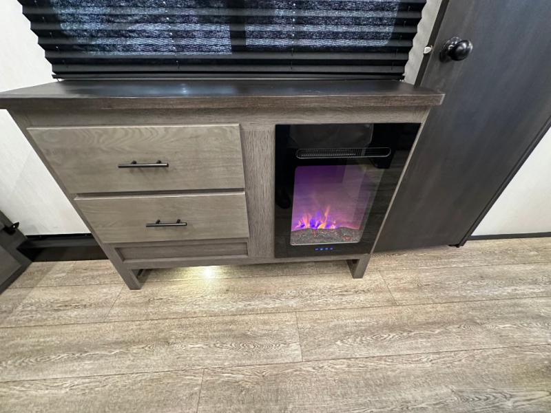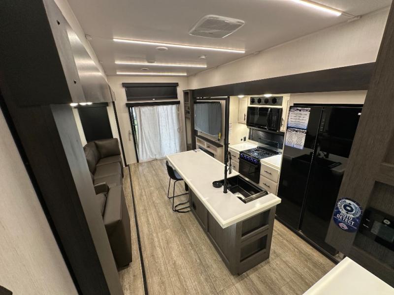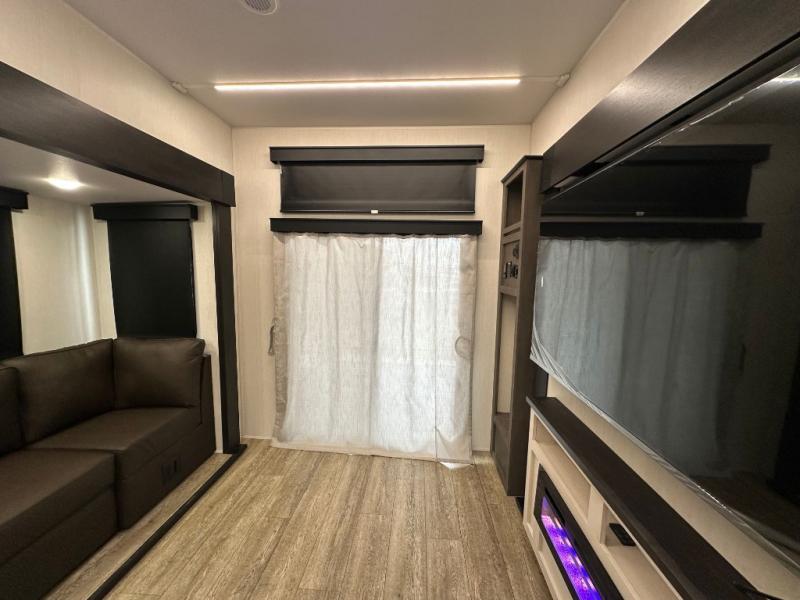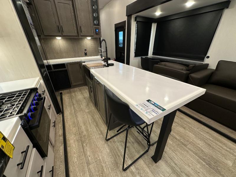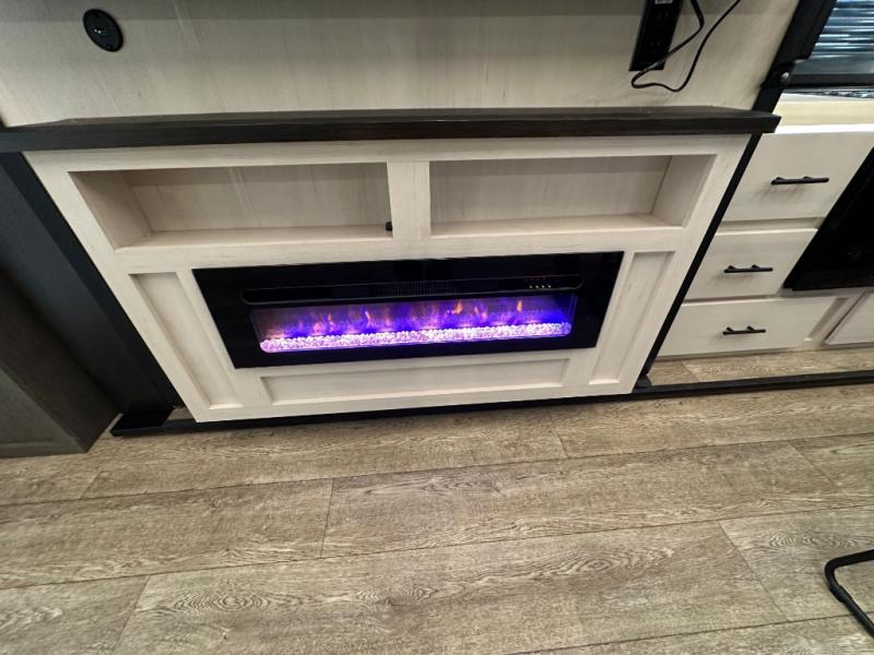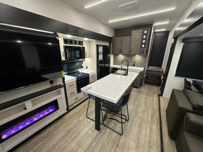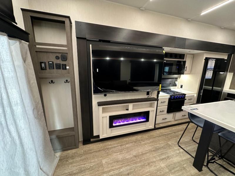 You're going to love camping in this triple slide out fifth wheel that is packed with amenities! The rear deck with a covered patio will provide a place to visit with campground neighbors, and inside, there is an L-shaped tri-fold sofa where guests can sleep. You'll find a king bed slide in the front master bedroom for you, along with a front bench seat, a bedroom fireplace, plus washer and dryer prep if you choose to add these appliances. The kitchen is any chef's dream with its large island with two chairs, pull-out countertop extension, spacious 16 cu. ft. refrigerator, plus a hidden pantry behind the TV for all the dry goods.