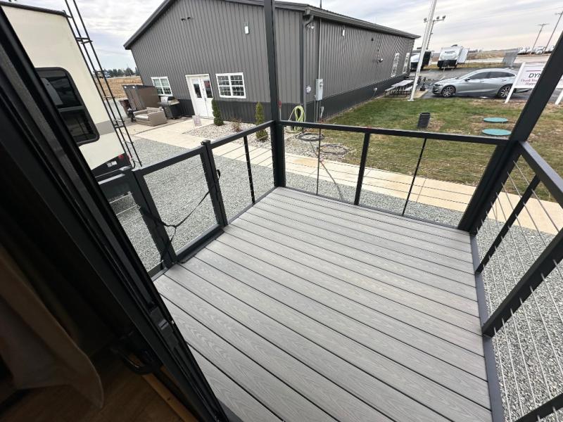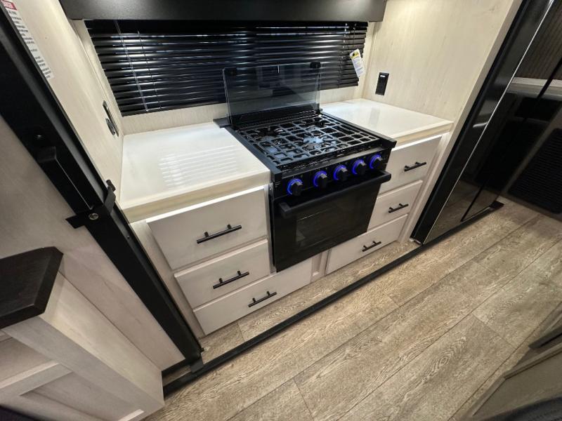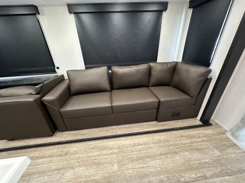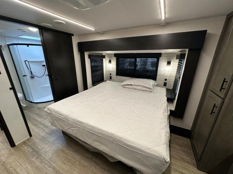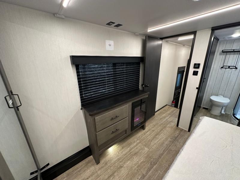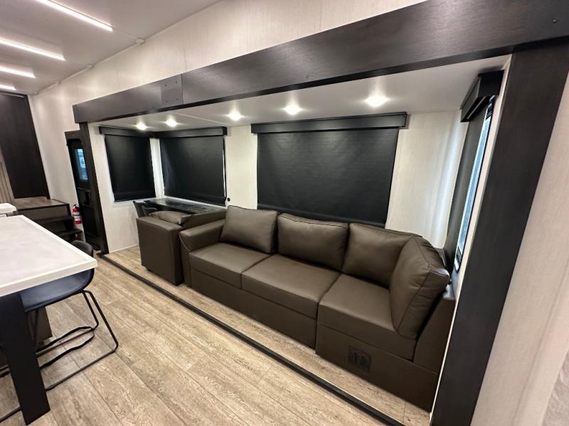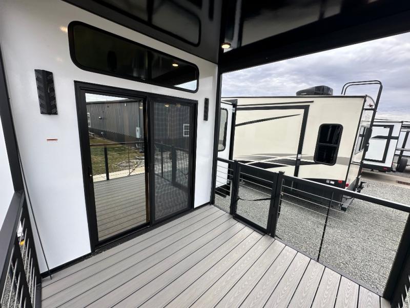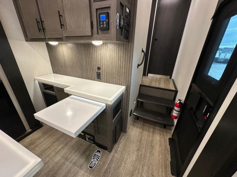 You're going to love camping in this triple slide out fifth wheel that is packed with amenities! The rear deck with a covered patio will provide a place to visit with campground neighbors, and inside, there is an L-shaped tri-fold sofa where guests can sleep. You'll find a king bed slide in the front master bedroom for you, along with a front bench seat, a bedroom fireplace, plus washer and dryer prep if you choose to add these appliances. The kitchen is any chef's dream with its large island with two chairs, pull-out countertop extension, spacious 16 cu. ft. refrigerator, plus a hidden pantry behind the TV for all the dry goods.