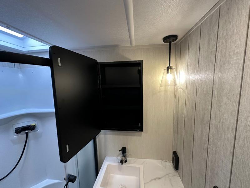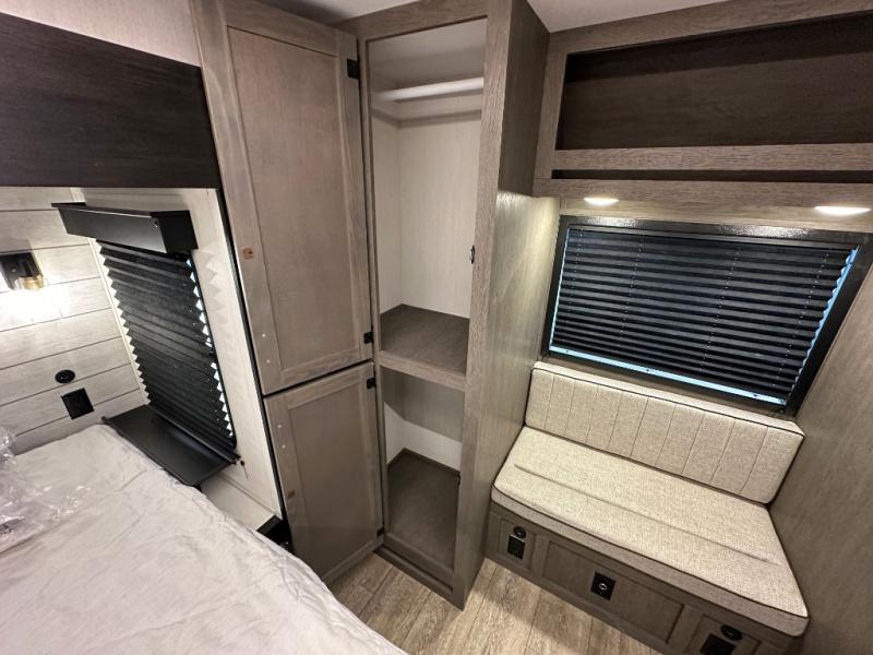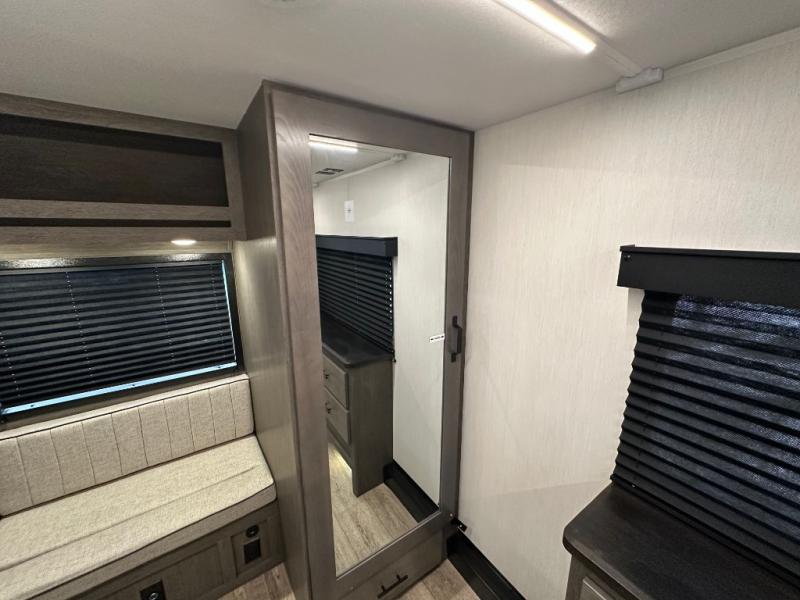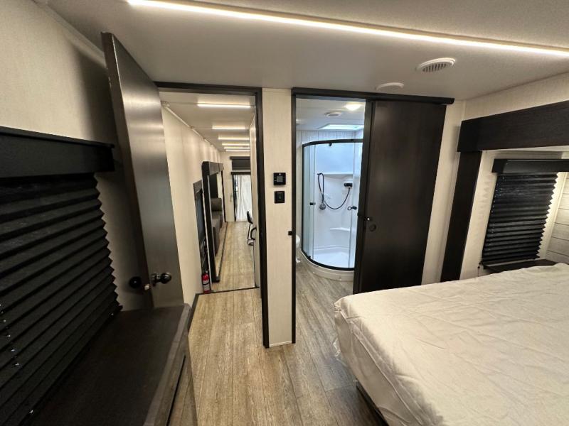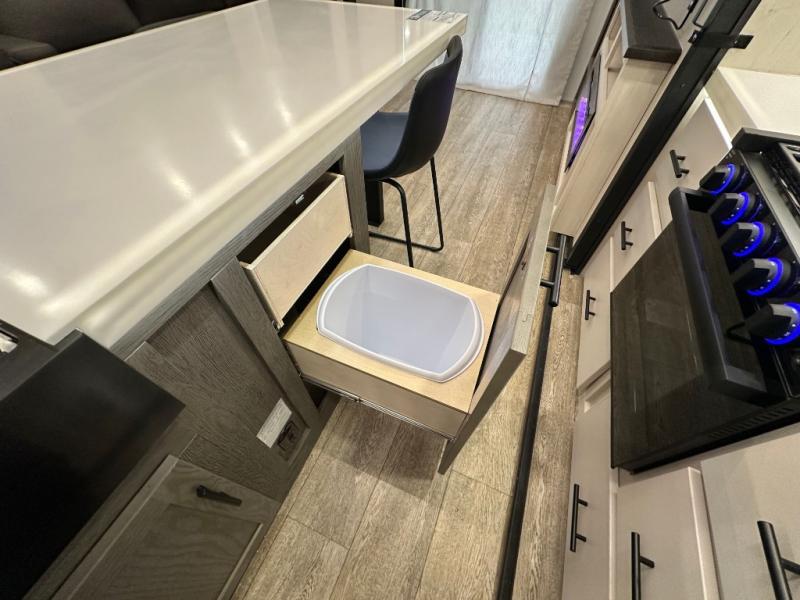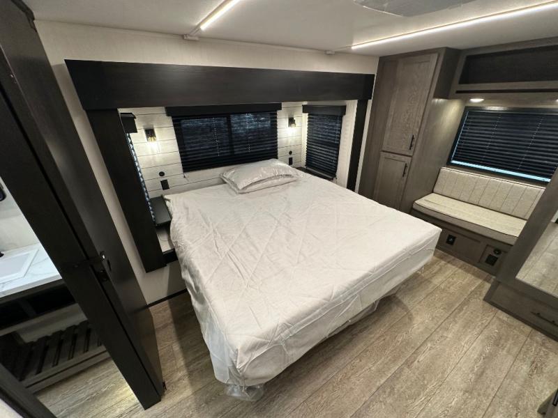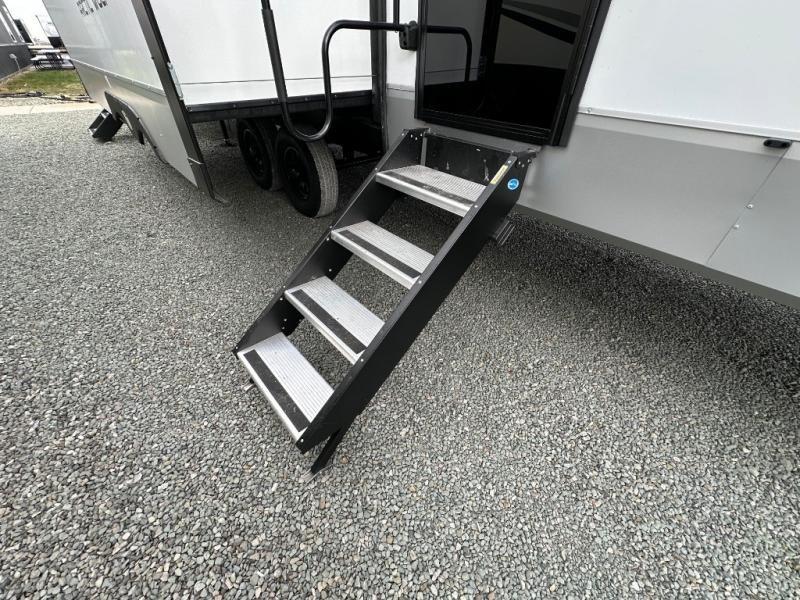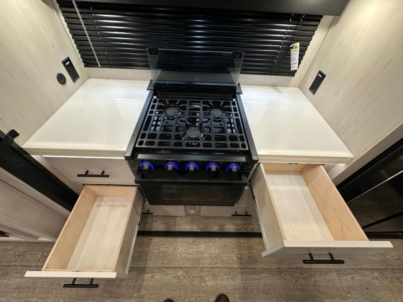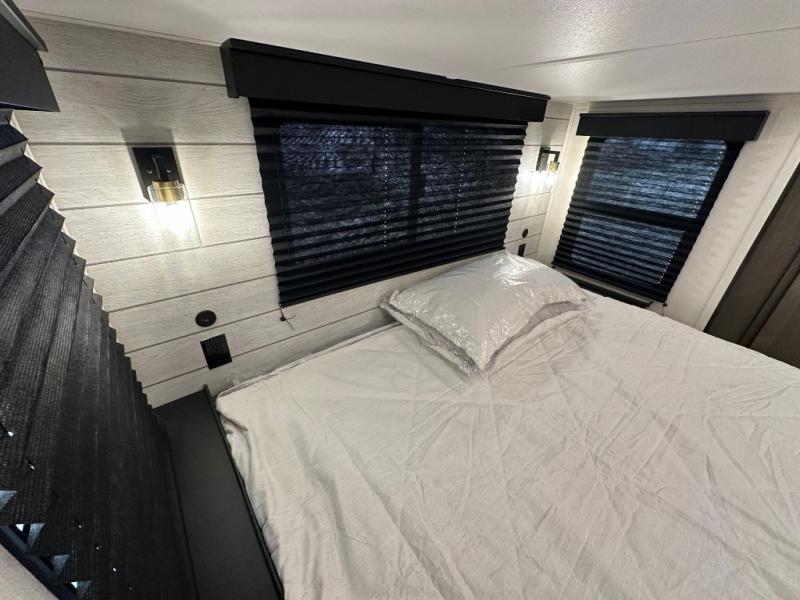 You're going to love camping in this triple slide out fifth wheel that is packed with amenities! The rear deck with a covered patio will provide a place to visit with campground neighbors, and inside, there is an L-shaped tri-fold sofa where guests can sleep. You'll find a king bed slide in the front master bedroom for you, along with a front bench seat, a bedroom fireplace, plus washer and dryer prep if you choose to add these appliances. The kitchen is any chef's dream with its large island with two chairs, pull-out countertop extension, spacious 16 cu. ft. refrigerator, plus a hidden pantry behind the TV for all the dry goods.