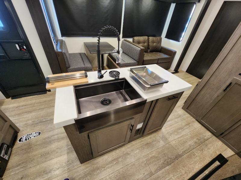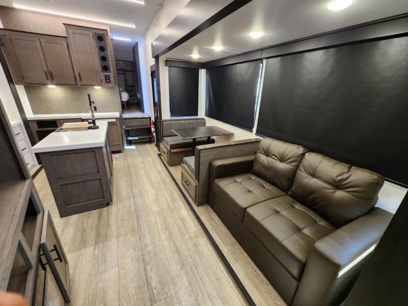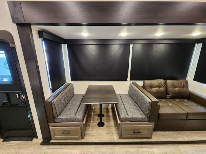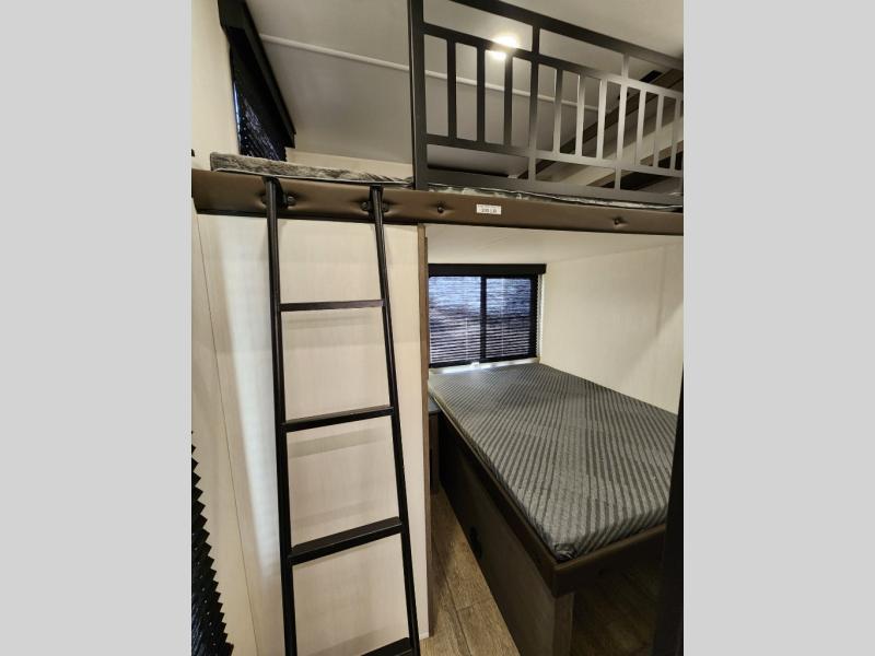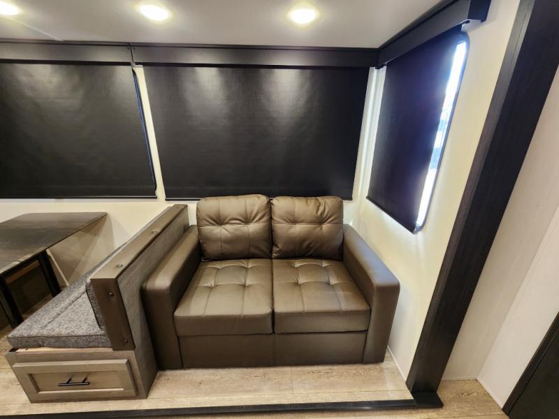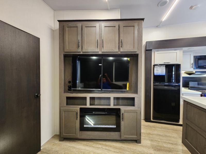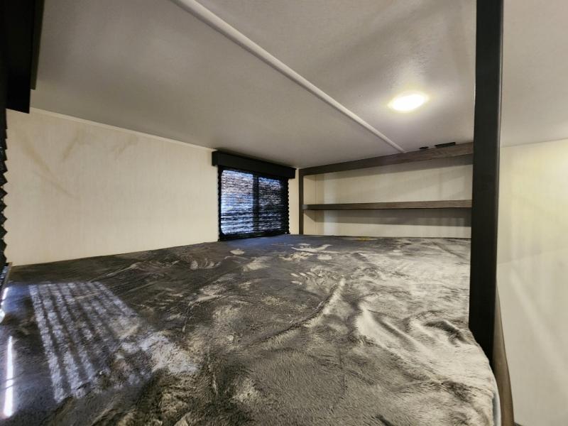 There's not much about this fifth wheel that you won't love! Your guests can claim the rear bunkhouse suite with a 54" x 74" bunk/bed, a 60" x 80" loft bunk, and a half bath for added convenience. You'll have the front private bedroom all to yourselves, and the spacious full bath is close by for easy nighttime use. Everyone can meet in the combined kitchen and living area that is made open thanks to the dual opposing slides. There is also a kitchen island with a trash can, a pull-out countertop extension, a booth dinette, and a tri-fold sofa across from the fireplace; how cozy!