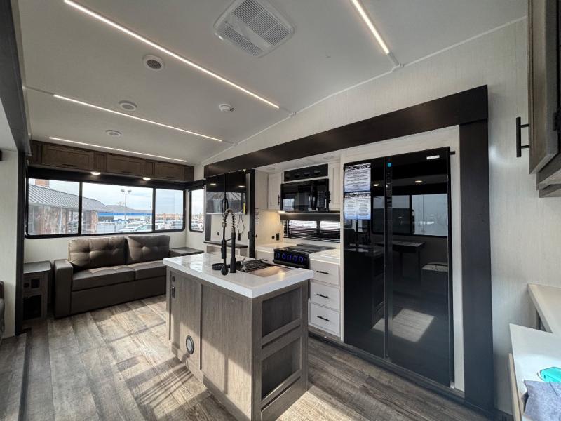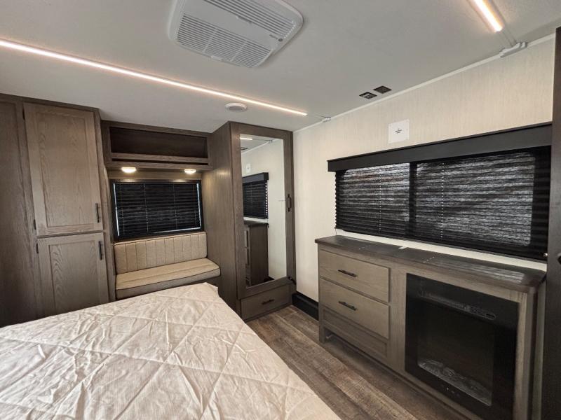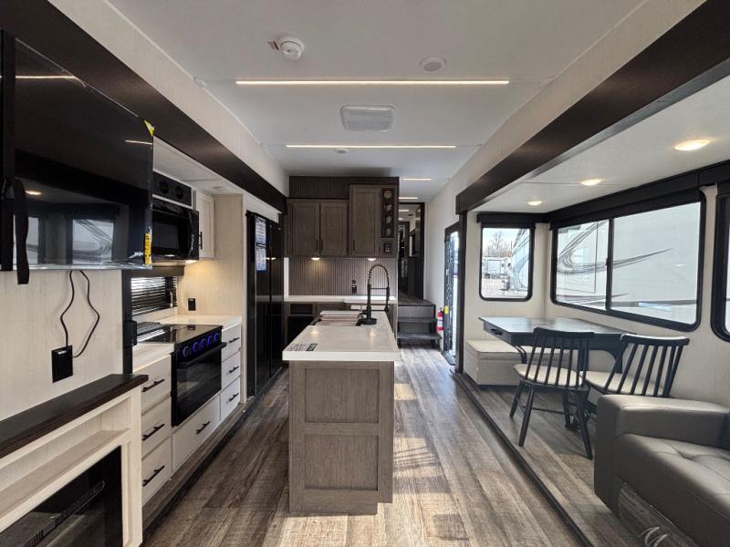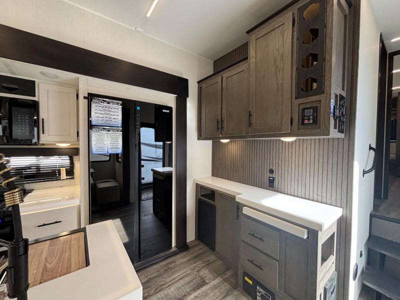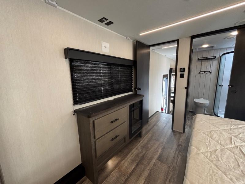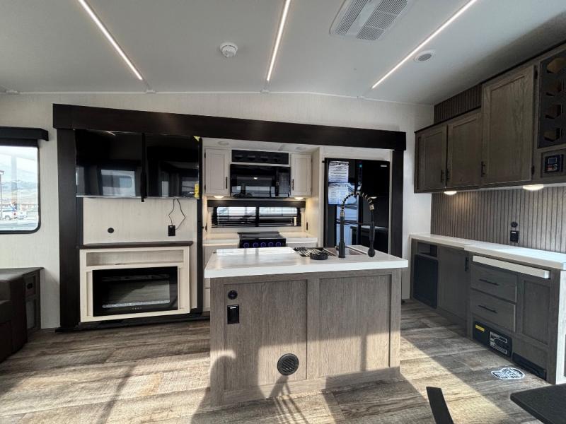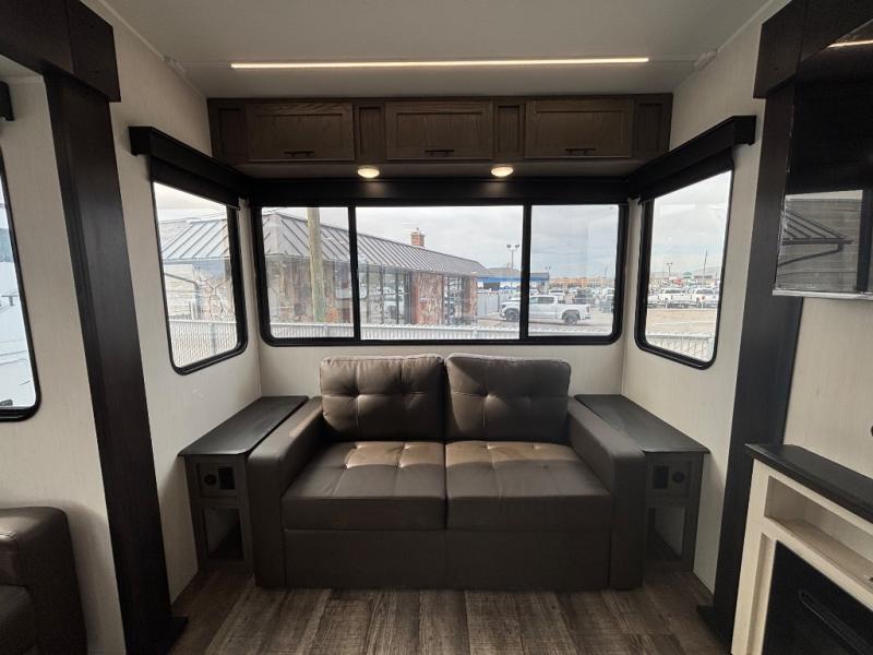 This Cherokee Arctic Wolf Suite fifth wheel is quite extraordinary and accommodating! It has a set of opposing slides in the main living area so you can have more space to sit back on the theater seating and tri-fold sofa. You can switch on the fireplace to add some warmth to this space if it's a cool night. The free-standing table and chairs is going to be great for sitting down to eat a meal together, and there is even a storage ottoman seat for board games or throw blankets. You'll also be able to grab dessert from the large hidden pantry closet to go with your coffee. The private bedroom up front is going to provide great relaxation with its king bed slide. The spacious wardrobe includes a sun bench as well as washer/dryer prep, and there's even a second fireplace in the bedroom for the ultimate in coziness.