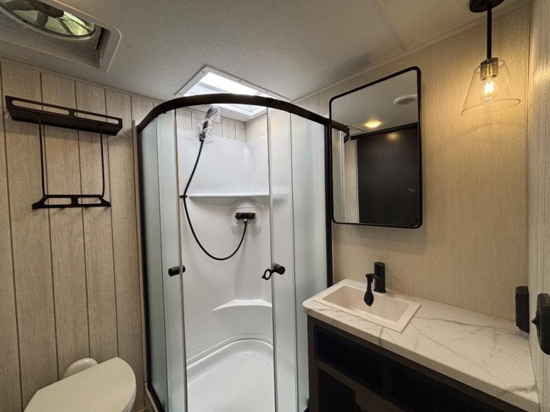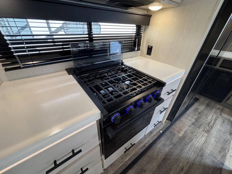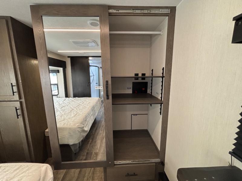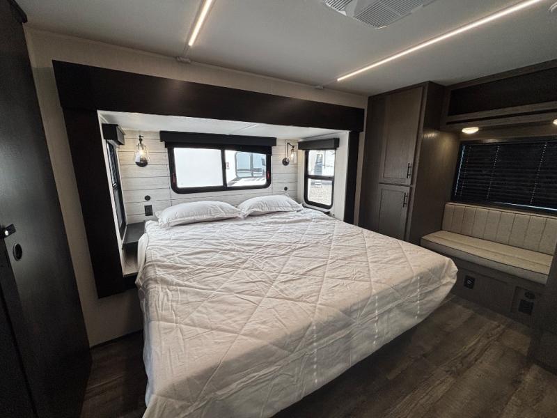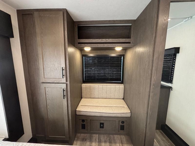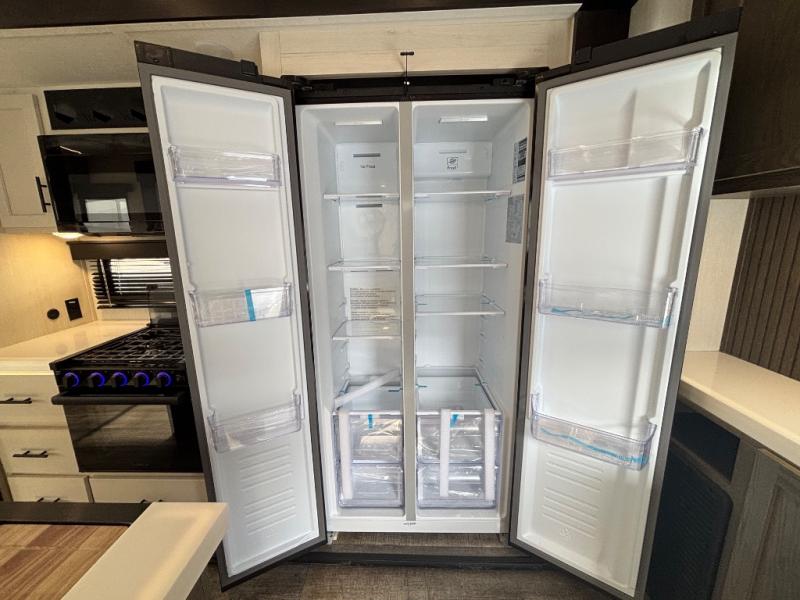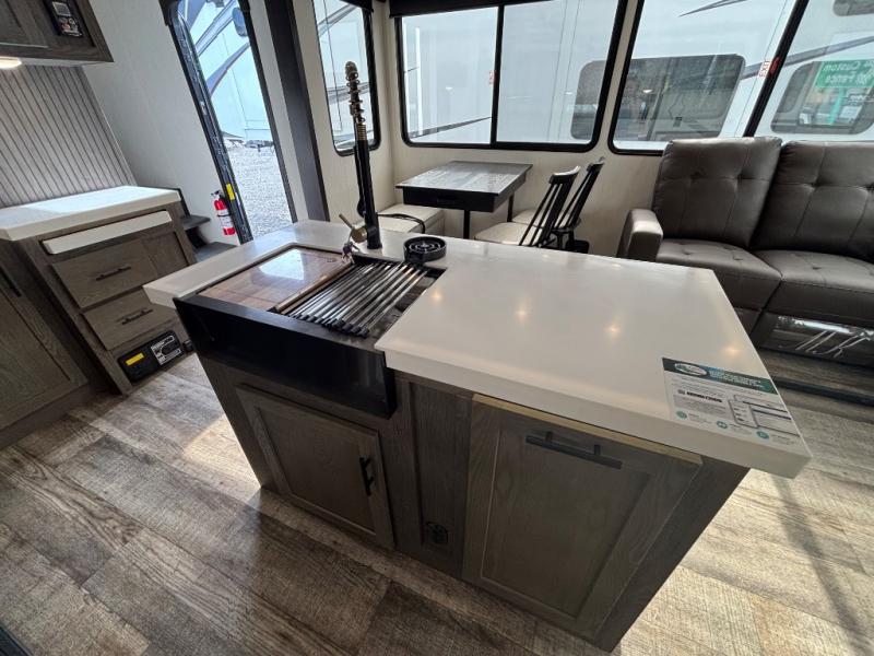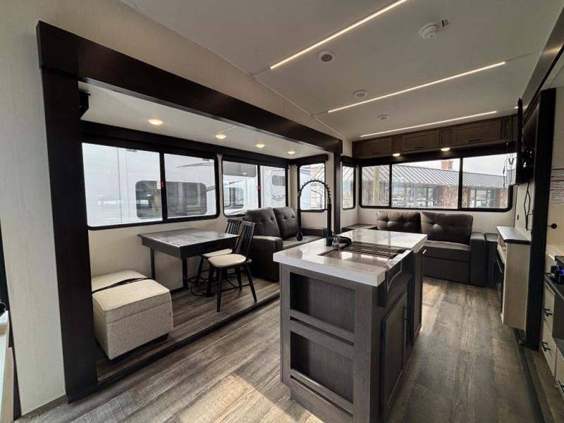 This Cherokee Arctic Wolf Suite fifth wheel is quite extraordinary and accommodating! It has a set of opposing slides in the main living area so you can have more space to sit back on the theater seating and tri-fold sofa. You can switch on the fireplace to add some warmth to this space if it's a cool night. The free-standing table and chairs is going to be great for sitting down to eat a meal together, and there is even a storage ottoman seat for board games or throw blankets. You'll also be able to grab dessert from the large hidden pantry closet to go with your coffee. The private bedroom up front is going to provide great relaxation with its king bed slide. The spacious wardrobe includes a sun bench as well as washer/dryer prep, and there's even a second fireplace in the bedroom for the ultimate in coziness.