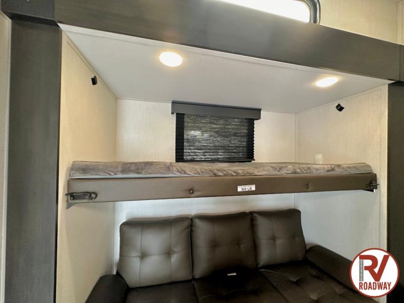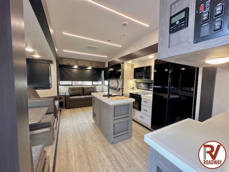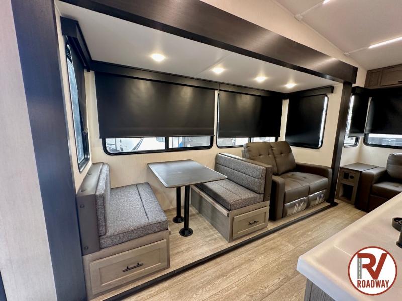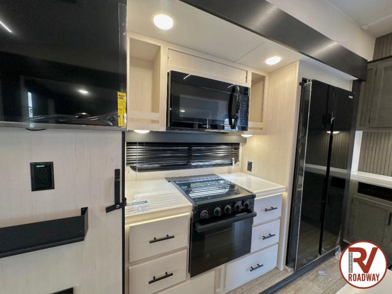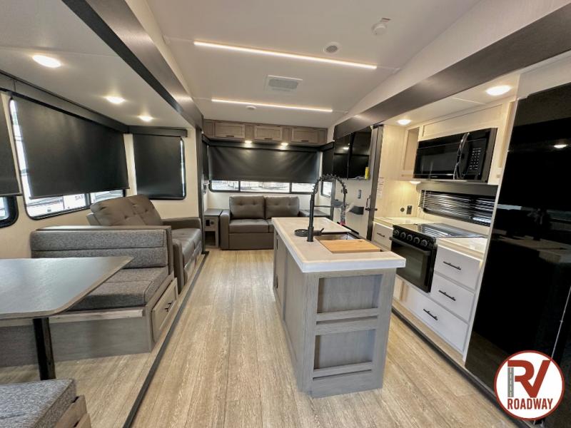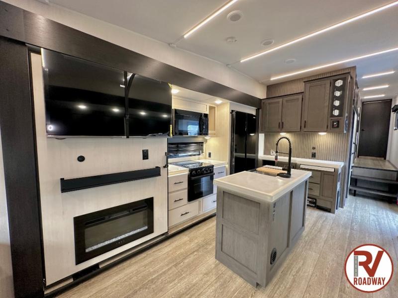 You have excellent sleeping accommodations on this Cherokee Arctic Wolf Suite fifth wheel! There is a private bedroom with a king-size bed at the front for you, and the second bedroom contains two 28" x 72" bunks and a jack knife sofa with trundle for any kids or friends you have traveling with you. A desk provides space to work or study. And it doesn't stop there. There is also a tri-fold sofa in the living area that you can use as a sleeping space. The kitchen is ready for you to make meals on the three-burner range, and you have plenty of work space with a pull-out countertop extension. You can enjoy your meals at the dinette, and after dinner relax on the theater seats across from the fireplace.