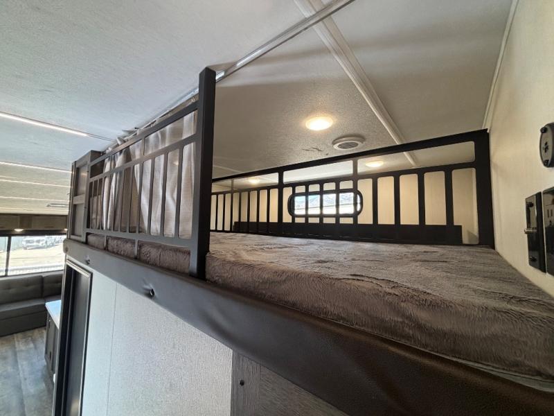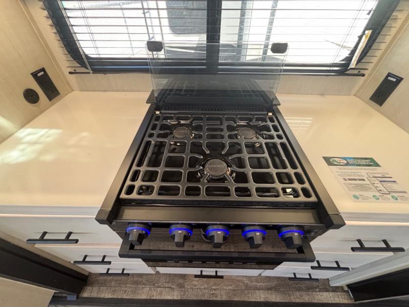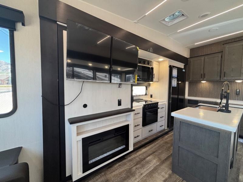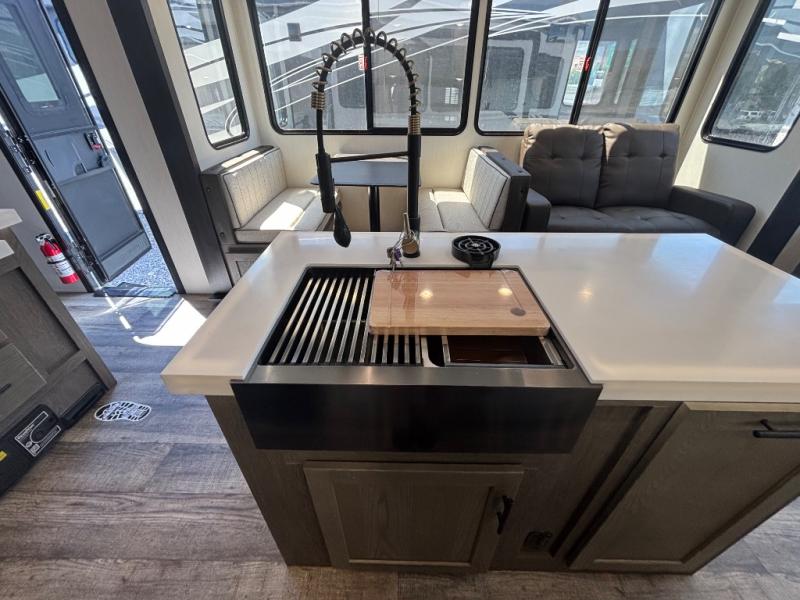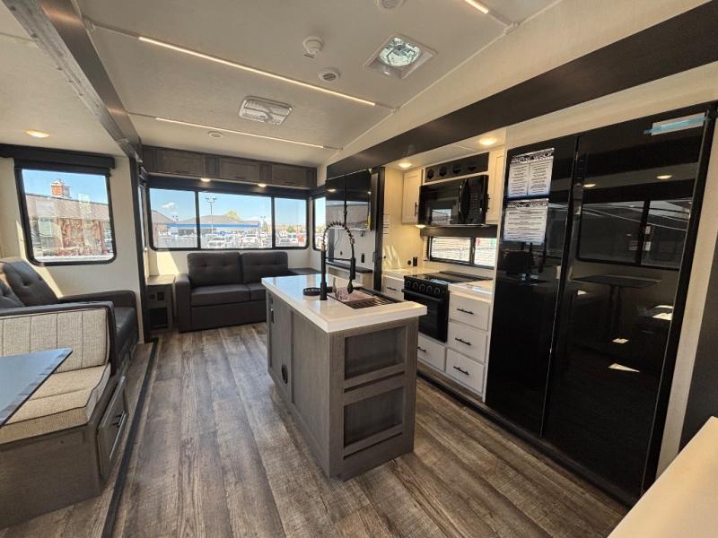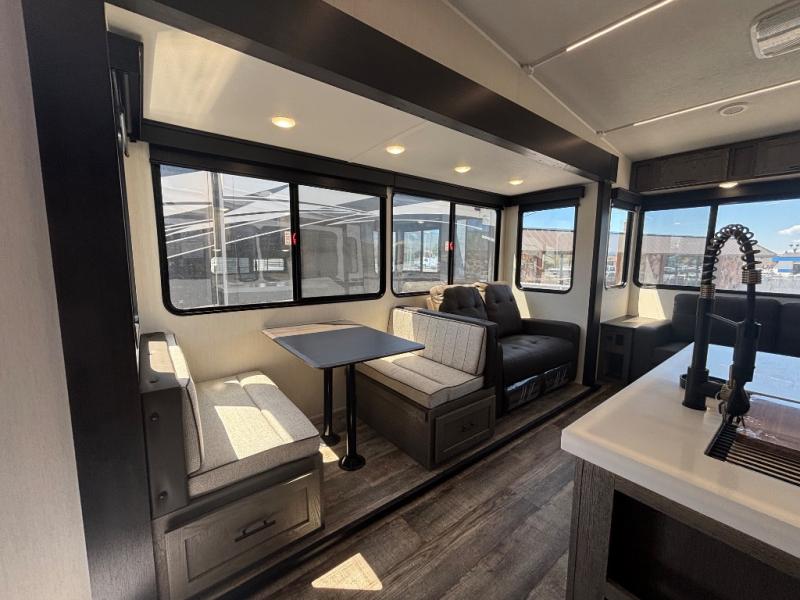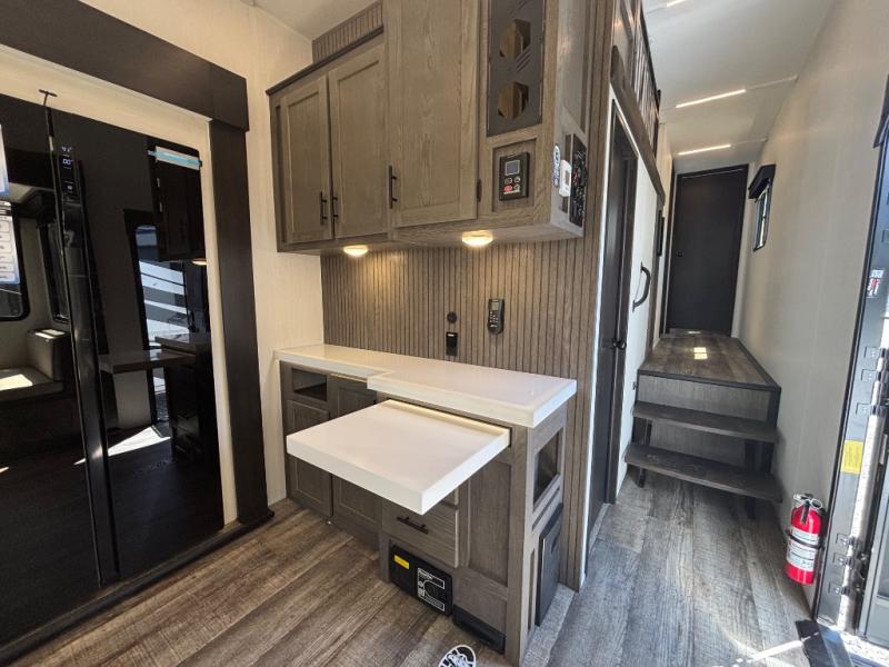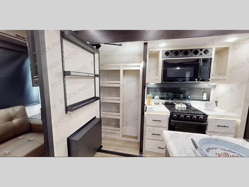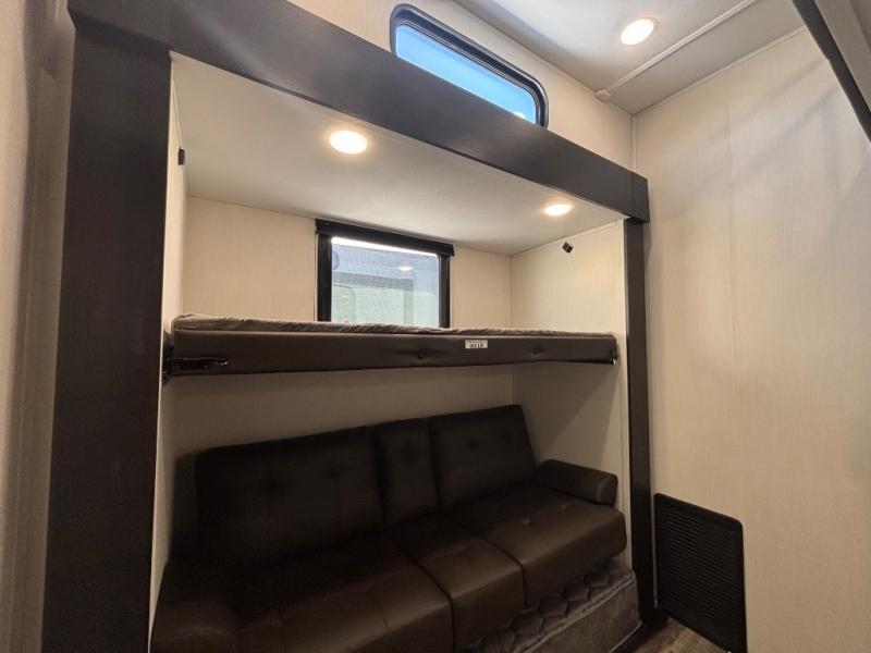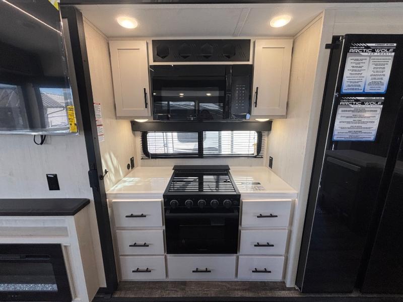 You have excellent sleeping accommodations on this Cherokee Arctic Wolf Suite fifth wheel! There is a private bedroom with a king-size bed at the front for you, and the second bedroom contains two 28" x 72" bunks and a jack knife sofa with trundle for any kids or friends you have traveling with you. A desk provides space to work or study. And it doesn't stop there. There is also a tri-fold sofa in the living area that you can use as a sleeping space. The kitchen is ready for you to make meals on the three-burner range, and you have plenty of work space with a pull-out countertop extension. You can enjoy your meals at the dinette, and after dinner relax on the theater seats across from the fireplace.
