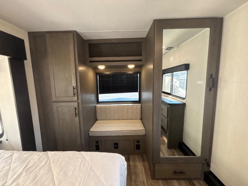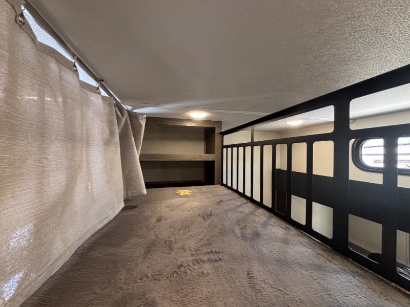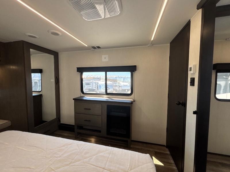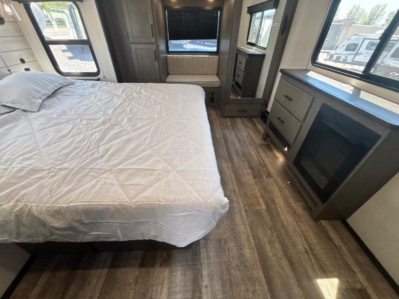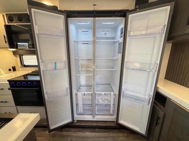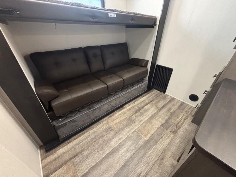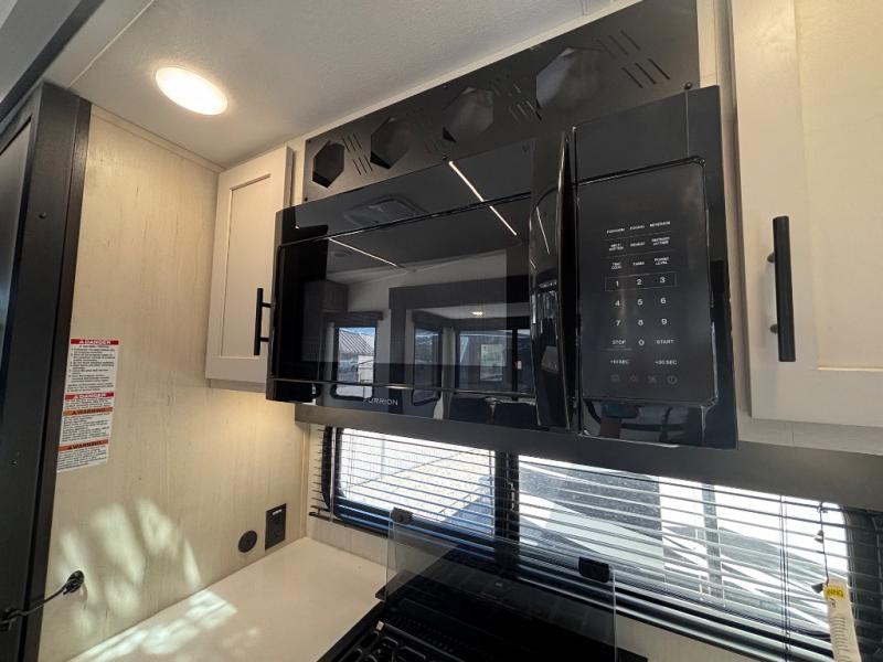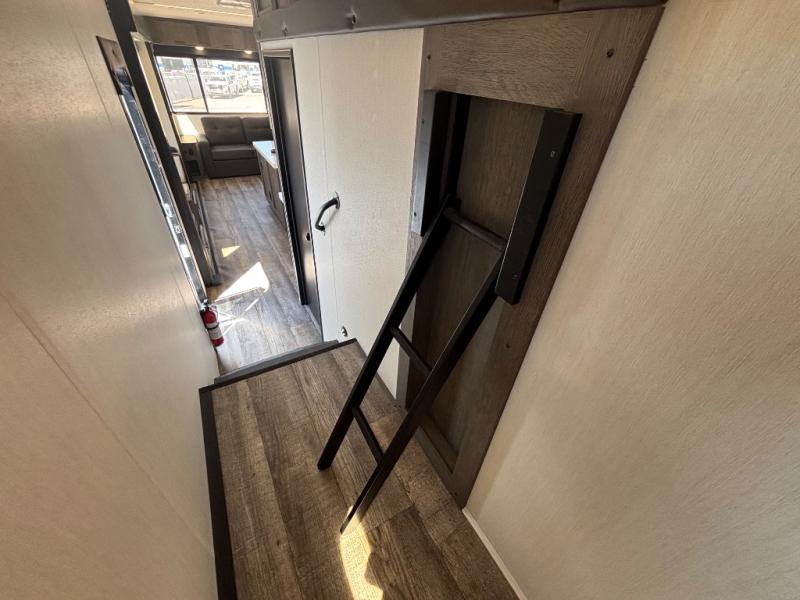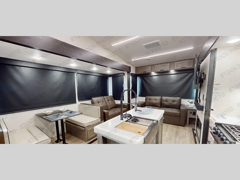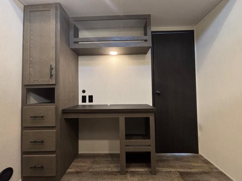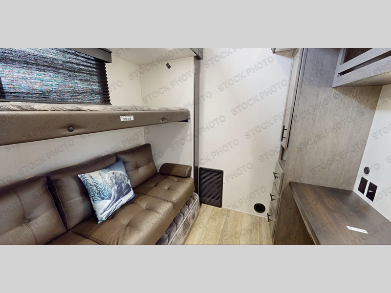 You have excellent sleeping accommodations on this Cherokee Arctic Wolf Suite fifth wheel! There is a private bedroom with a king-size bed at the front for you, and the second bedroom contains two 28" x 72" bunks and a jack knife sofa with trundle for any kids or friends you have traveling with you. A desk provides space to work or study. And it doesn't stop there. There is also a tri-fold sofa in the living area that you can use as a sleeping space. The kitchen is ready for you to make meals on the three-burner range, and you have plenty of work space with a pull-out countertop extension. You can enjoy your meals at the dinette, and after dinner relax on the theater seats across from the fireplace.