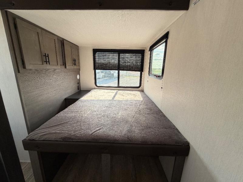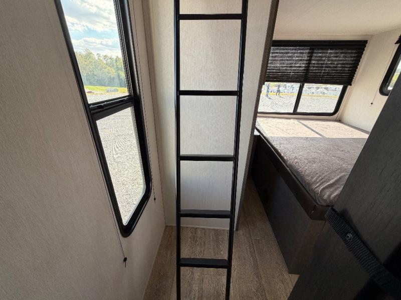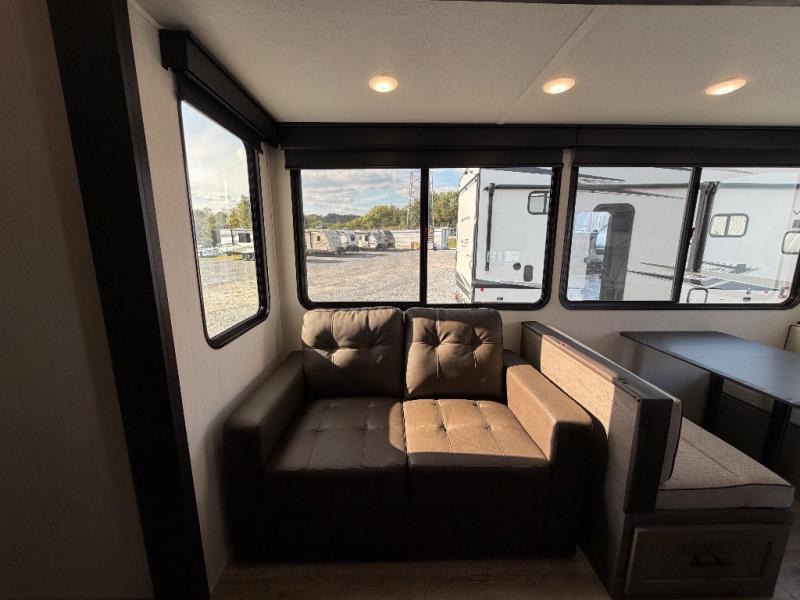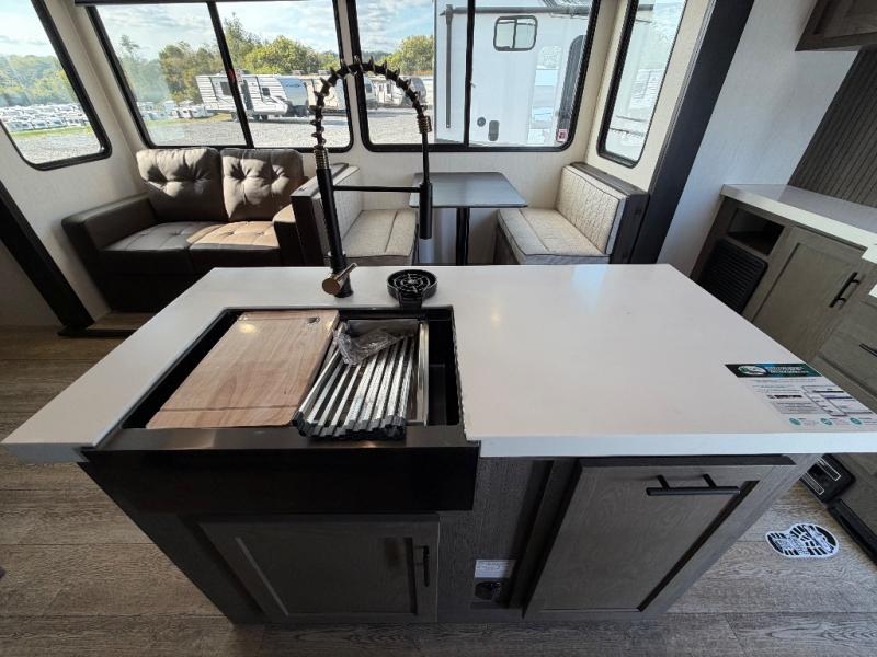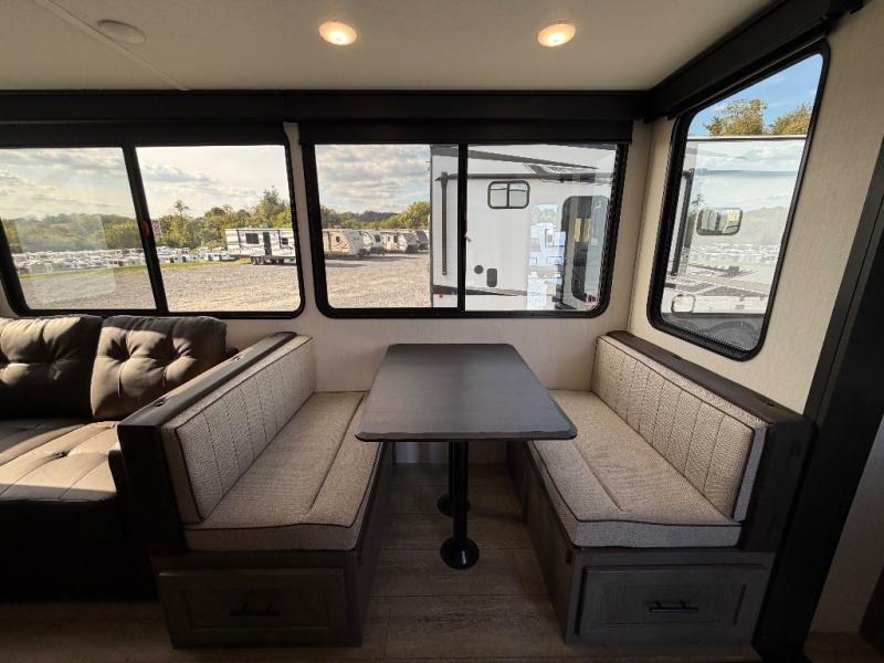 This Cherokee Arctic Wolf Suite fifth wheel is an excellent choice if you have a large family that wants to get away! Not only is there a private bedroom up front for you, but there is also a bedroom suite in the back. This suite has a 54" x 74" bed, a 60" x 80" loft bed, a TV area, a half bathroom all to itself, and the second exterior entry door. What a space! You'll also be highly impressed with the living area because it has a large slide that holds the tri-fold sofa and dinette. The large pantry is another feature you'll appreciate since it can store all of the food needed to feed your group, and the outside kitchen is an added bonus the cook will love!