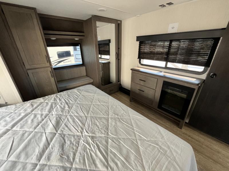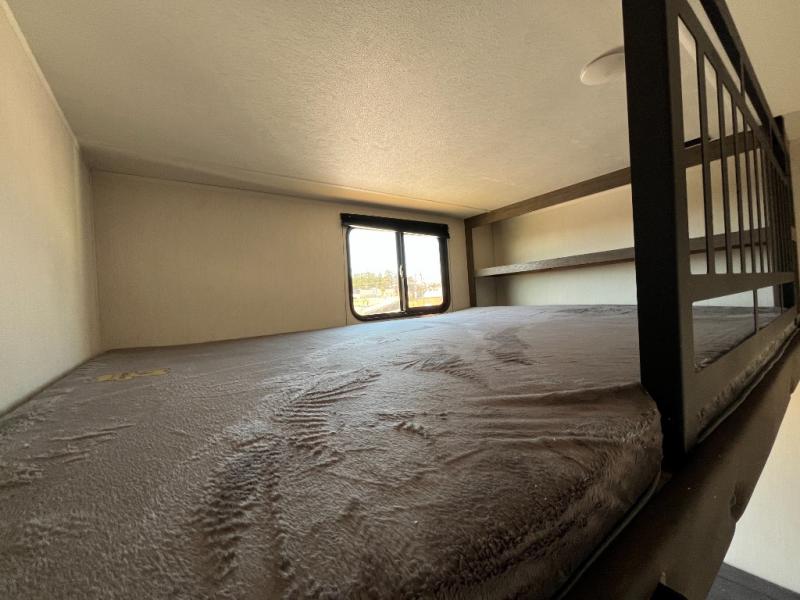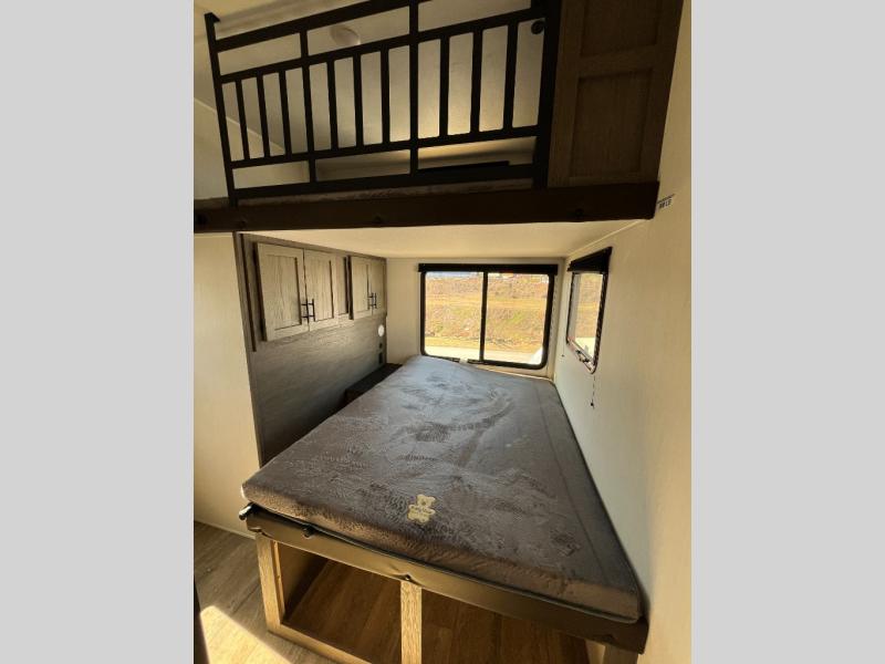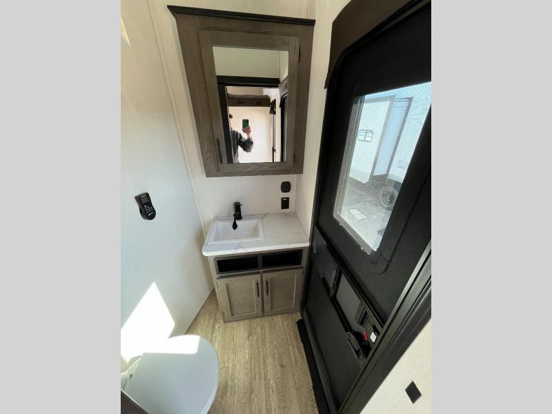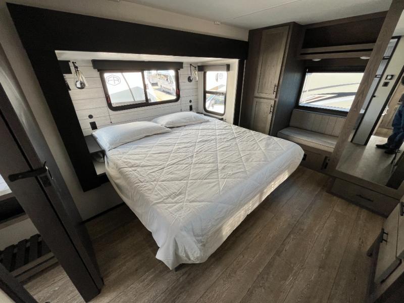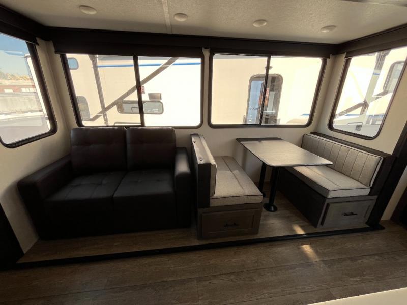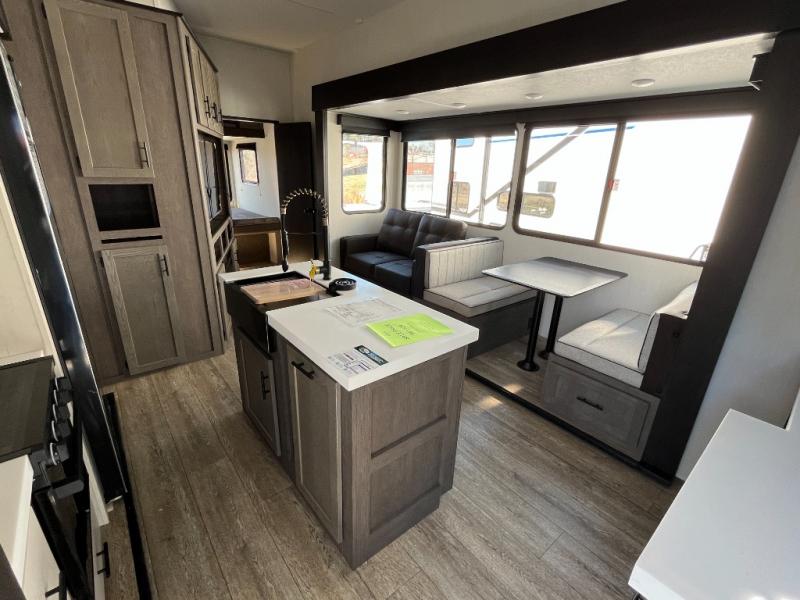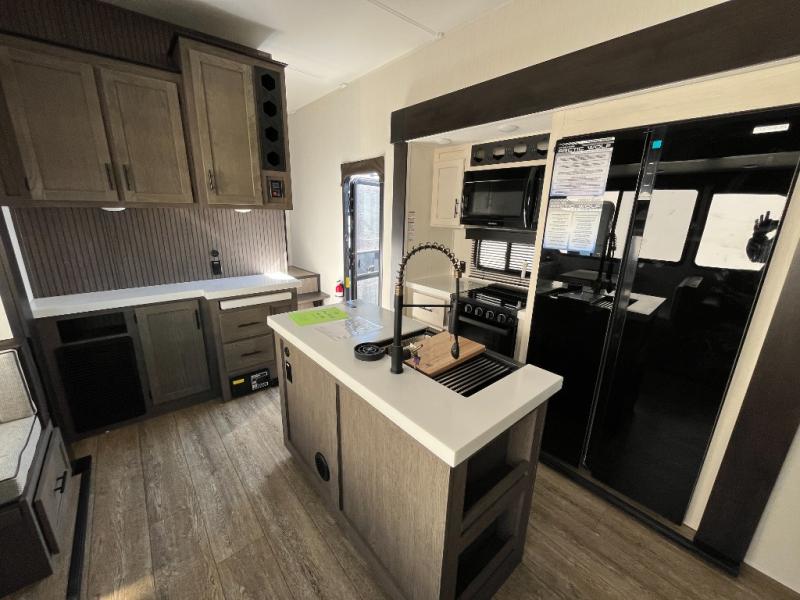 This Cherokee Arctic Wolf Suite fifth wheel is an excellent choice if you have a large family that wants to get away! Not only is there a private bedroom up front for you, but there is also a bedroom suite in the back. This suite has a 54" x 74" bed, a 60" x 80" loft bed, a TV area, a half bathroom all to itself, and the second exterior entry door. What a space! You'll also be highly impressed with the living area because it has a large slide that holds the tri-fold sofa and dinette. The large pantry is another feature you'll appreciate since it can store all of the food needed to feed your group, and the outside kitchen is an added bonus the cook will love!