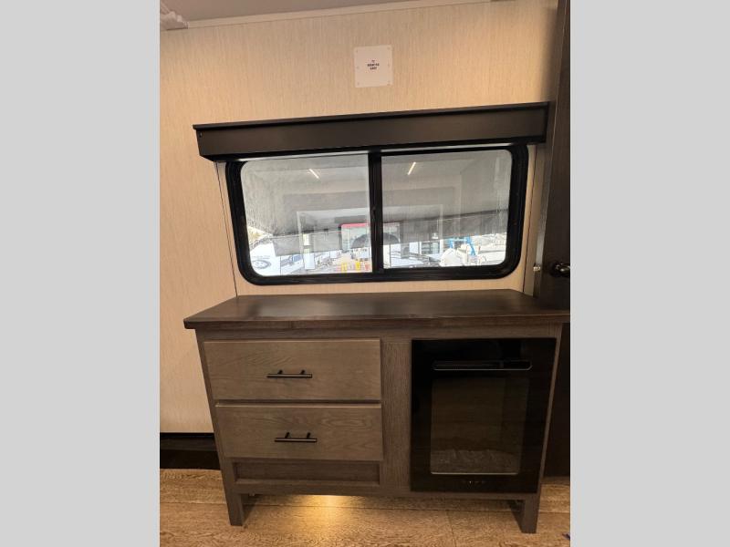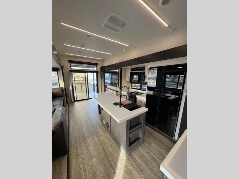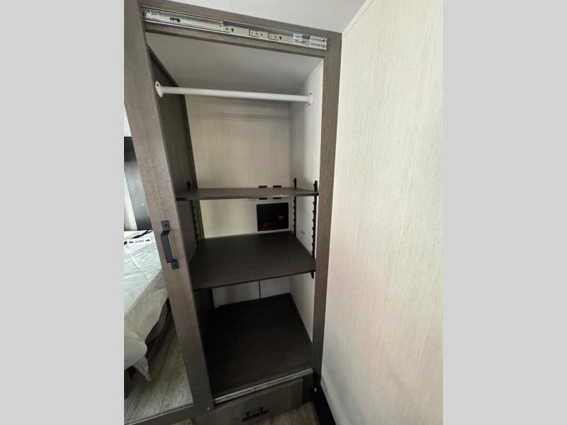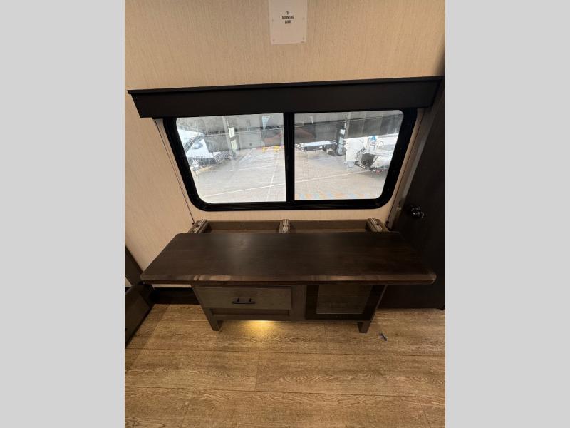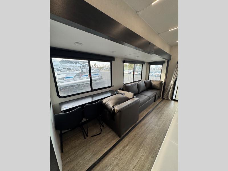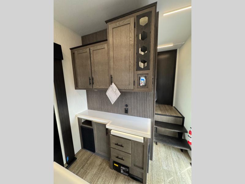You're going to love camping in this triple slide out fifth wheel that is packed with amenities! The rear deck with a covered patio will provide a place to visit with campground neighbors, and inside, there is an L-shaped tri-fold sofa where guests can sleep. You'll find a king bed slide in the front master bedroom for you, along with a front bench seat, a bedroom fireplace, plus washer and dryer prep if you choose to add these appliances. The kitchen is any chef's dream with its large island with two chairs, pull-out countertop extension, spacious 16 cu. ft. refrigerator, plus a hidden pantry behind the TV for all the dry goods.
