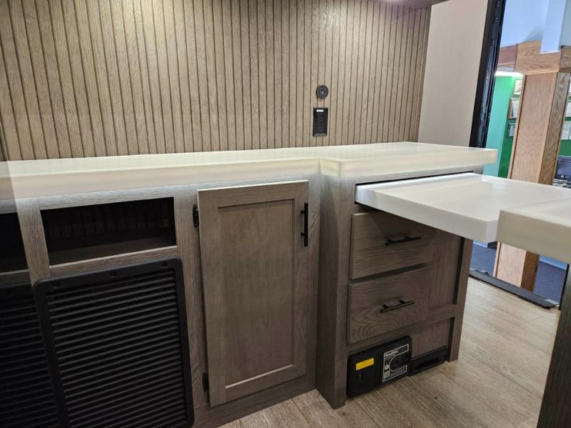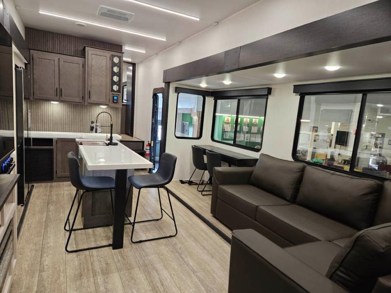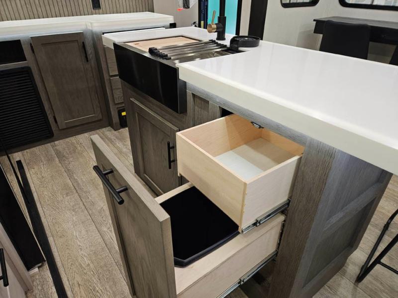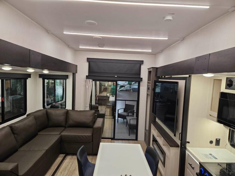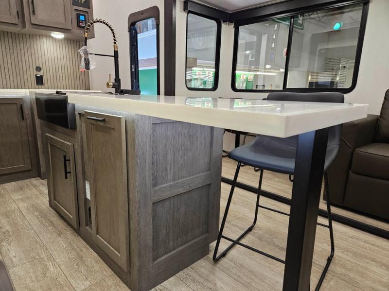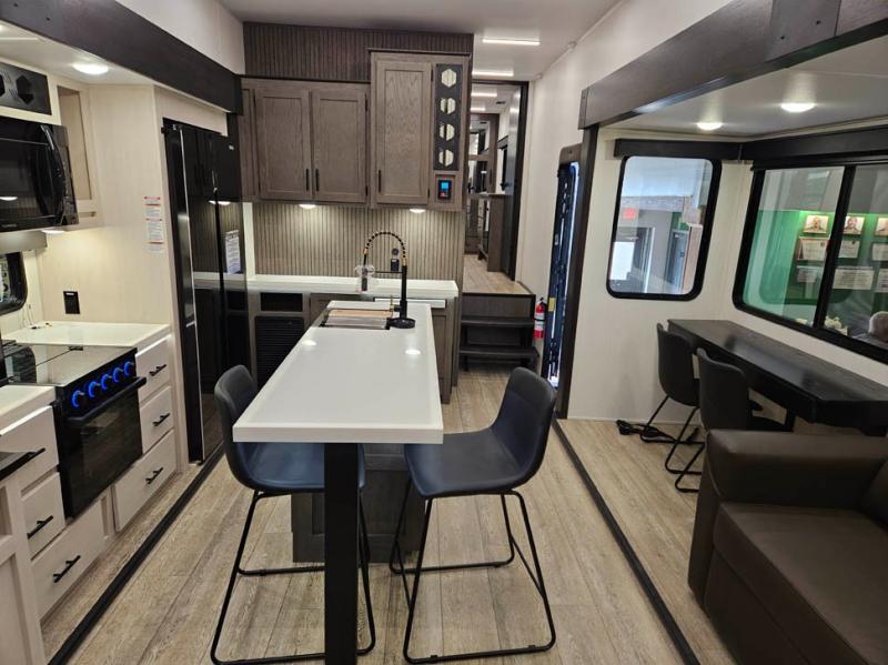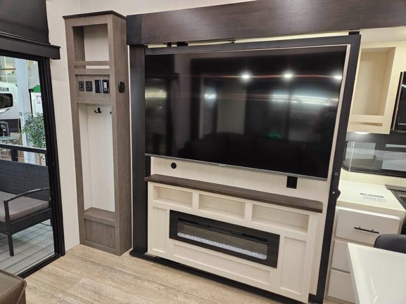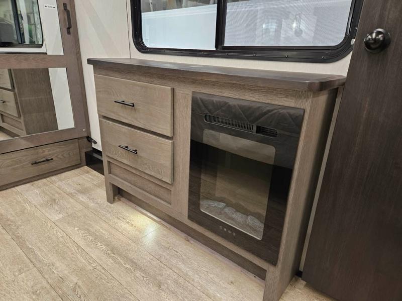 You're going to love camping in this triple slide out fifth wheel that is packed with amenities! The rear deck with a covered patio will provide a place to visit with campground neighbors, and inside, there is an L-shaped tri-fold sofa where guests can sleep. You'll find a king bed slide in the front master bedroom for you, along with a front bench seat, a bedroom fireplace, plus washer and dryer prep if you choose to add these appliances. The kitchen is any chef's dream with its large island with two chairs, pull-out countertop extension, spacious 16 cu. ft. refrigerator, plus a hidden pantry behind the TV for all the dry goods.