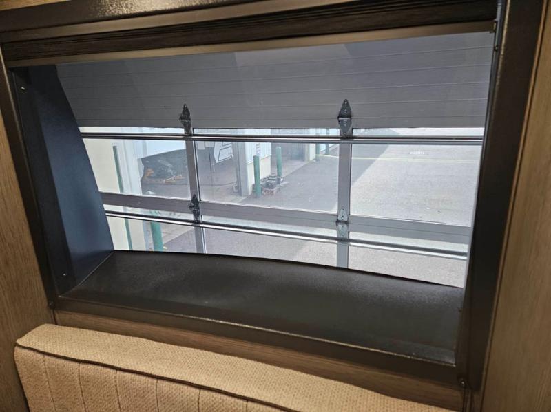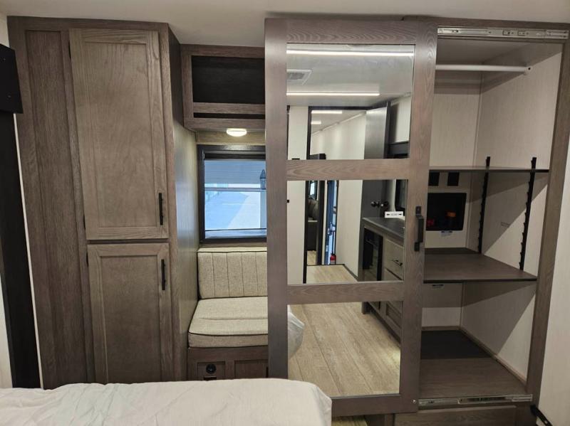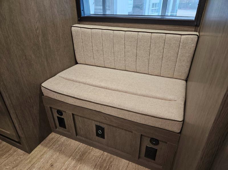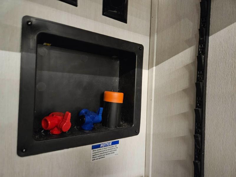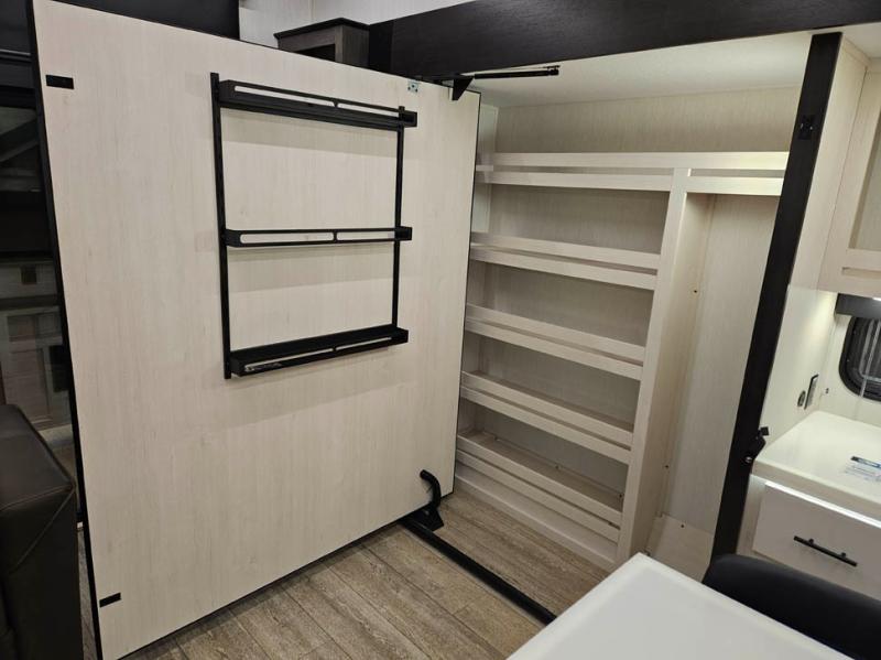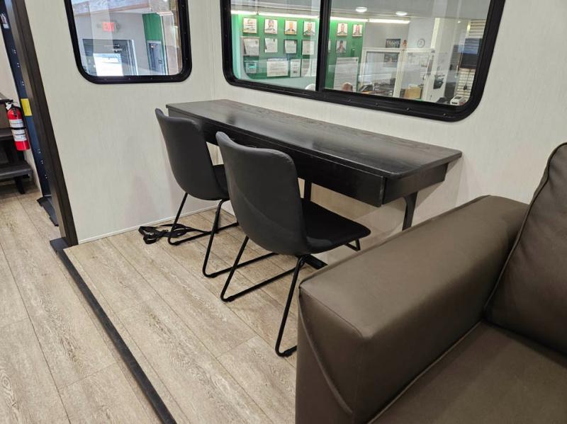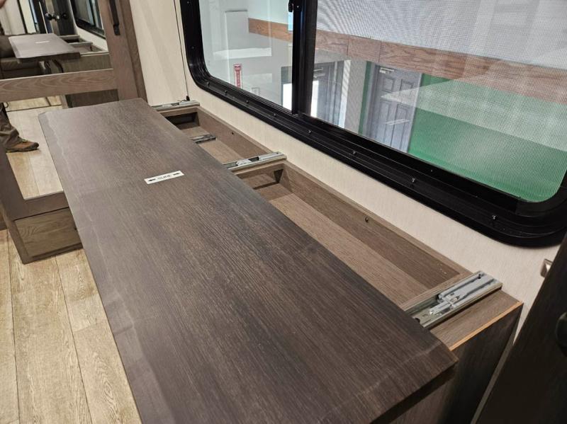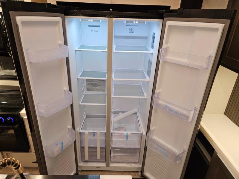 You're going to love camping in this triple slide out fifth wheel that is packed with amenities! The rear deck with a covered patio will provide a place to visit with campground neighbors, and inside, there is an L-shaped tri-fold sofa where guests can sleep. You'll find a king bed slide in the front master bedroom for you, along with a front bench seat, a bedroom fireplace, plus washer and dryer prep if you choose to add these appliances. The kitchen is any chef's dream with its large island with two chairs, pull-out countertop extension, spacious 16 cu. ft. refrigerator, plus a hidden pantry behind the TV for all the dry goods.