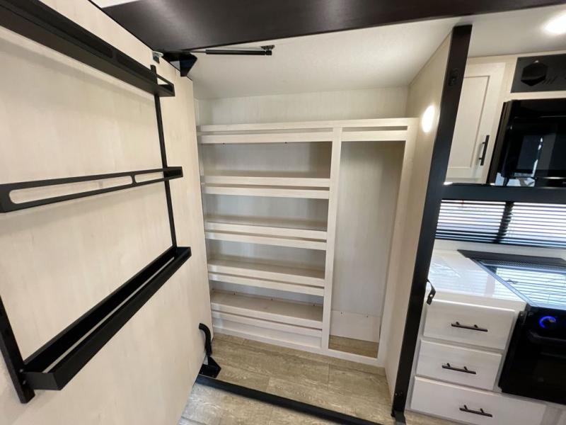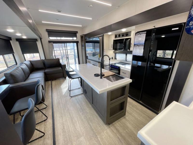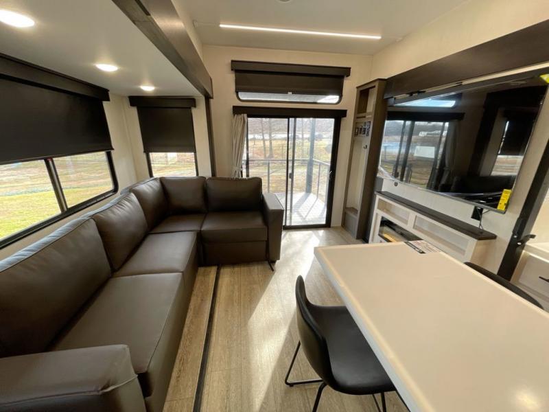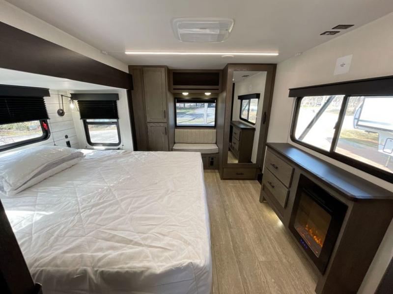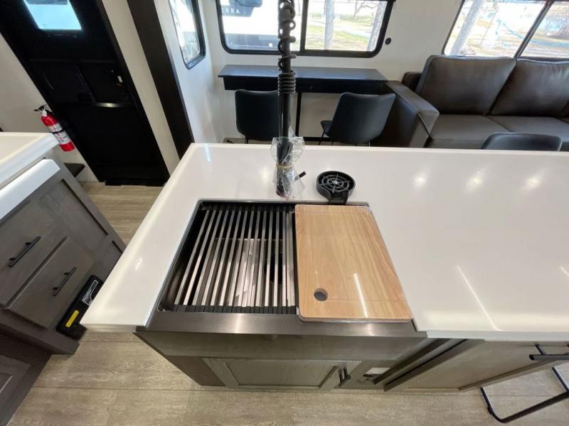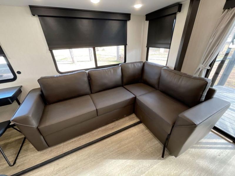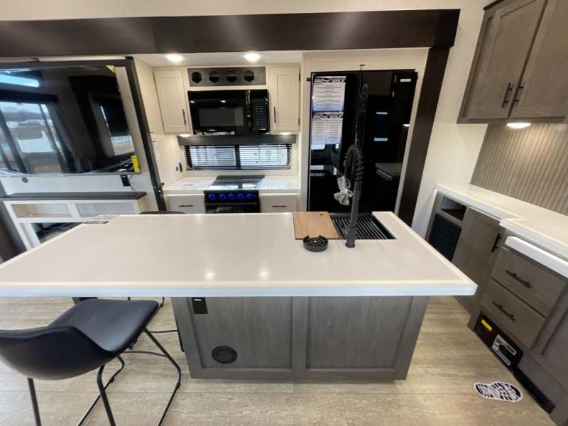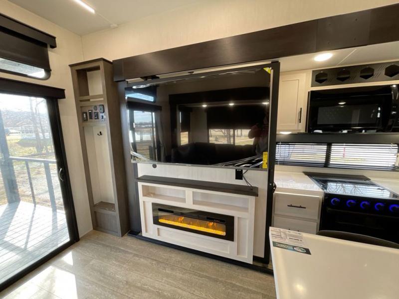 You're going to love camping in this triple slide out fifth wheel that is packed with amenities! The rear deck with a covered patio will provide a place to visit with campground neighbors, and inside, there is an L-shaped tri-fold sofa where guests can sleep. You'll find a king bed slide in the front master bedroom for you, along with a front bench seat, a bedroom fireplace, plus washer and dryer prep if you choose to add these appliances. The kitchen is any chef's dream with its large island with two chairs, pull-out countertop extension, spacious 16 cu. ft. refrigerator, plus a hidden pantry behind the TV for all the dry goods.