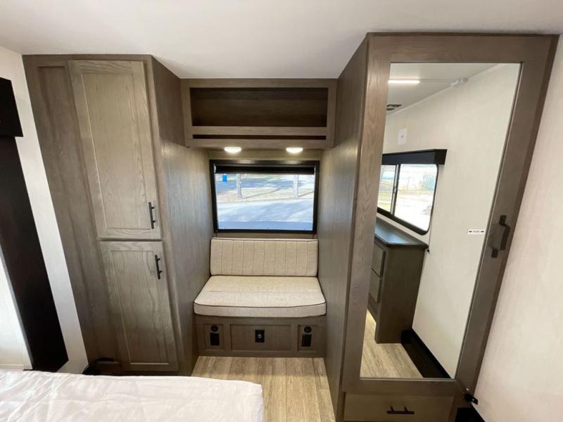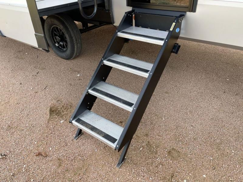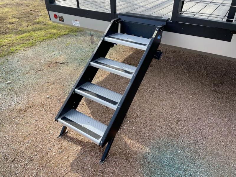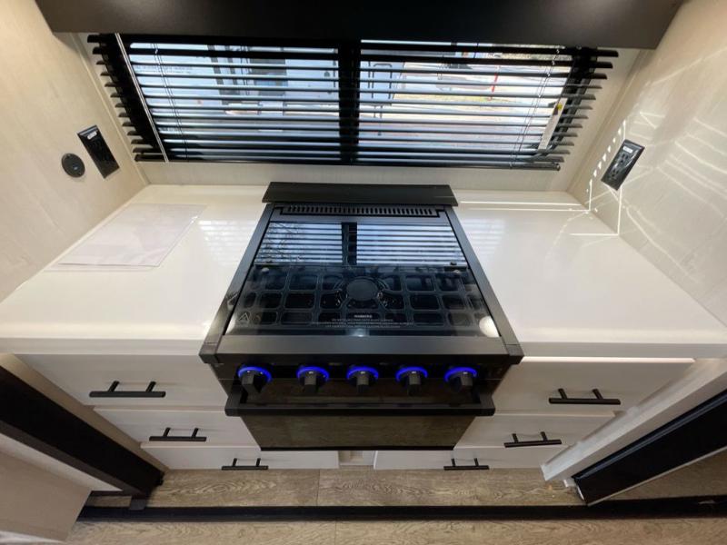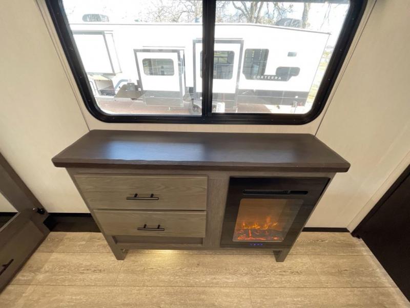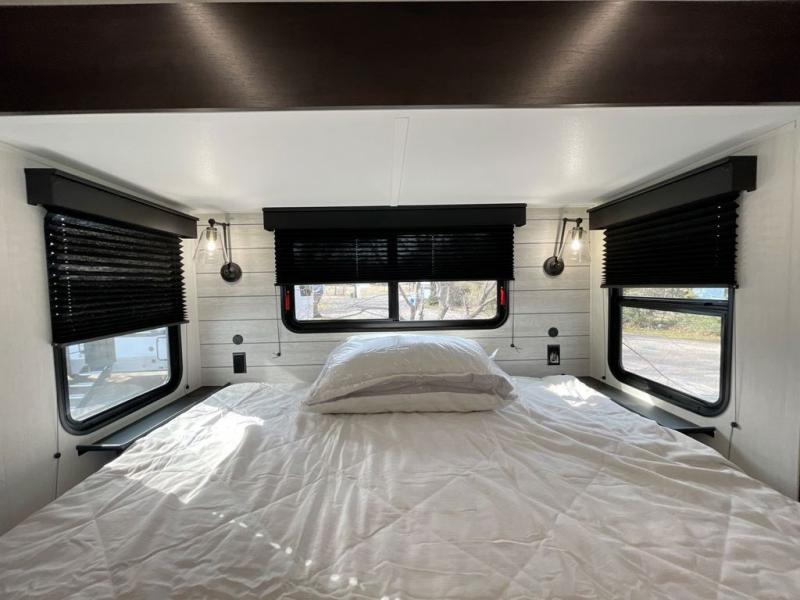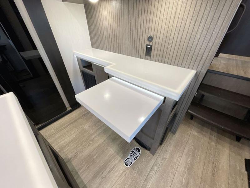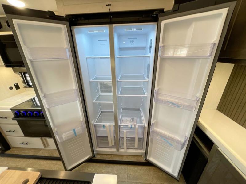You're going to love camping in this triple slide out fifth wheel that is packed with amenities! The rear deck with a covered patio will provide a place to visit with campground neighbors, and inside, there is an L-shaped tri-fold sofa where guests can sleep. You'll find a king bed slide in the front master bedroom for you, along with a front bench seat, a bedroom fireplace, plus washer and dryer prep if you choose to add these appliances. The kitchen is any chef's dream with its large island with two chairs, pull-out countertop extension, spacious 16 cu. ft. refrigerator, plus a hidden pantry behind the TV for all the dry goods.