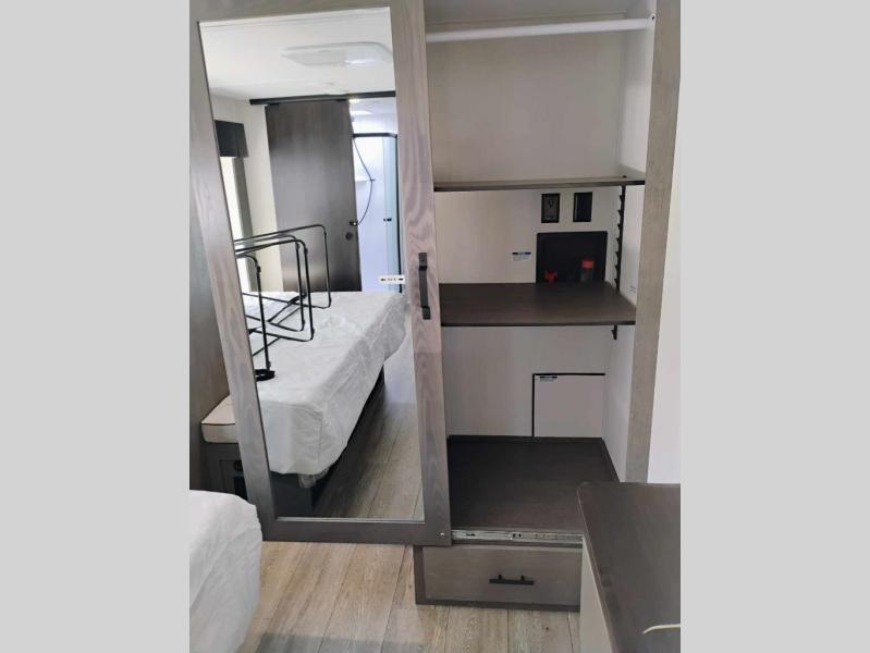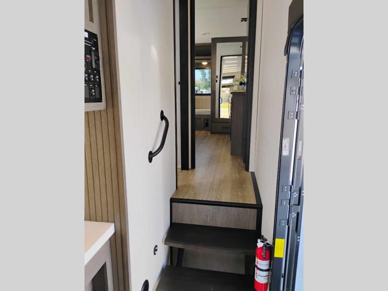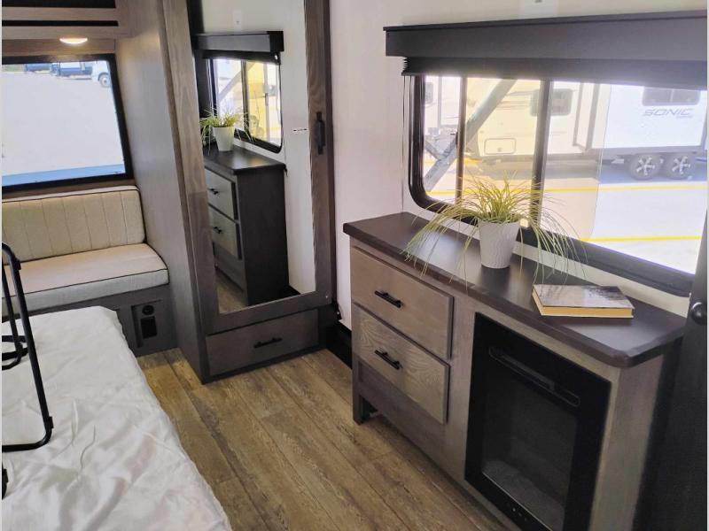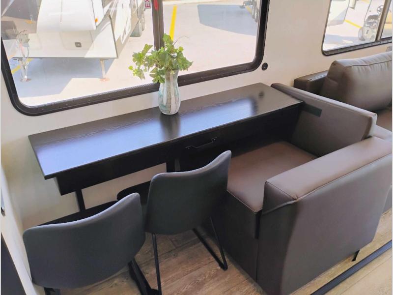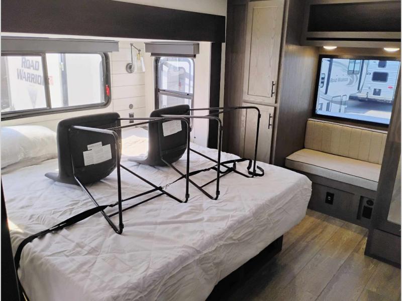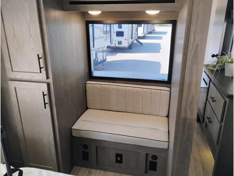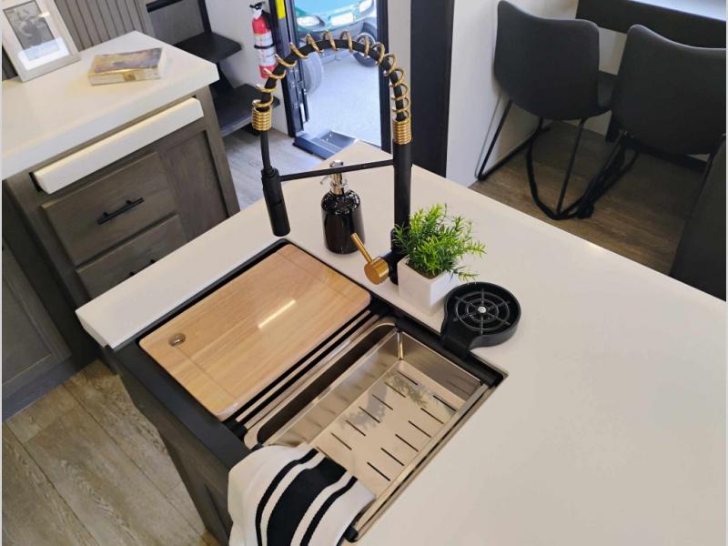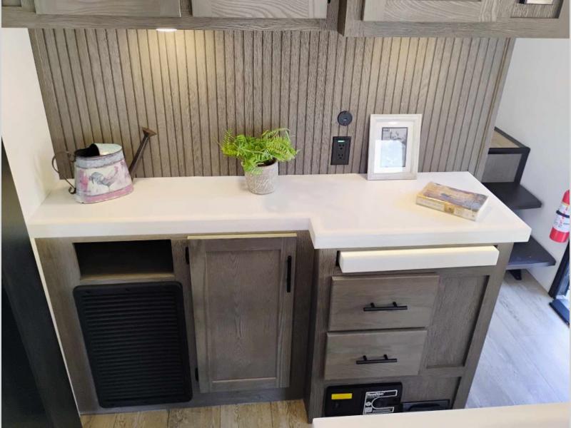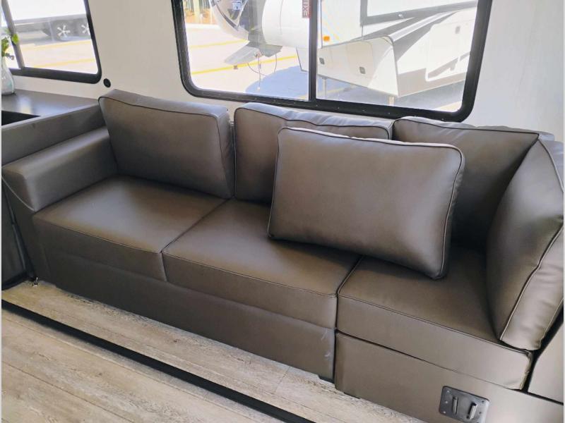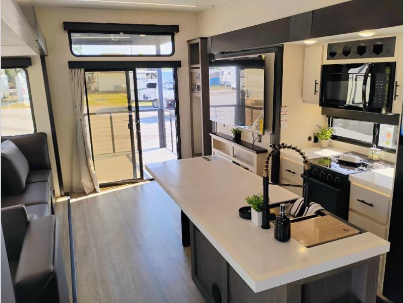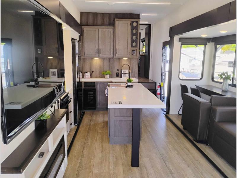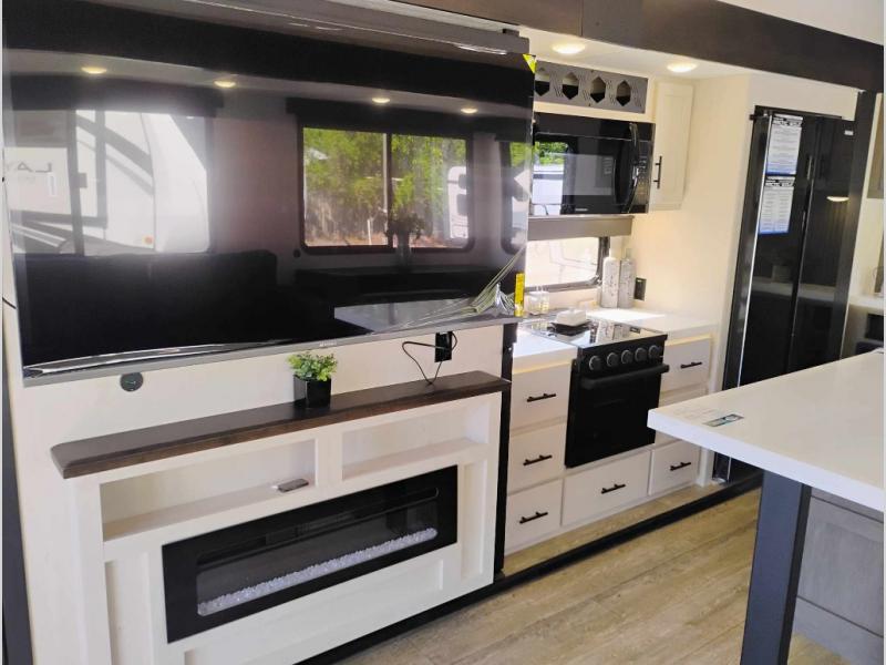 You're going to love camping in this triple slide out fifth wheel that is packed with amenities! The rear deck with a covered patio will provide a place to visit with campground neighbors, and inside, there is an L-shaped tri-fold sofa where guests can sleep. You'll find a king bed slide in the front master bedroom for you, along with a front bench seat, a bedroom fireplace, plus washer and dryer prep if you choose to add these appliances. The kitchen is any chef's dream with its large island with two chairs, pull-out countertop extension, spacious 16 cu. ft. refrigerator, plus a hidden pantry behind the TV for all the dry goods.