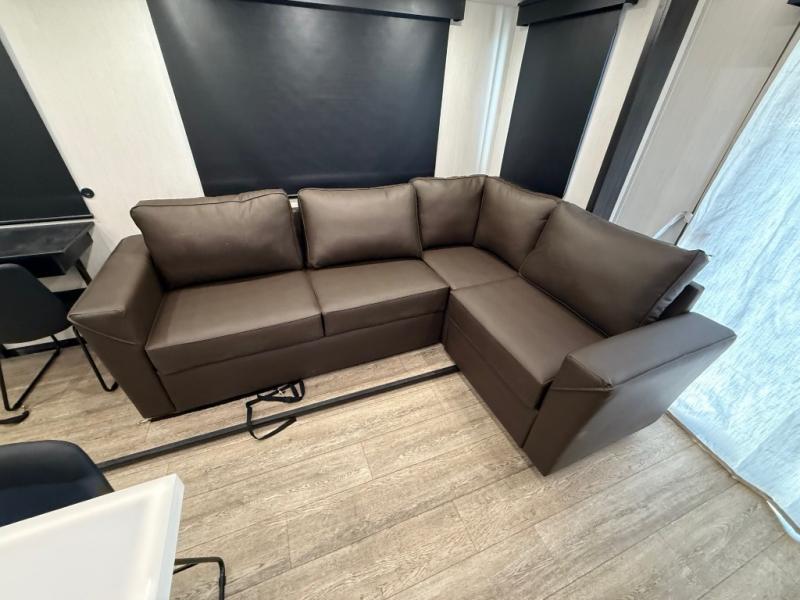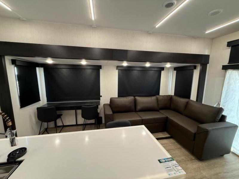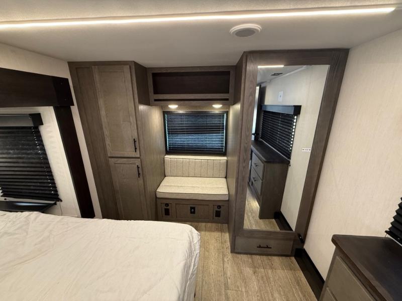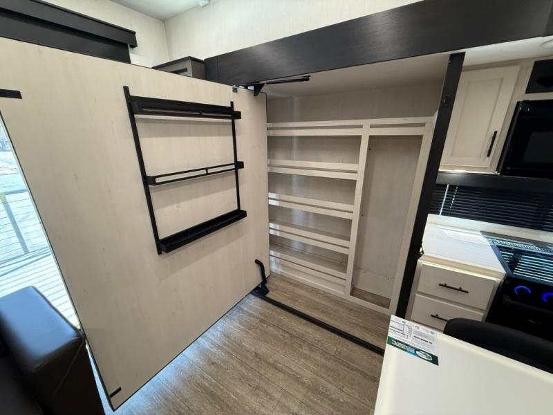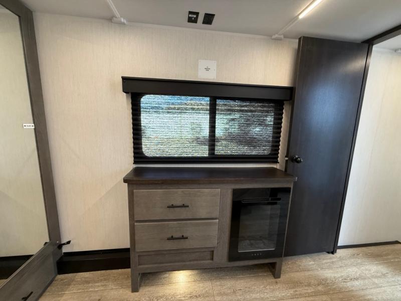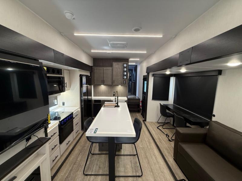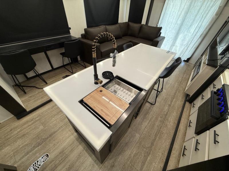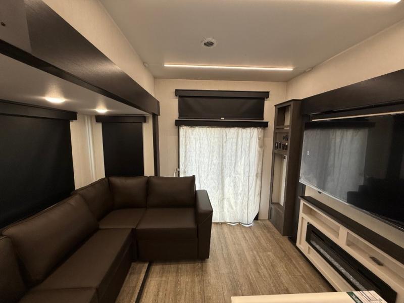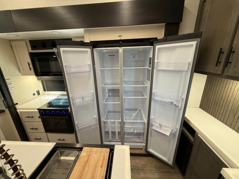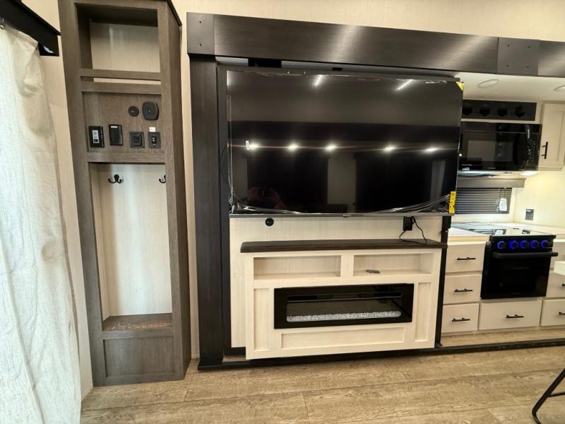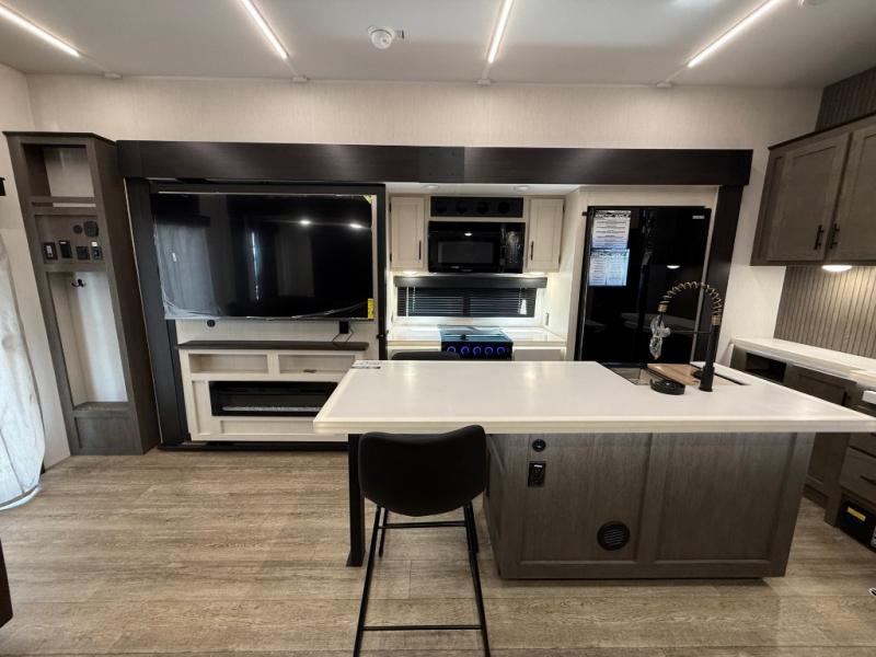 You're going to love camping in this triple slide out fifth wheel that is packed with amenities! The rear deck with a covered patio will provide a place to visit with campground neighbors, and inside, there is an L-shaped tri-fold sofa where guests can sleep. You'll find a king bed slide in the front master bedroom for you, along with a front bench seat, a bedroom fireplace, plus washer and dryer prep if you choose to add these appliances. The kitchen is any chef's dream with its large island with two chairs, pull-out countertop extension, spacious 16 cu. ft. refrigerator, plus a hidden pantry behind the TV for all the dry goods.