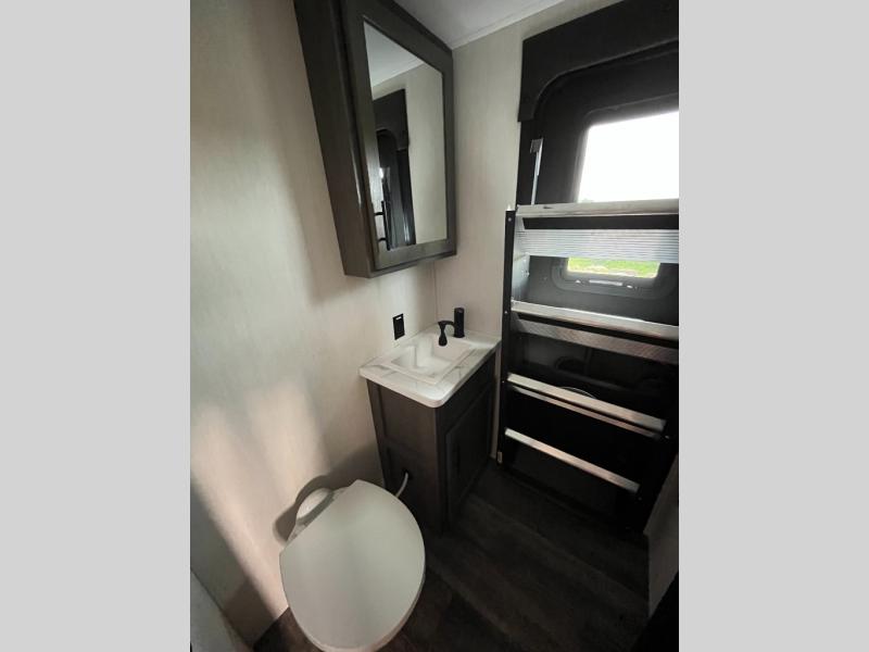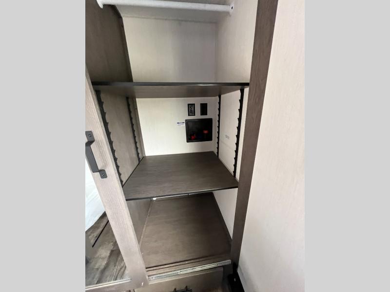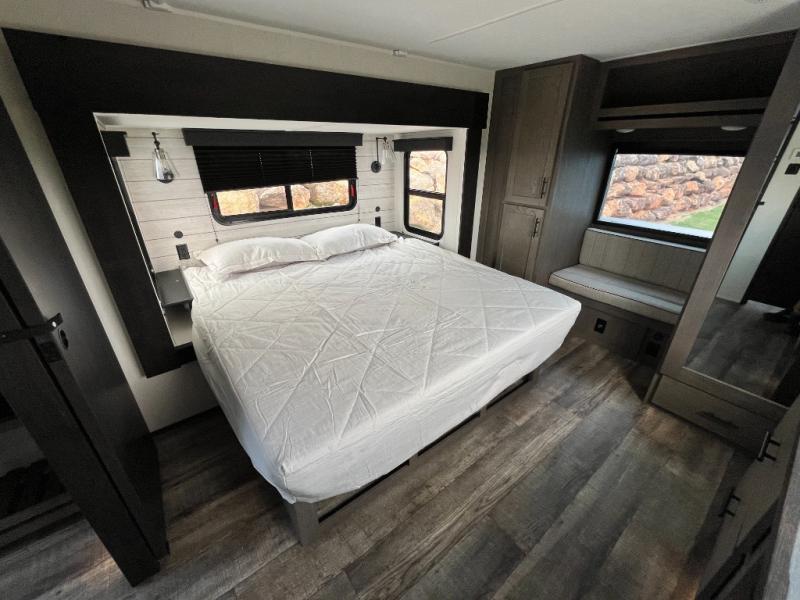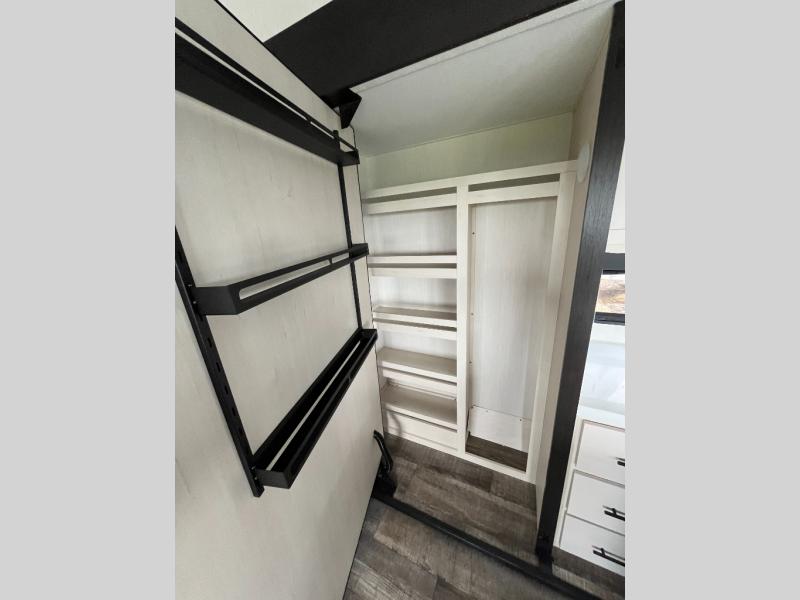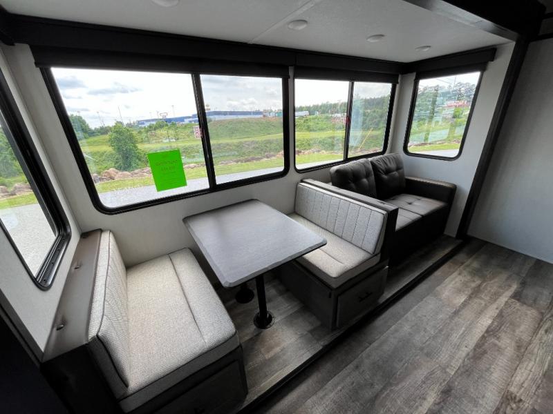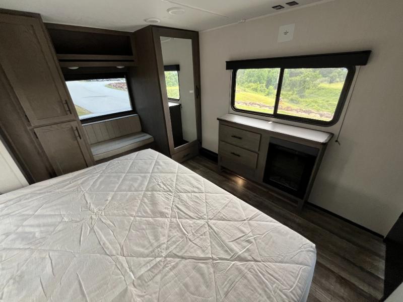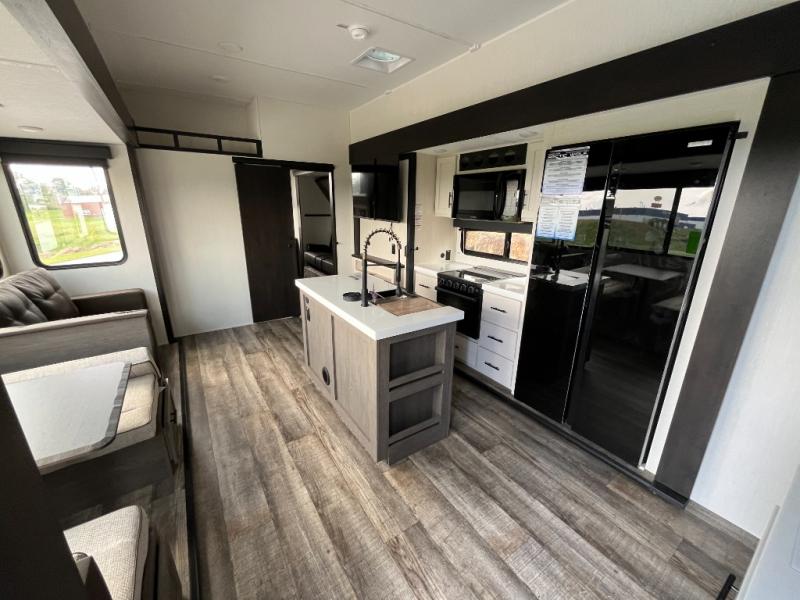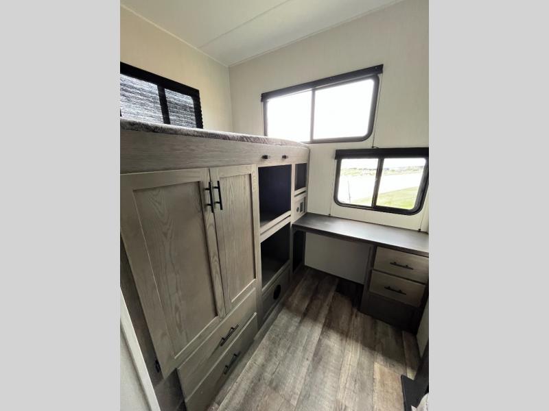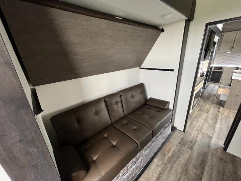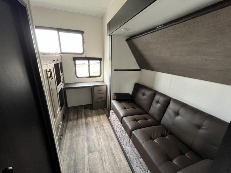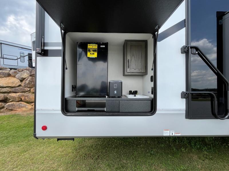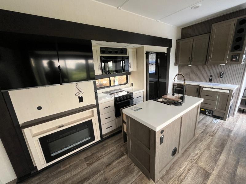 You can't beat this dual entry fifth wheel packed with luxury amenities! Your guests will love the rear private bunkhouse which maximizes sleeping capacity with a 28" x 72" bunk, 54" x 74" bunk, and jack knife sofa with a trundle! This room also has its own full bath with an exterior entry door for ultimate convenience. Up front you will find a luxurious master bedroom, with a king bed slide, fireplace, wardrobe with a sun bench, and washer/dryer prep. The full bath here features a radius shower and plenty of storage. The main kitchen and living area includes dual opposing slides, a tri-fold sofa across from the fireplace, and a dinette. The kitchen includes a 16 cu. ft. 12V residential refrigerator, a hutch, and a pantry for storage as well. Head outdoors to enjoy the exterior griddle and two exterior awnings, plus the pass-through storage!