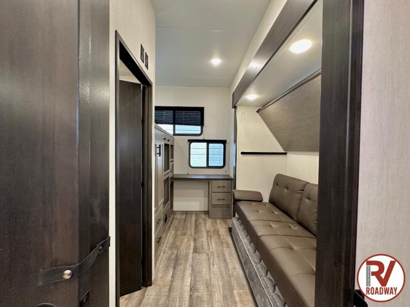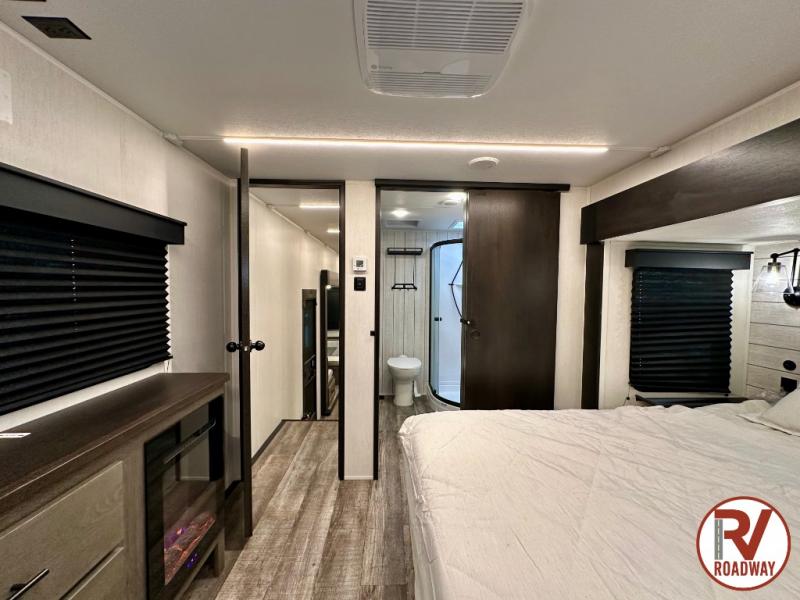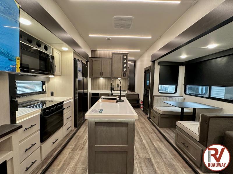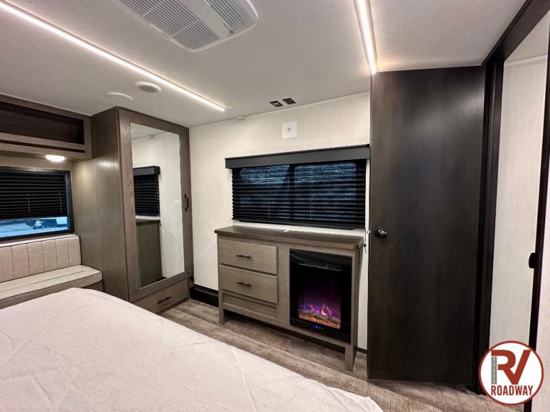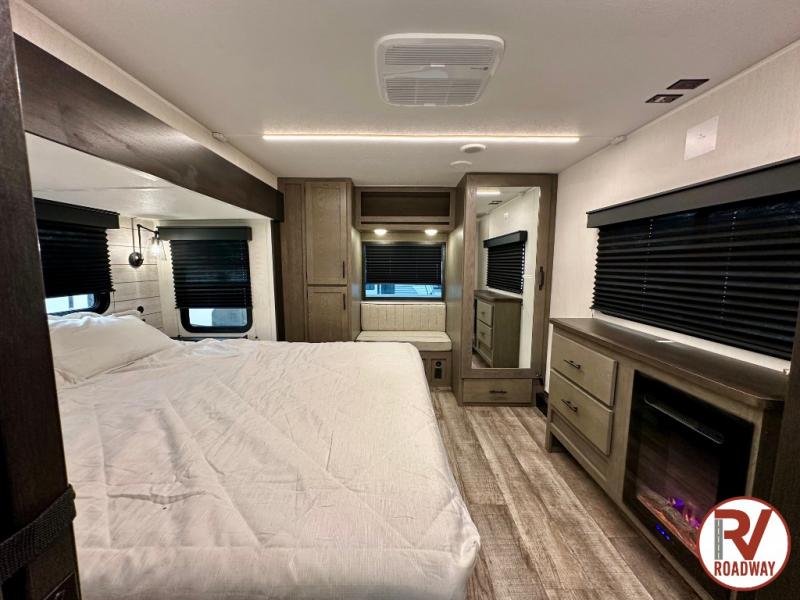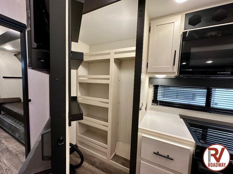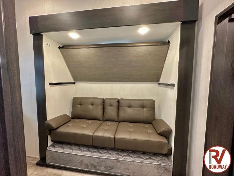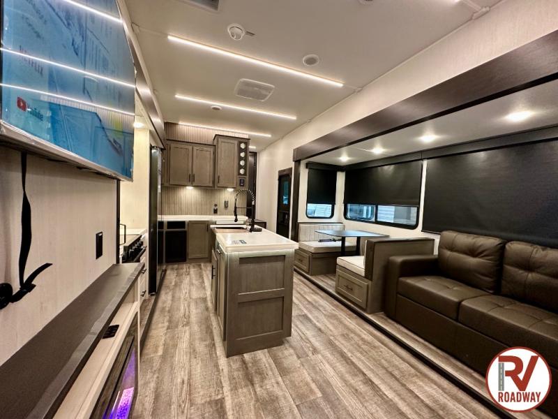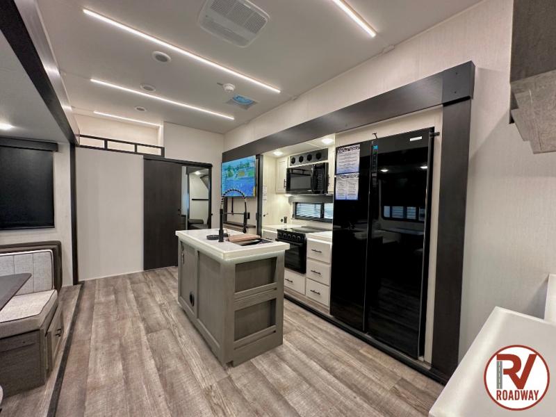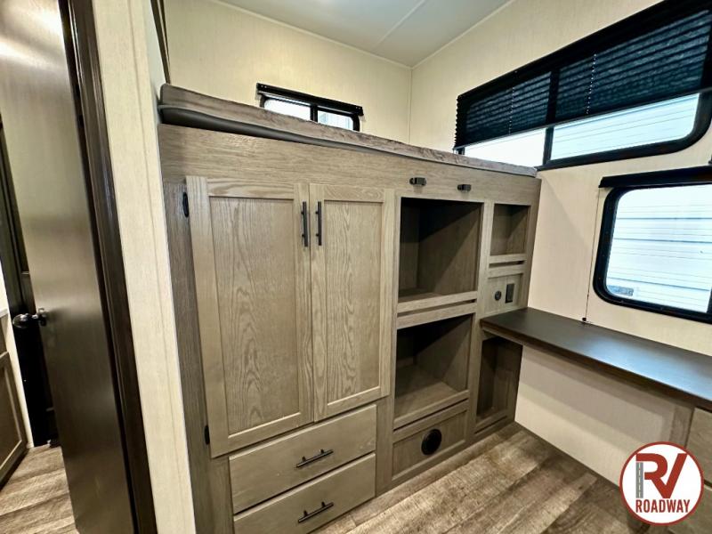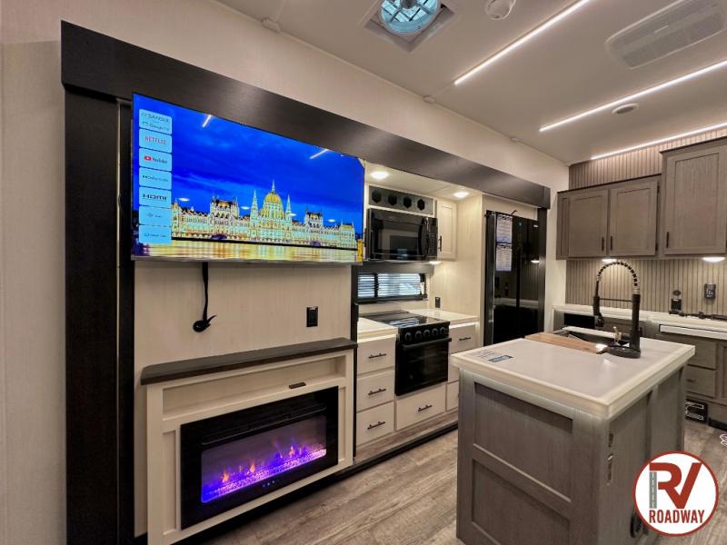 You can't beat this dual entry fifth wheel packed with luxury amenities! Your guests will love the rear private bunkhouse which maximizes sleeping capacity with a 28" x 72" bunk, 54" x 74" bunk, and jack knife sofa with a trundle! This room also has its own full bath with an exterior entry door for ultimate convenience. Up front you will find a luxurious master bedroom, with a king bed slide, fireplace, wardrobe with a sun bench, and washer/dryer prep. The full bath here features a radius shower and plenty of storage. The main kitchen and living area includes dual opposing slides, a tri-fold sofa across from the fireplace, and a dinette. The kitchen includes a 16 cu. ft. 12V residential refrigerator, a hutch, and a pantry for storage as well. Head outdoors to enjoy the exterior griddle and two exterior awnings, plus the pass-through storage!